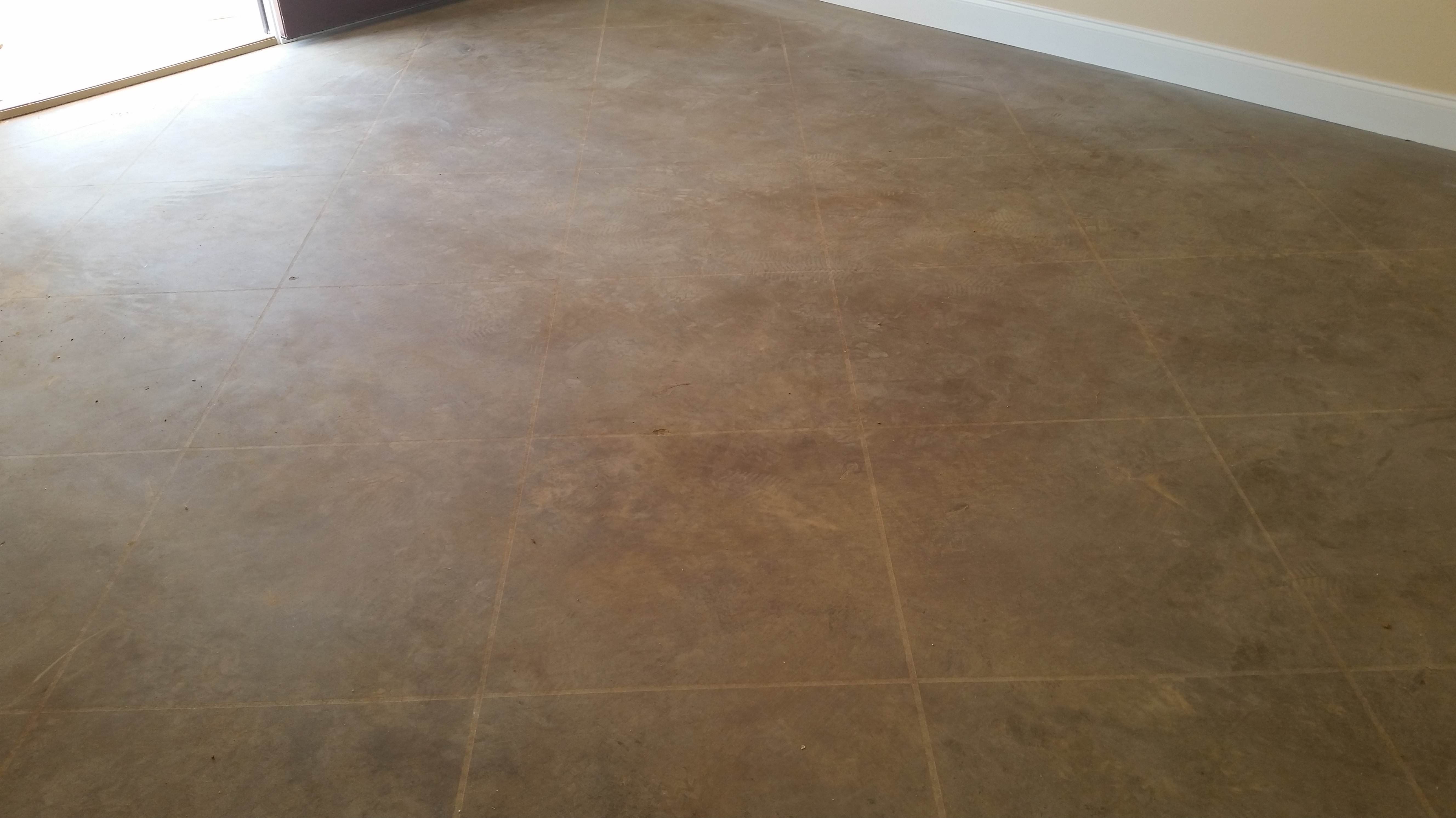 Our stained concrete guys removed the covering from the floor this morning. We still can’t tell what it will look like since it’s not sealed and lots of dust remains even after a good sweeping. It’s nice to be able to look at flooring instead