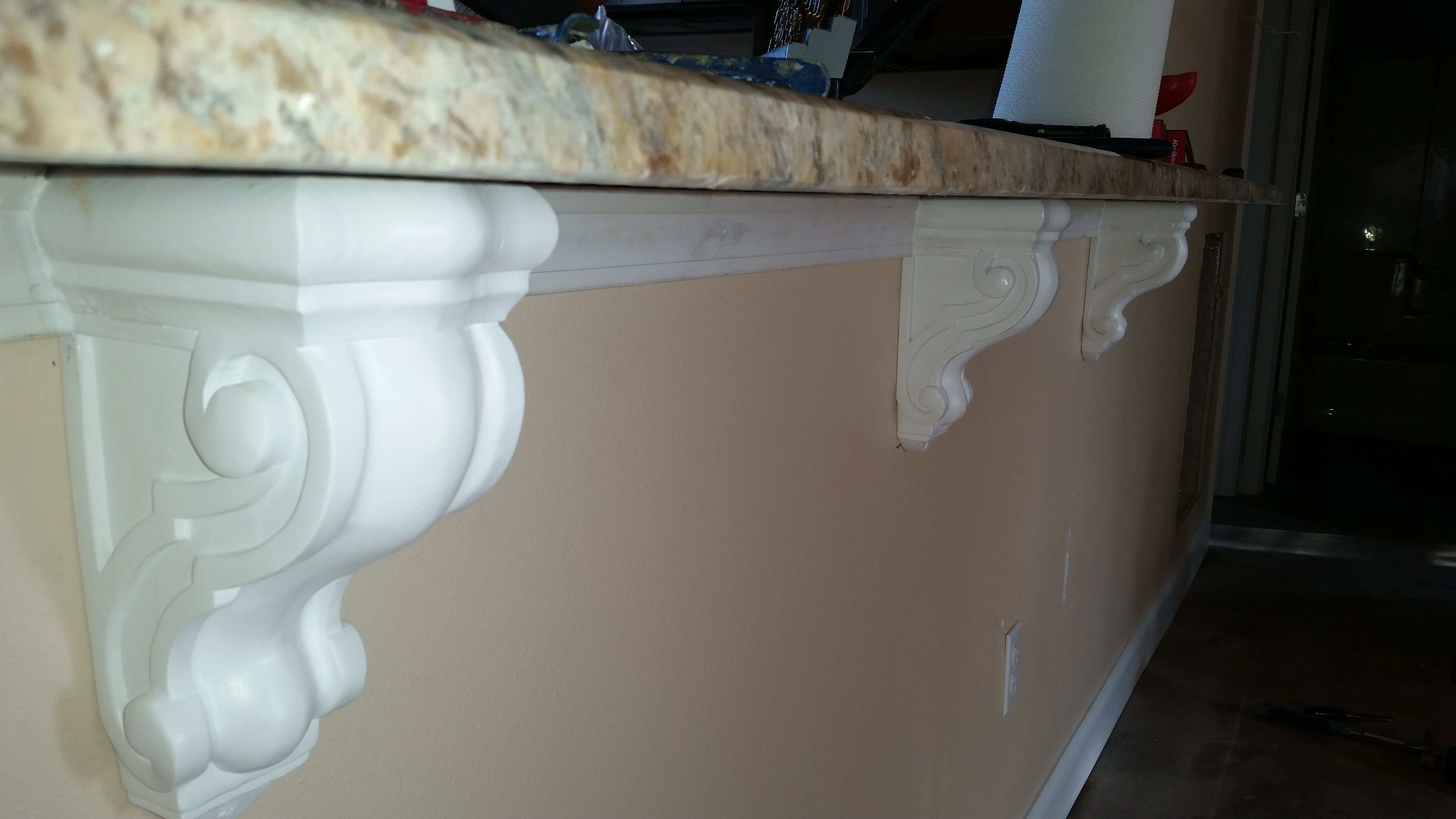 Roy installed the decorative wood supports under the breakfast bar. After finding out that the studs weren’t where the original pictures showed they were, Roy made some adjustments to get them spaced properly. This is something that I did a lot of research to see what I’d like it to look like and I think what Roy came up with is perfect. The molding behind them is not painted yet.