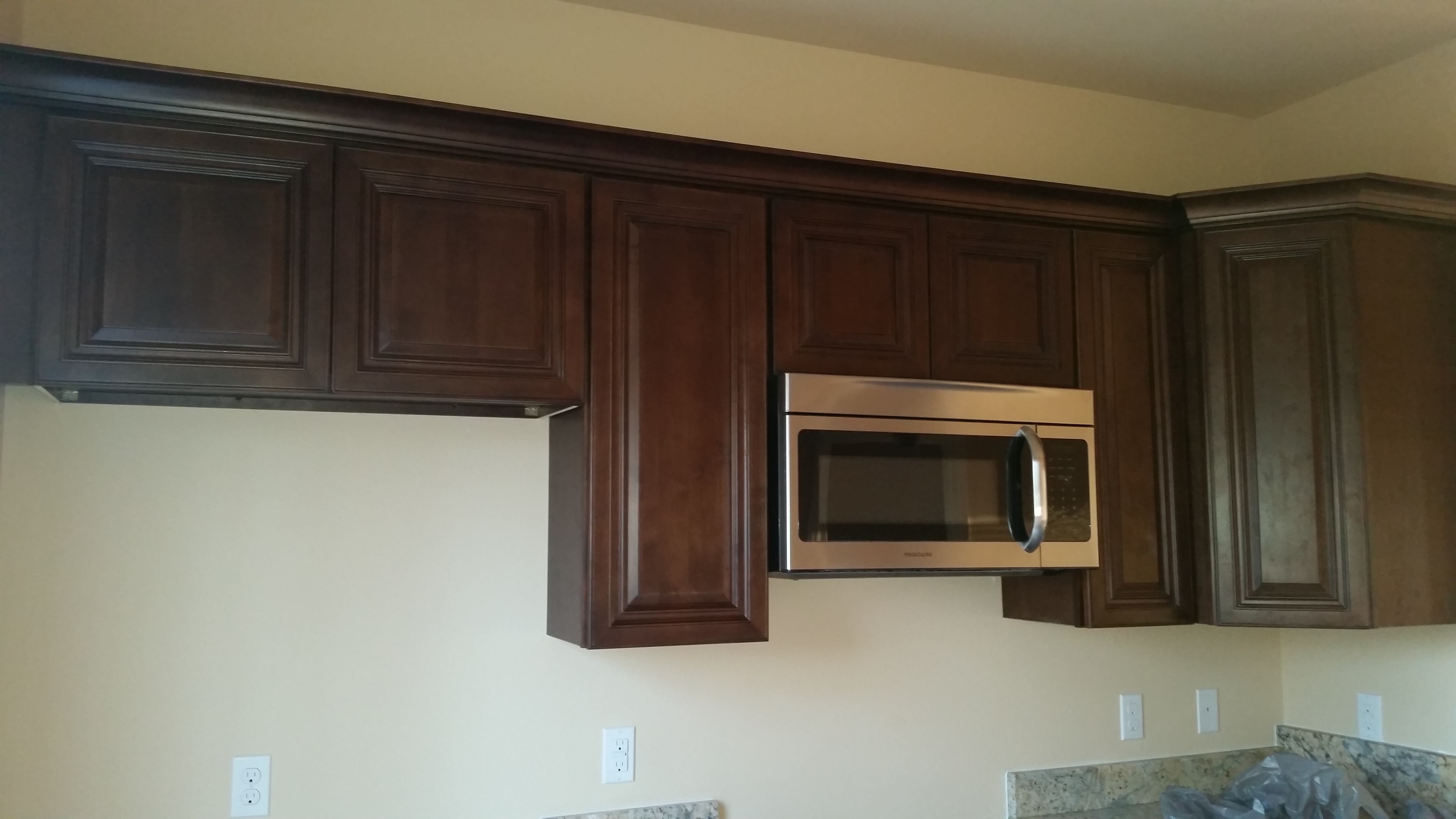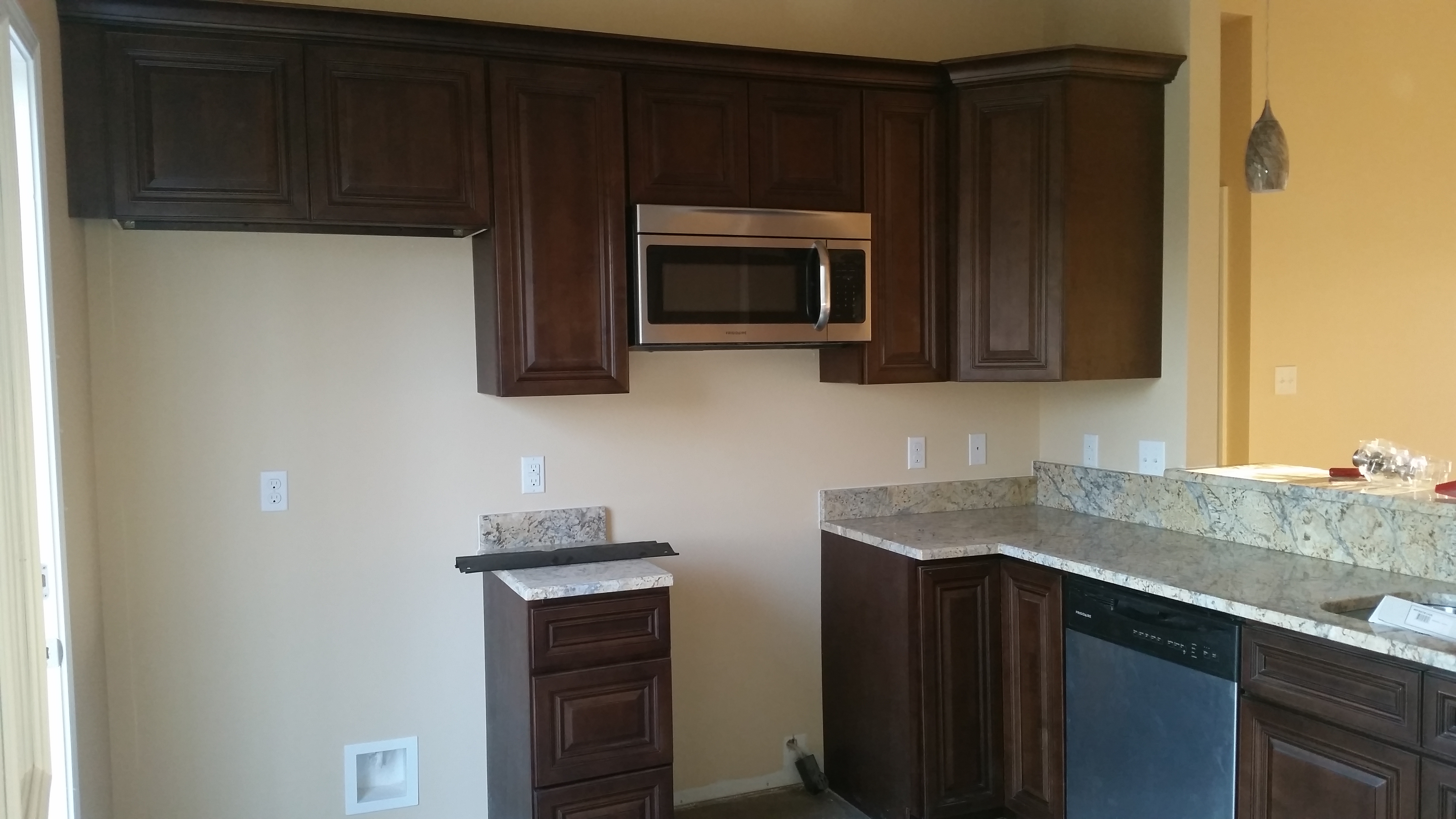 Saturday, March 7, 2015 – FINALLY the counter tops and cabinets are finished being installed and we are happy with them. The crown molding was installed today and the door that was hinged on the right is now hinged on the left. We’ve paid them in full and are happy to have that behind us. This was the only part of the construction part where we chose who to buy from, all the rest were Ronnie’s usual subcontractors. This was the only part that we had problems with. The end result we’re happy with, just getting them to correct all the things they did wrong, along with them NEVER, not once, showing up when they were suppose to, added to a huge communication barrier because of them being Chinese and not speaking much English, was a PAIN!