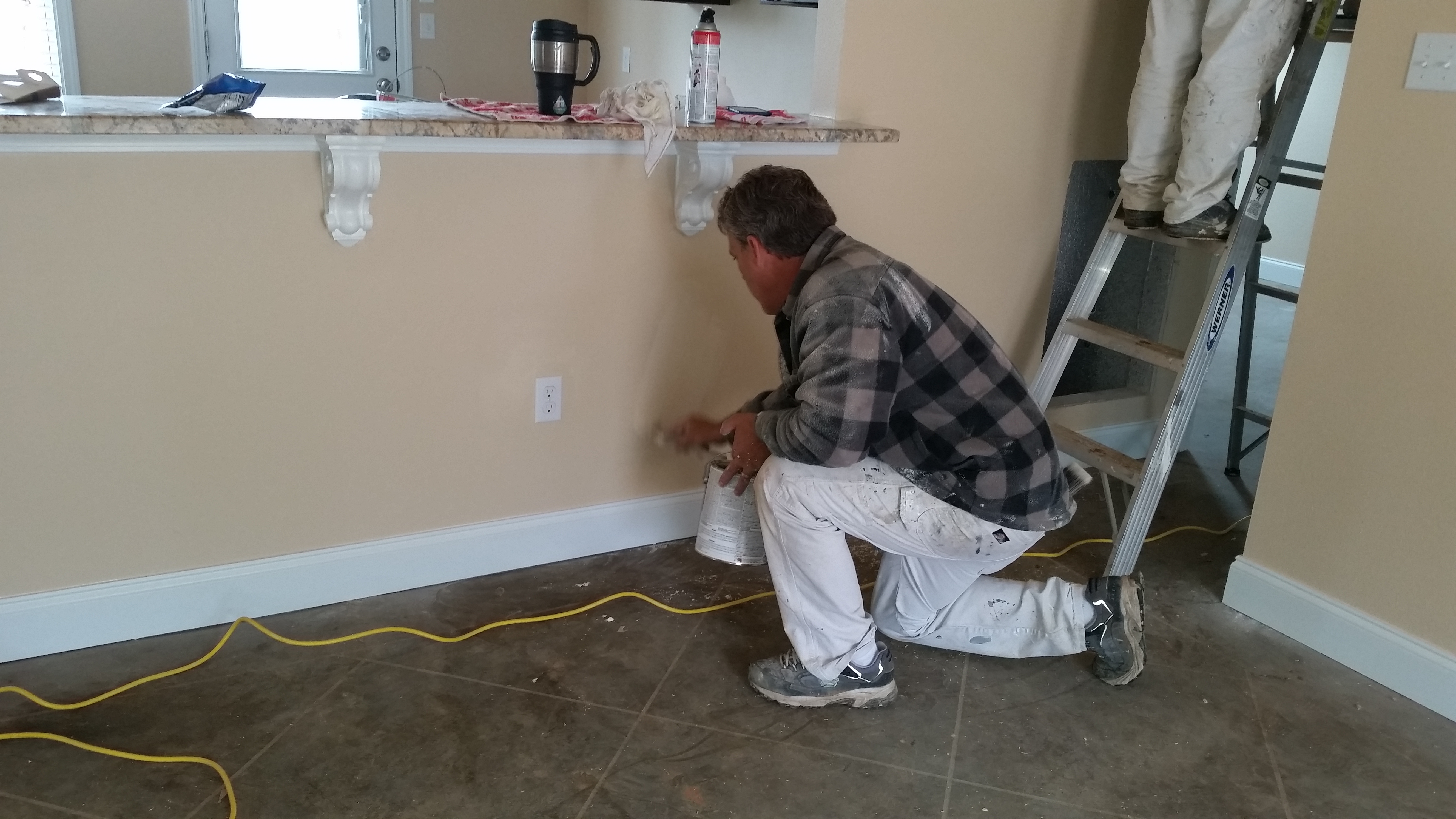 Here’s Toxey Koehn, 985-634-8856 our painter and his assistant Chris, painting the window headers and touching up what others nicked, dinged, or gouged!