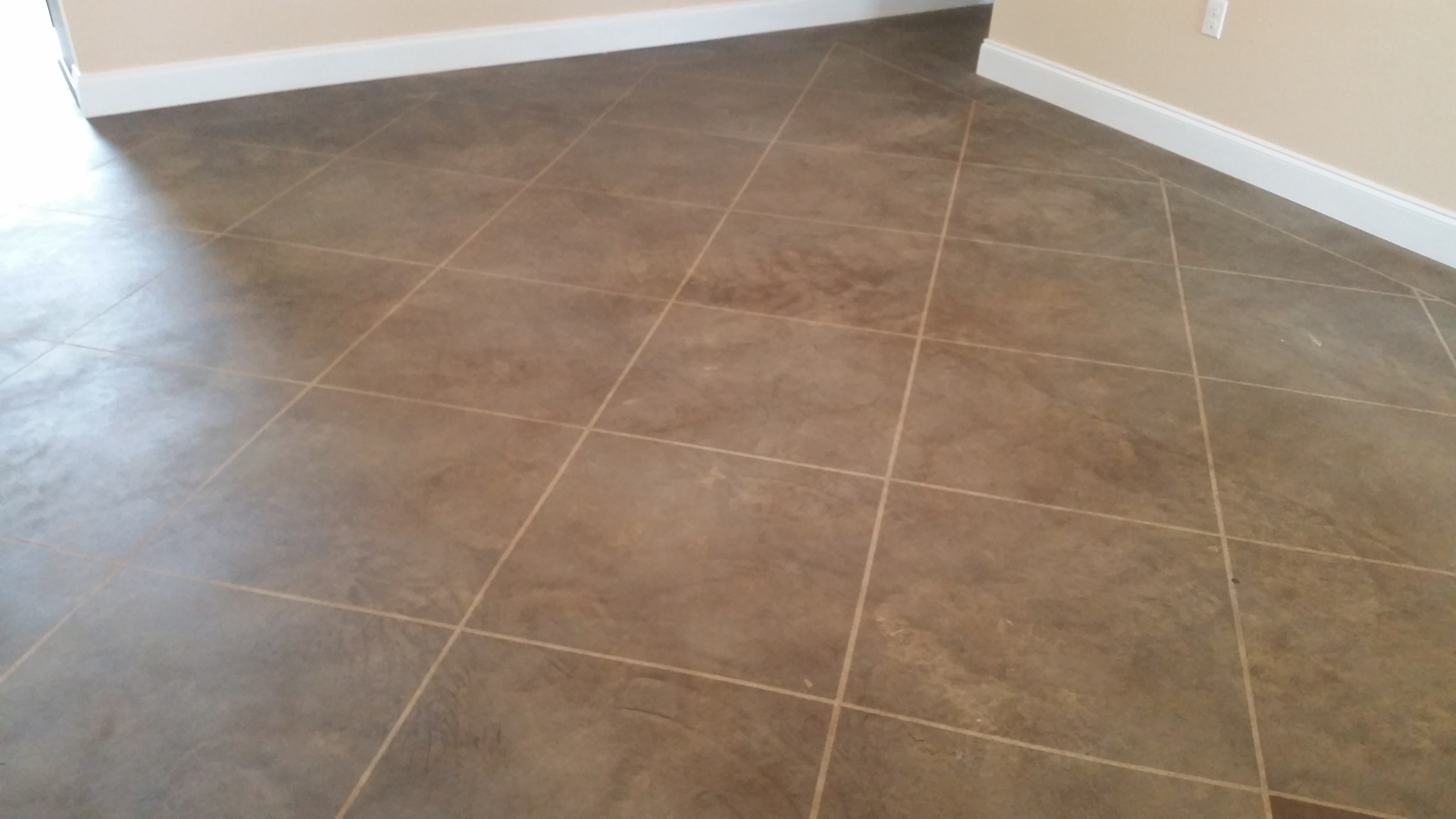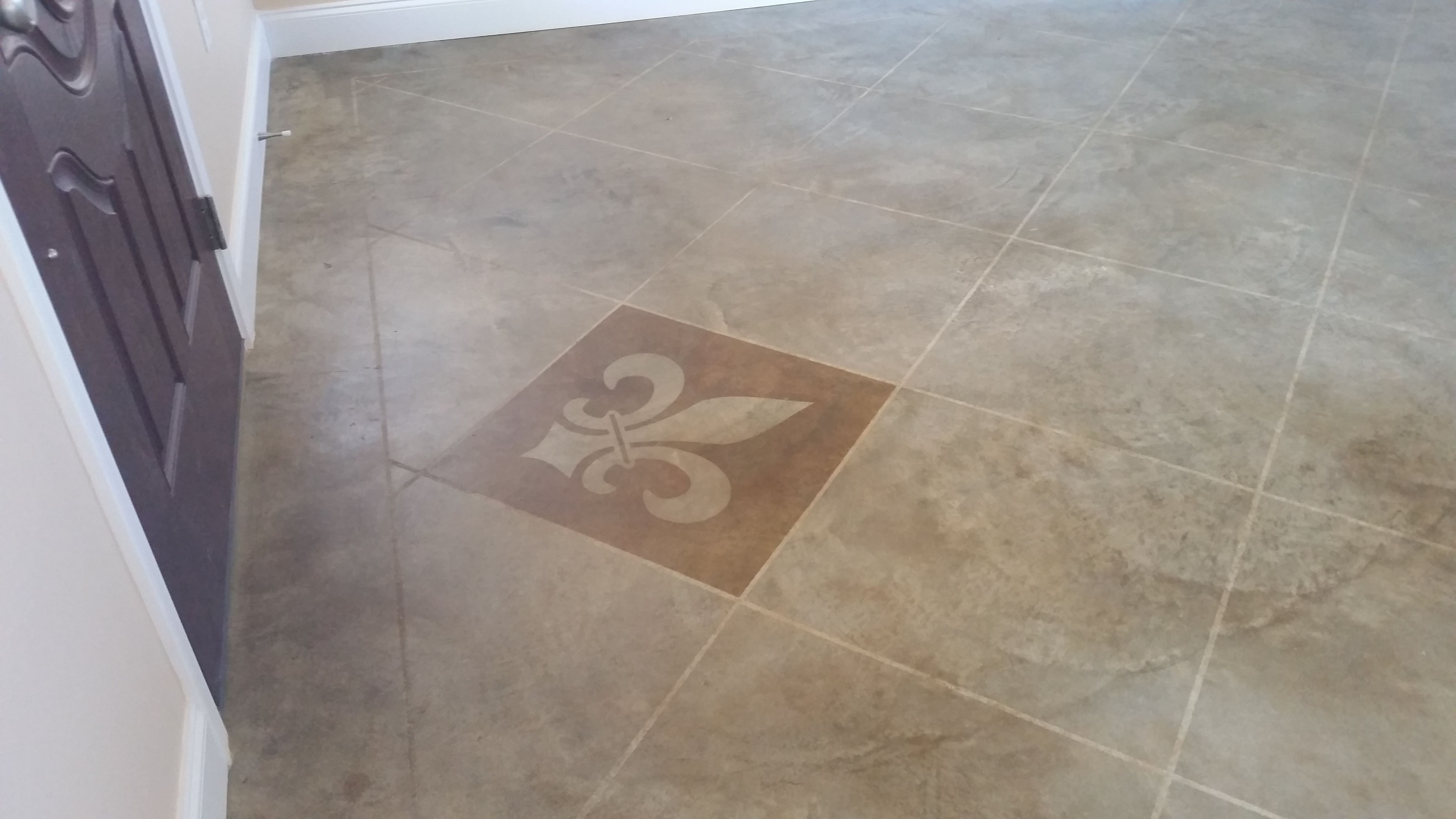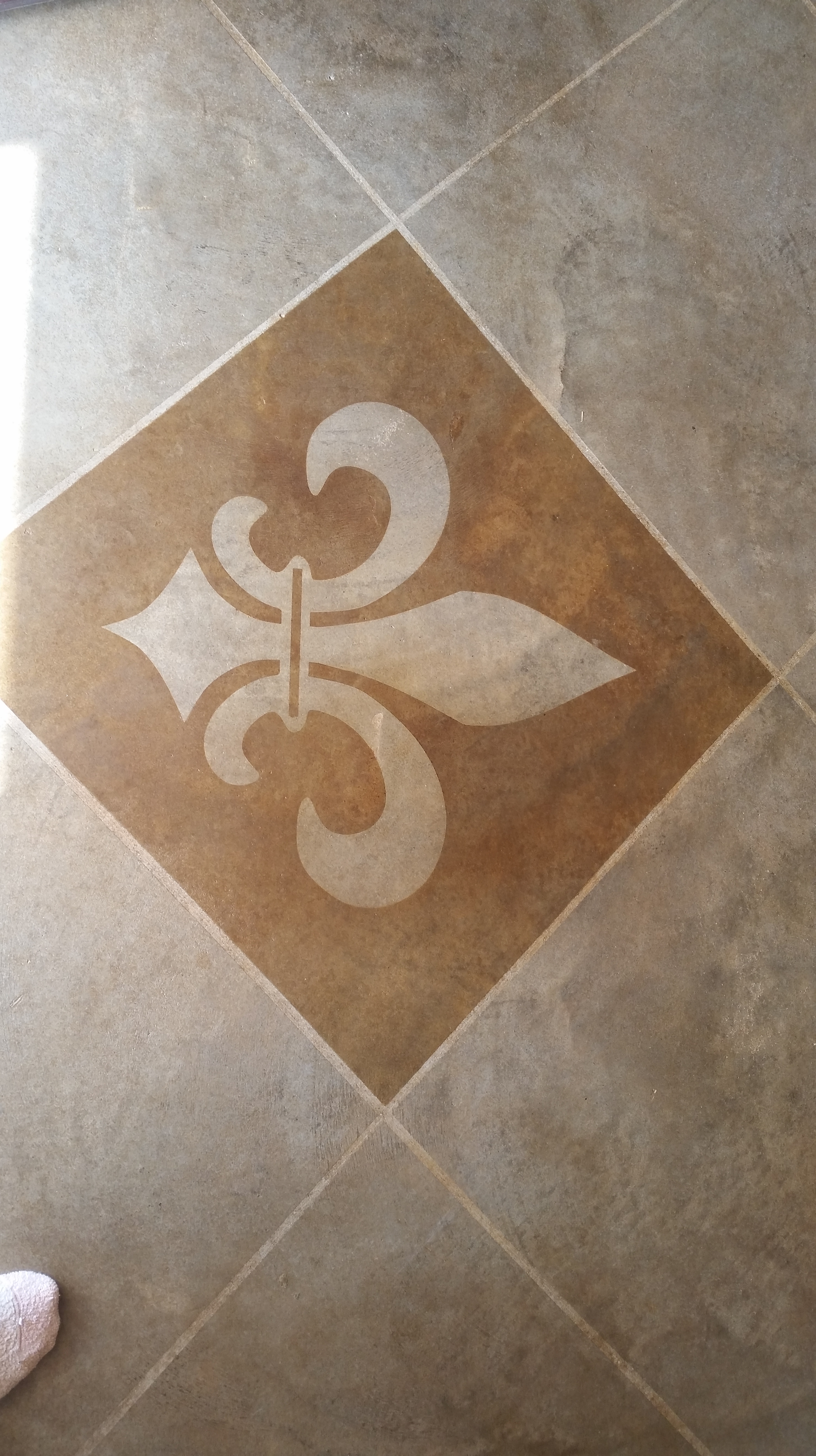 Thursday, March 19, 2015 – Our stained concrete guy, Roy Bankston came this morning to put several layers of floor sealer on the stained floors and put the Fleur de Lis down. We’ll leave it for two days to dry before moving the appliances into the kitchen and laundry room. It needs another coat or two but that will come.