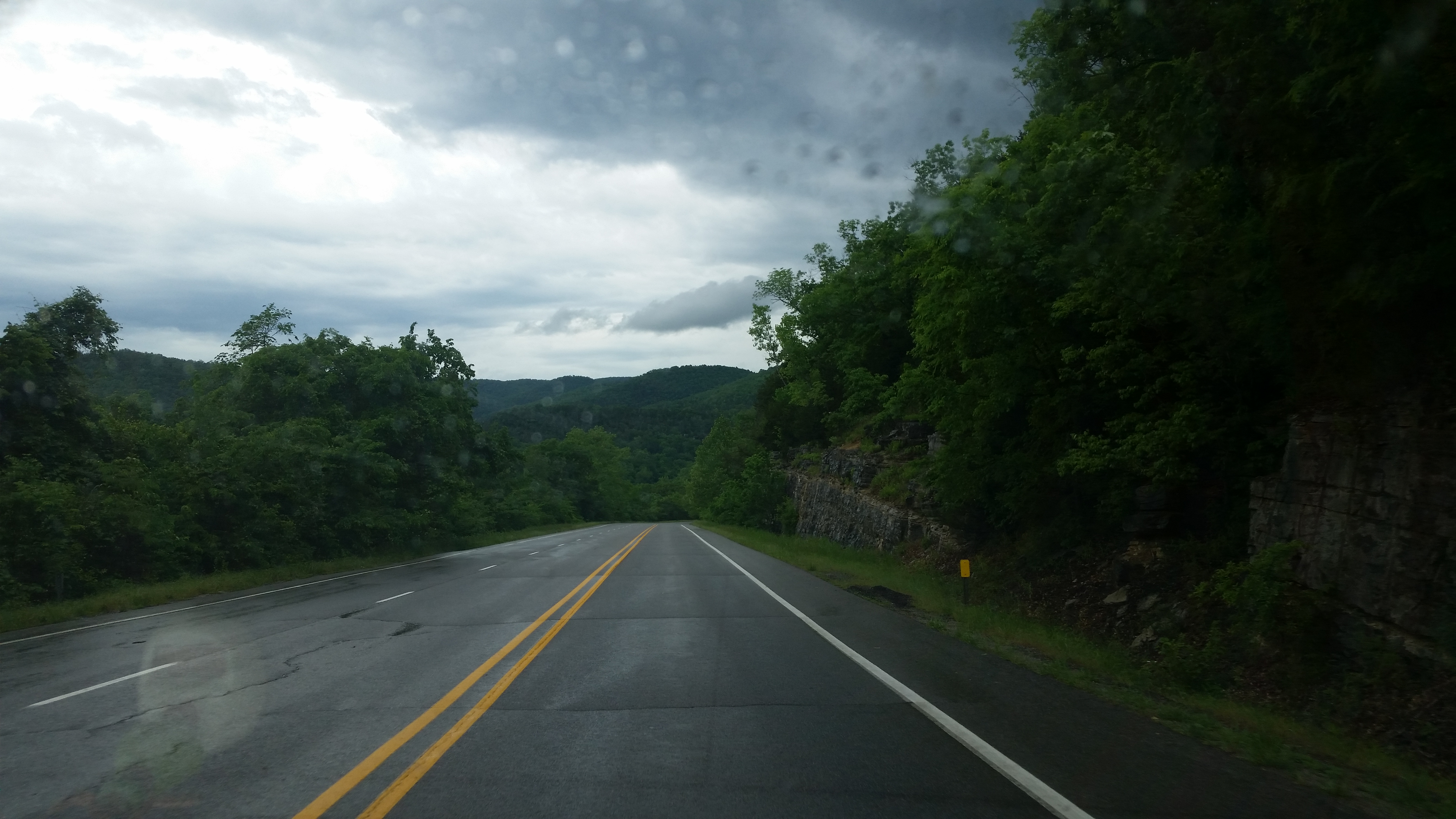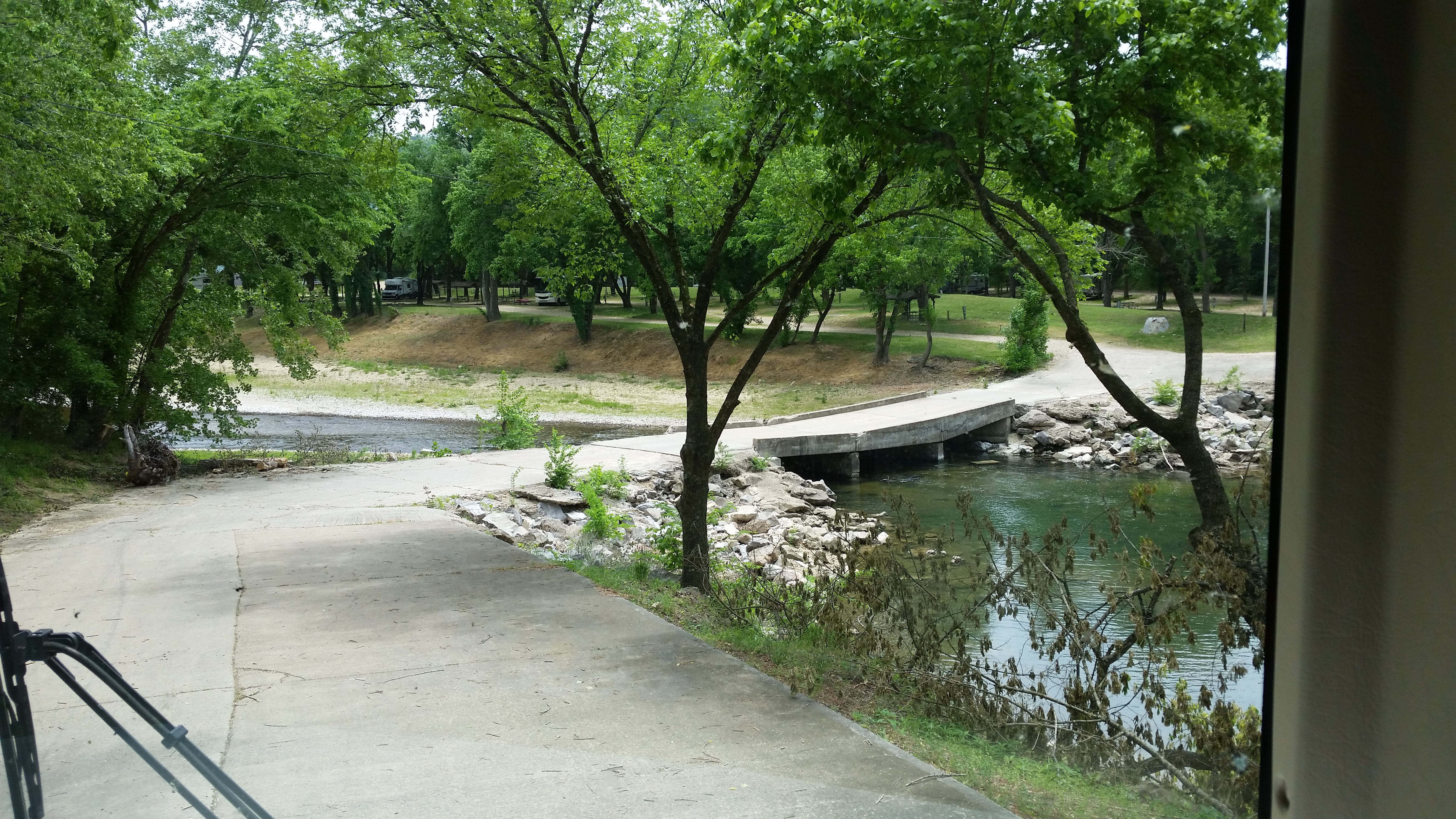 Friday, May 8, 2015 – Arkansas is simply beautiful. My friend Chrissie calls it “God’s Country” and she is right. Here’s some pictures as we drove in yesterday. We hope to get out in our truck and see some of what’s up the mountains. Roy watches the moonshining shows and just knows that’s what we’ll find up there! The roads curve every which way and go up and down. It’s a little dizzying, but pretty!