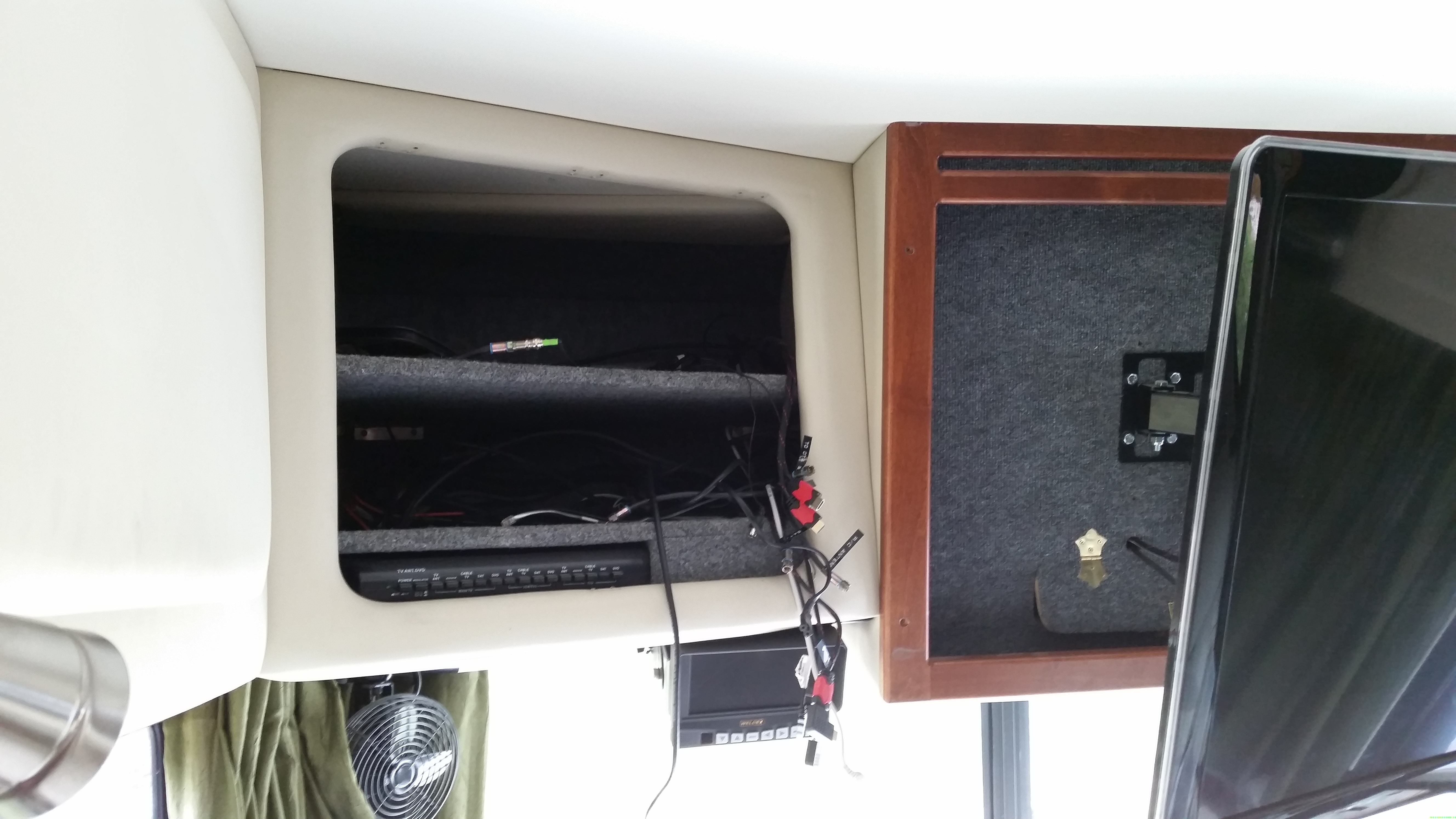 When we turned the TV on upon arriving, and the satellite dish started to boot up, it gave us a warning message that our receiver’s temperature was at 141 degrees which was too hot to function. We’ve never received that message before and since the receiver is in a location that no one would go near we never felt it being hot. Roy put our stand up fan on the drivers seat facing the units and began figuring out what he could do about this problem. Remember