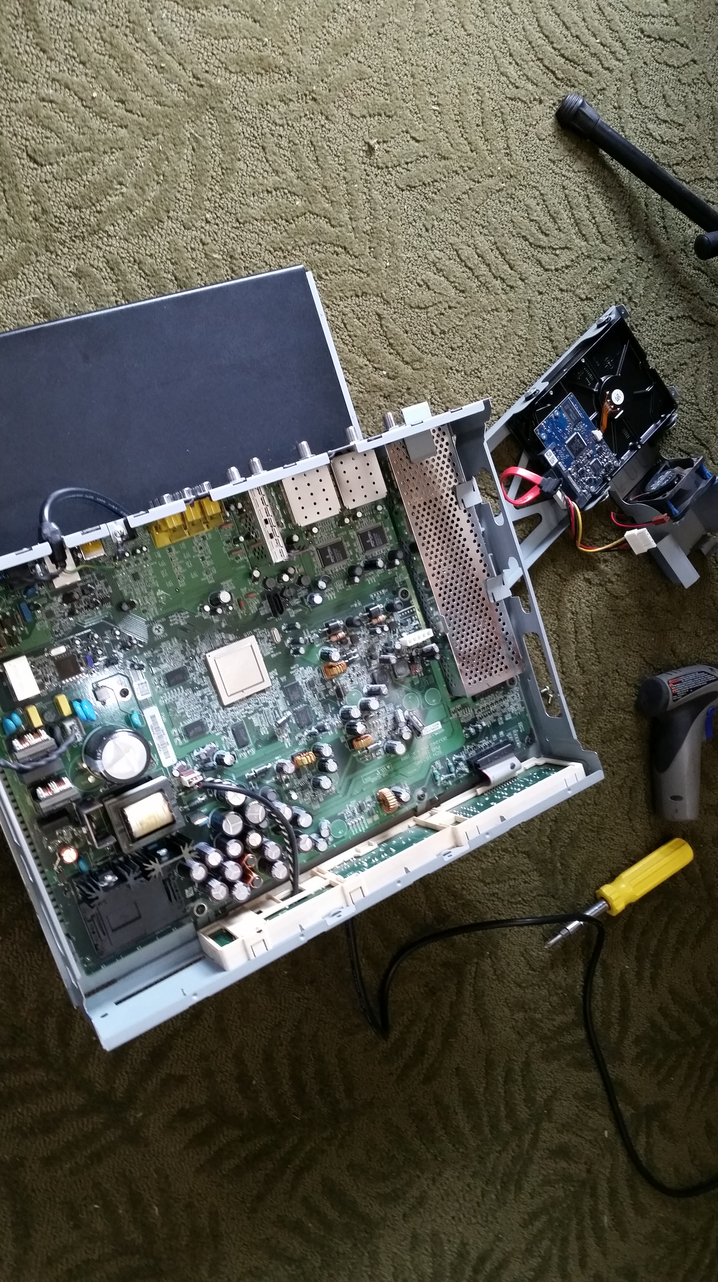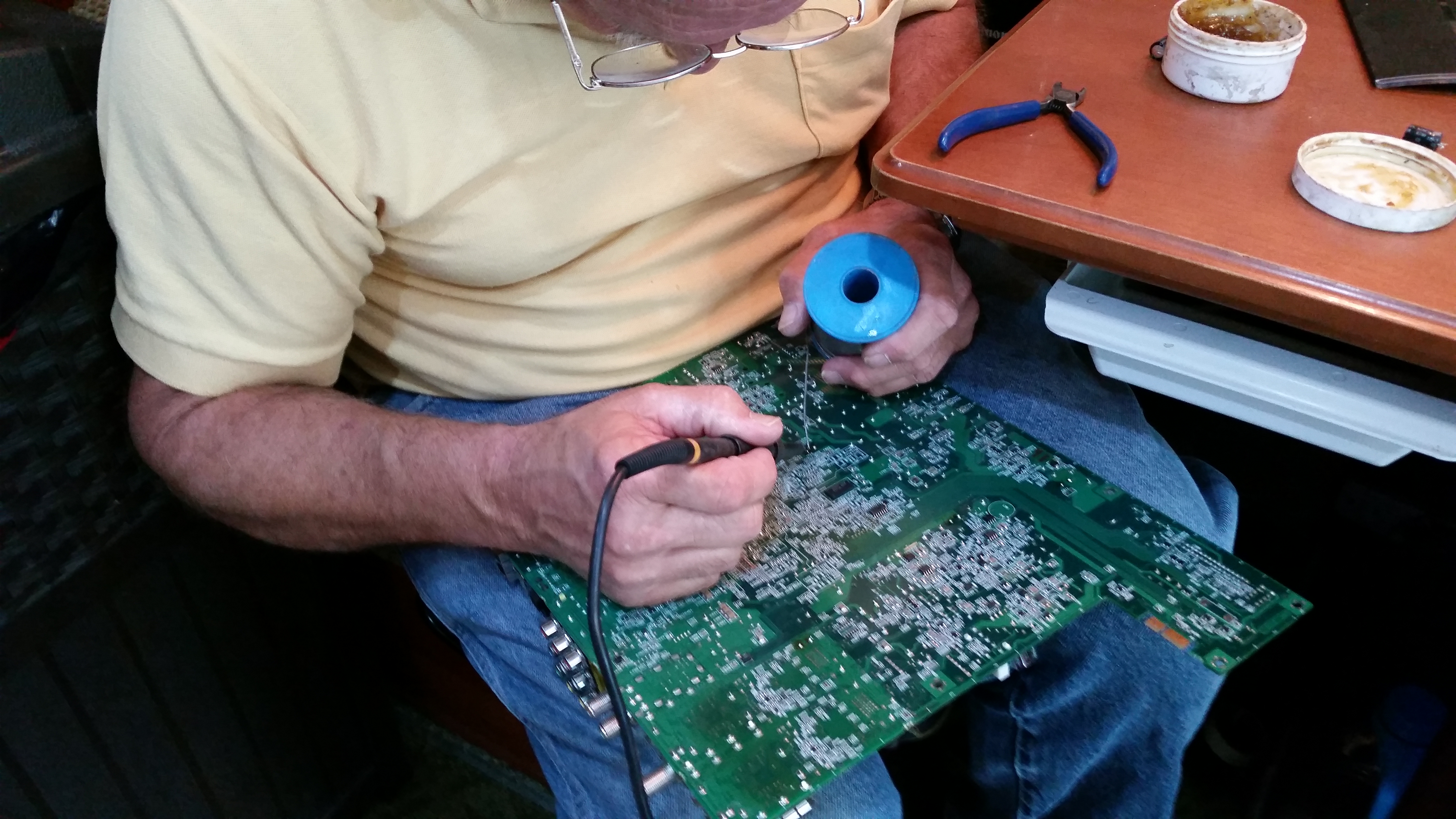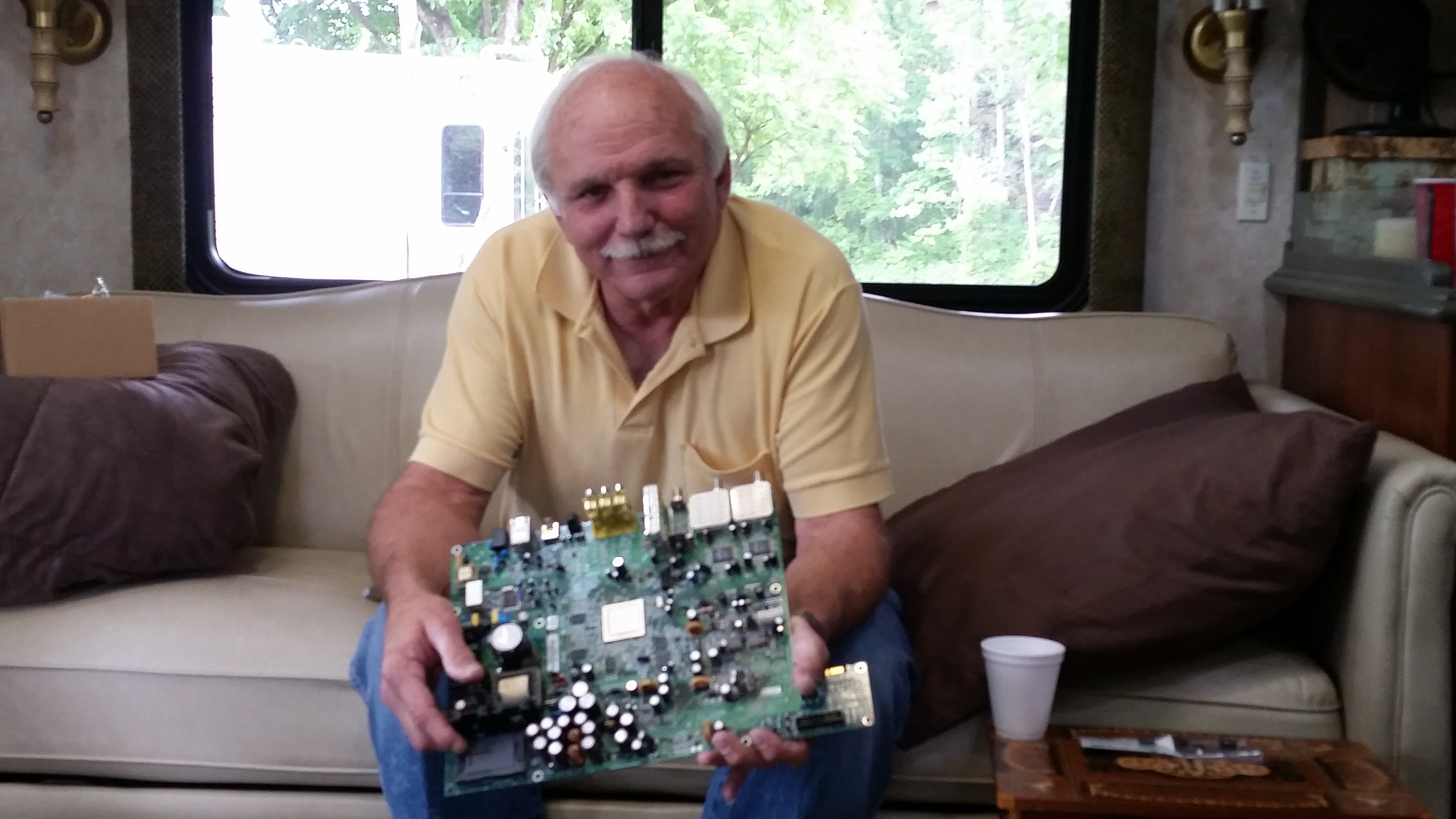 When I got up this morning, before even getting my coffee, Roy walked me through what he needed to do to resolve this. I don’t quite know how to describe what all he said but part of it is that we will remove the VHS/DVD unit which will provide more air space around the satellite receiver. Our Blue Ray unit will show DVDs so we don’t lose that capability. He’s checking on the fan in the Satellite Receiver and is changing out some capacitors (thank goodness for having a hubby that carries such odd things around with us). Here’s three pictures showing how he removed all the technology units and what he’s doing right now (on Friday afternoon). The rest of the equipment wouldn’t fit in the same picture but it’s all there spread out on the floor!