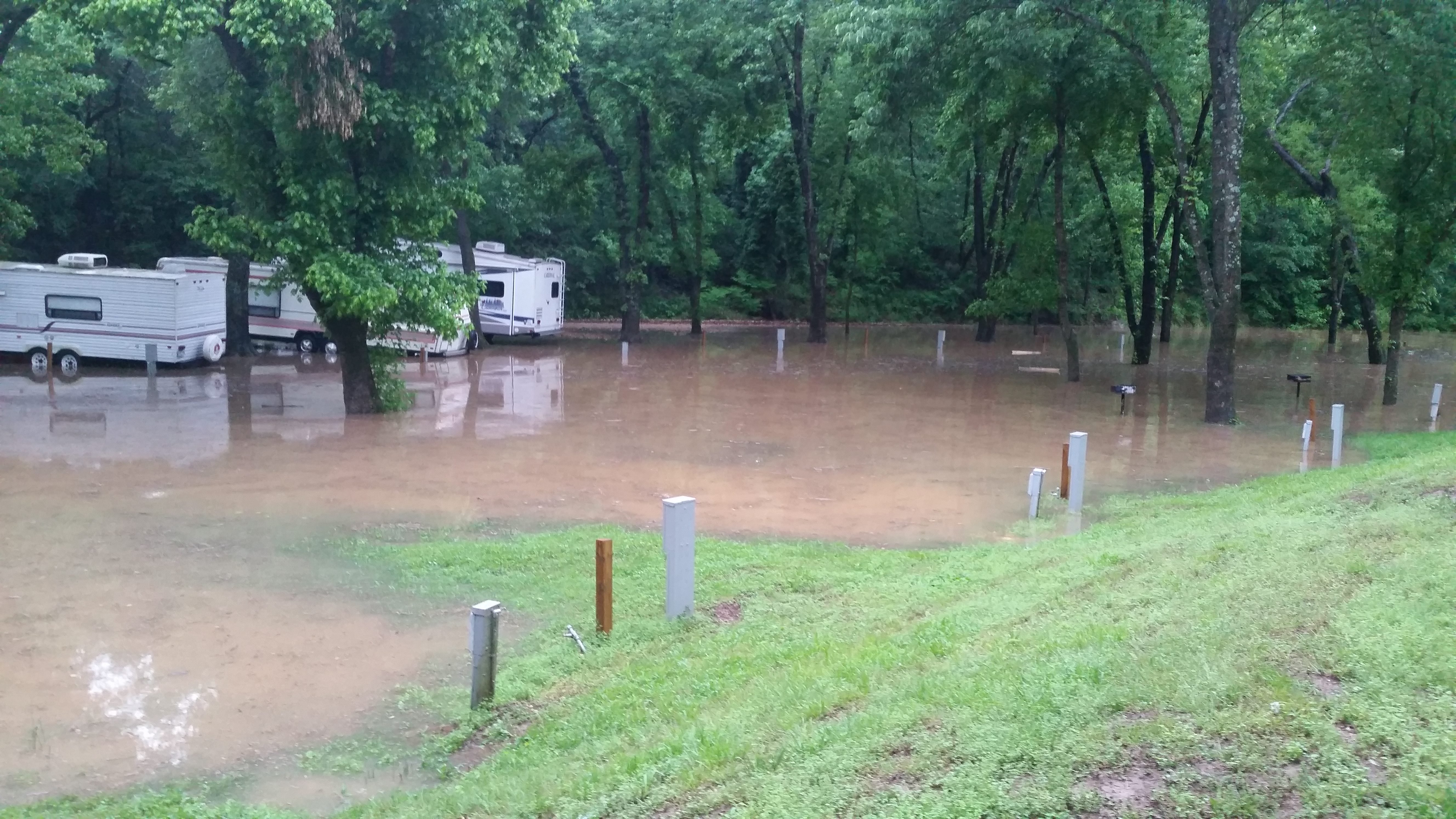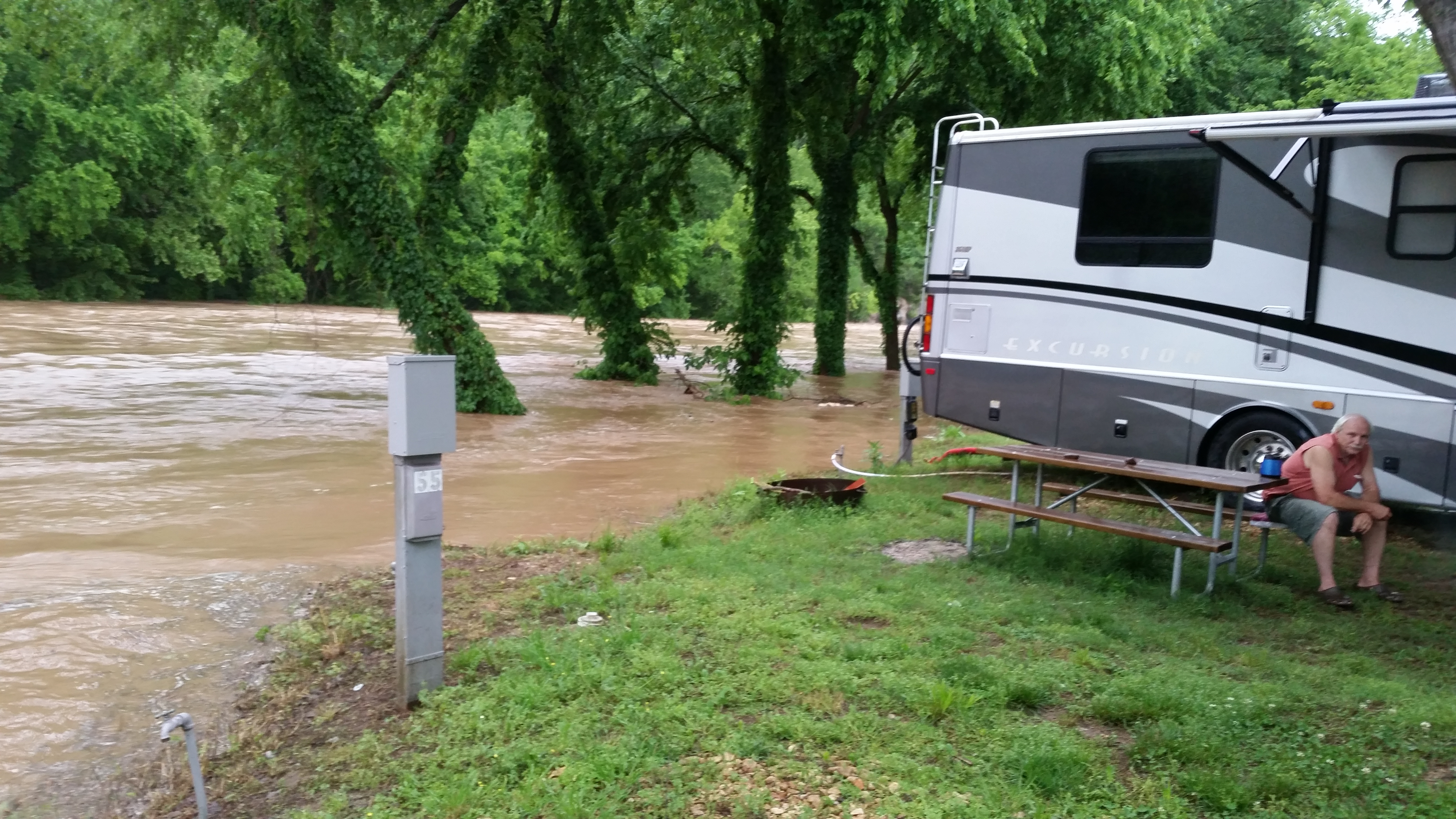 We are now parked about 300 feet from the river with Dora aimed at the exit. All the fifth wheels have been moved out and the park owners moved all the picnic tables higher and attached to trees.