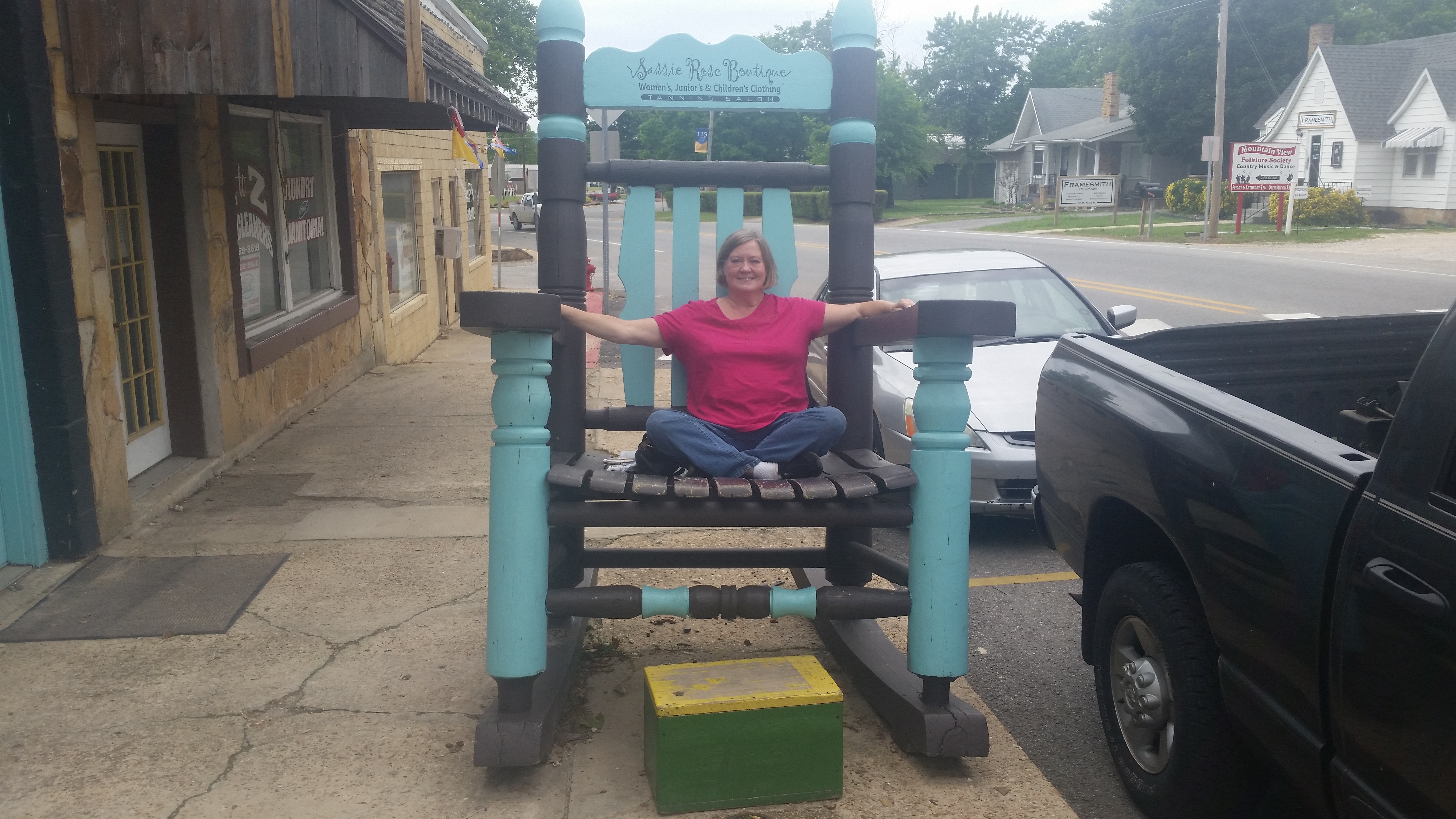 We found this giant rocker on the sidewalk and of course immediately thought Photo Op!! Roy wouldn’t climb into it but I did real fast.