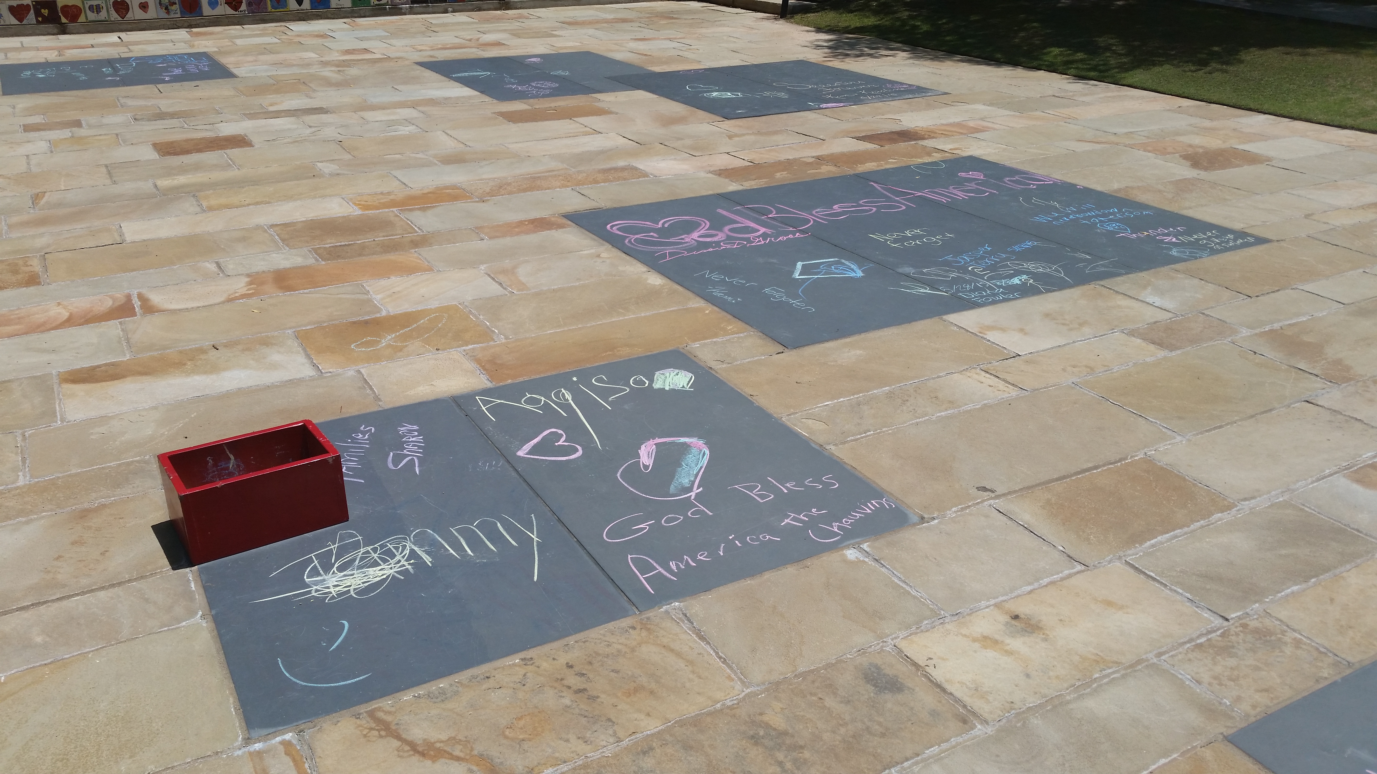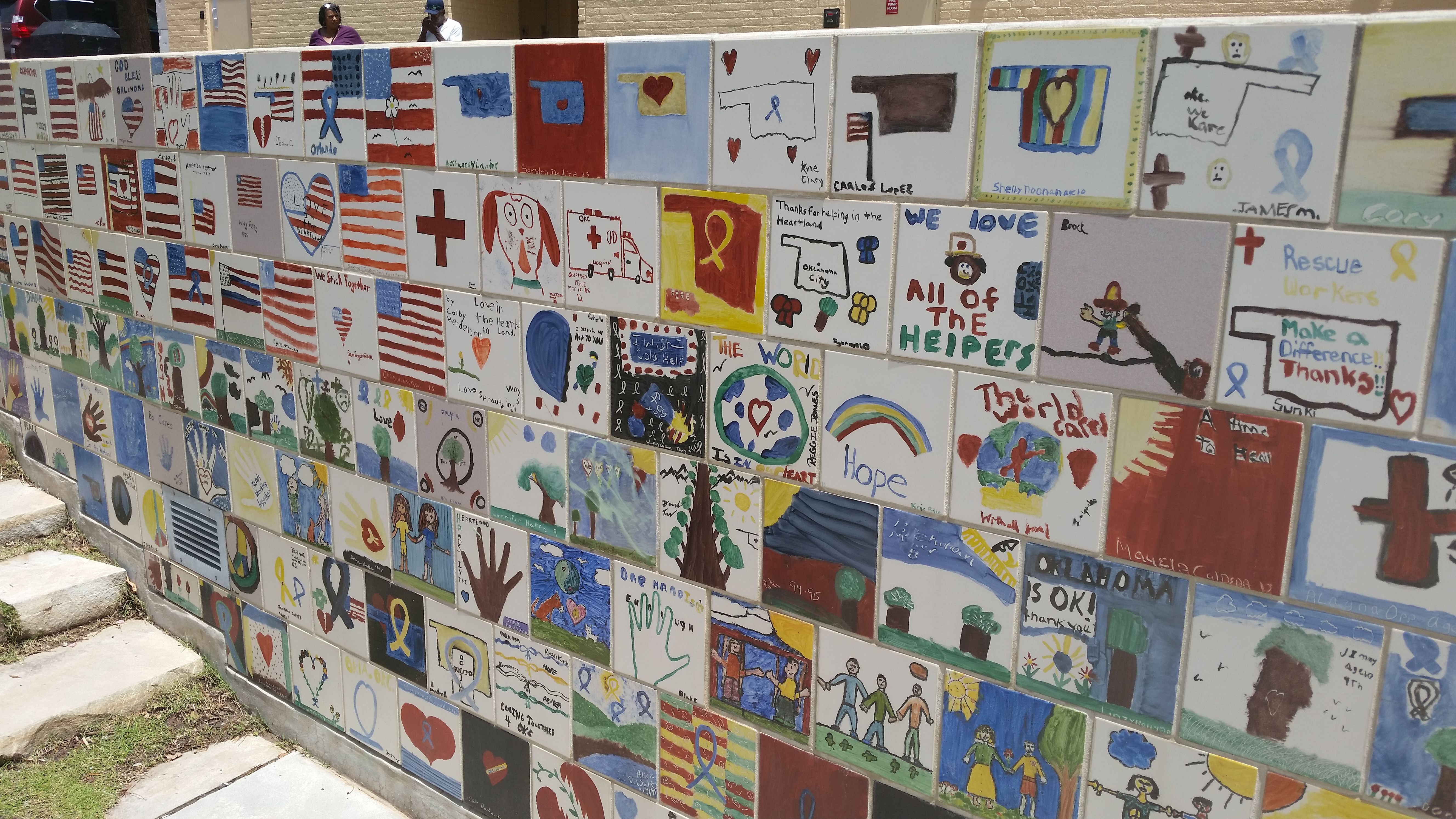 In the aftermath of the blast, children from around the country and the world sent in their own expressions of encouragement and love. That care is represented today by a wall of tiles painted by children and sent to Oklahoma City in 1995. In addition, buckets of chalk and chalkboards built into the ground of the Children’s Area give children a place where they can continue to share their feelings — an important component of the healing process.