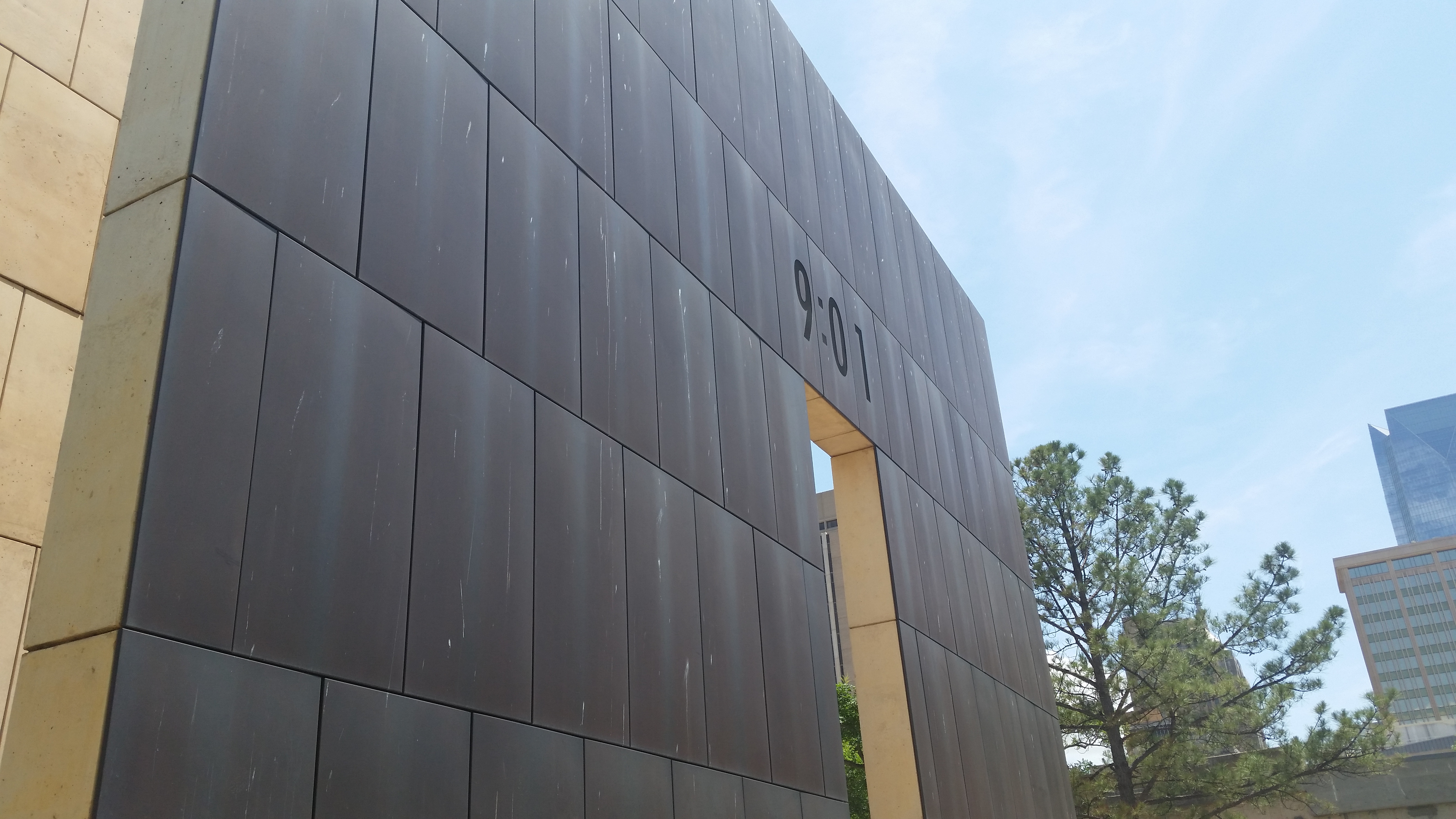 These monumental twin gates frame the moment of destruction – 9:02 a.m. – and mark the formal entrances to the Memorial. The East Gate represents 9:01 a.m. on April 19, and the innocence of the city before the attack. The West Gate represents 9:03 a.m., the moment we were changed forever, and the hope that came from the horror in the moments and days following the bombing.