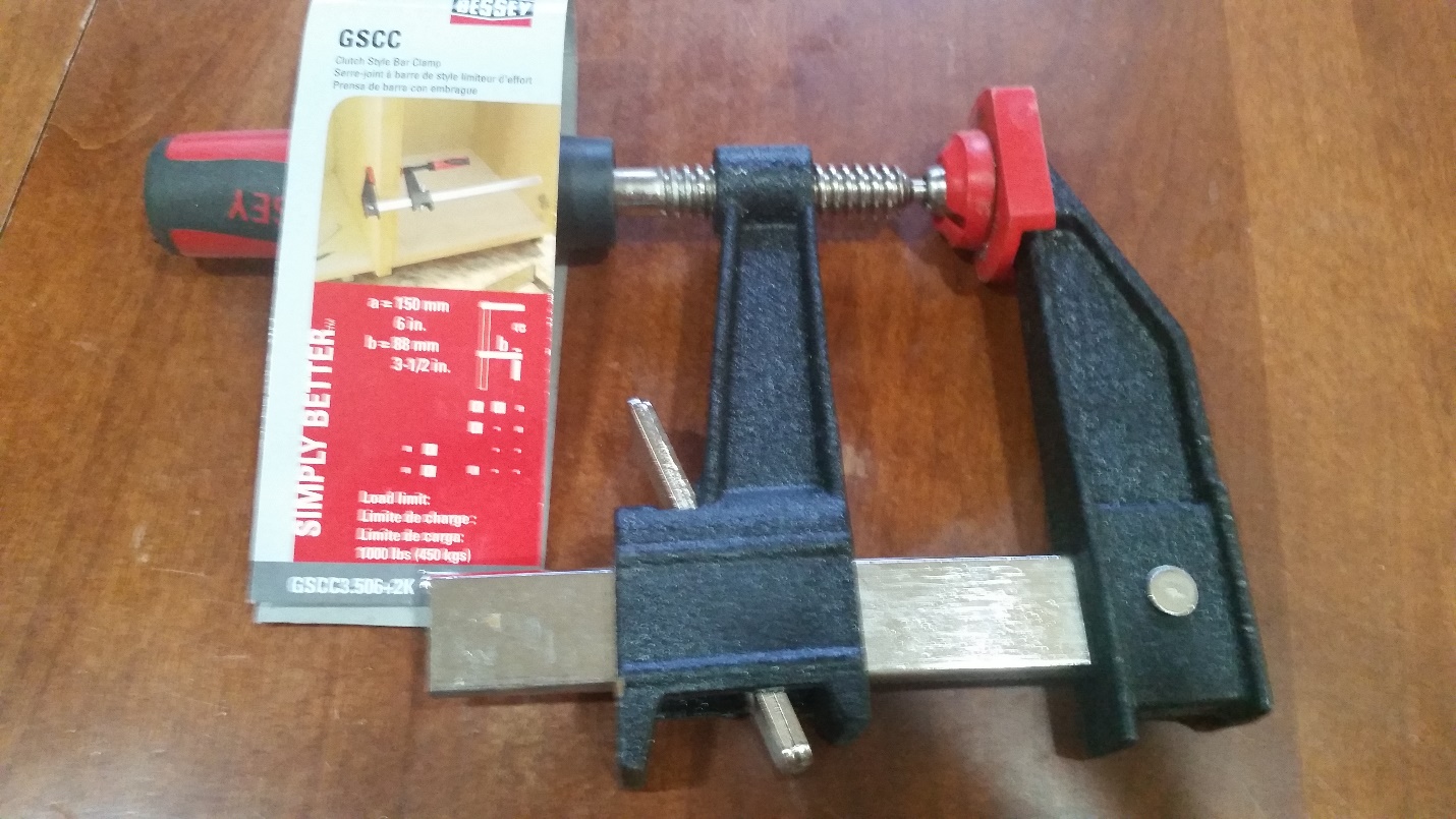 I did some research and found the cost to replace this lock is anywhere from $75 to $150. Not willing to put out that much money for a simple cracked deadbolt I decided to create a new one. There is a brass plate on the back of the lock that is riveted to the casting making it impossible to remove the metal rod that extends the deadbolt. However, I was able to remove the deadbolt by using the key to extend the deadbolt all the way out, then bending the rod up just enough to slip the broken deadbolt out. The closest home improvement store to me at the time was Home Depot. I went to Home Depot to try and buy a piece of flat stock that I could build the new deadbolt from. Nothing they had was thick enough so I had to use the MacGyver in me and be creative with something else. I was able to find a clamp that has a steel rod on it that was exactly the thickness that I needed and it was only $10.79. I quickly purchased it and headed back to the RV with the intention of creating a new deadbolt. Below is a picture of the clamp after I cut off what I needed.