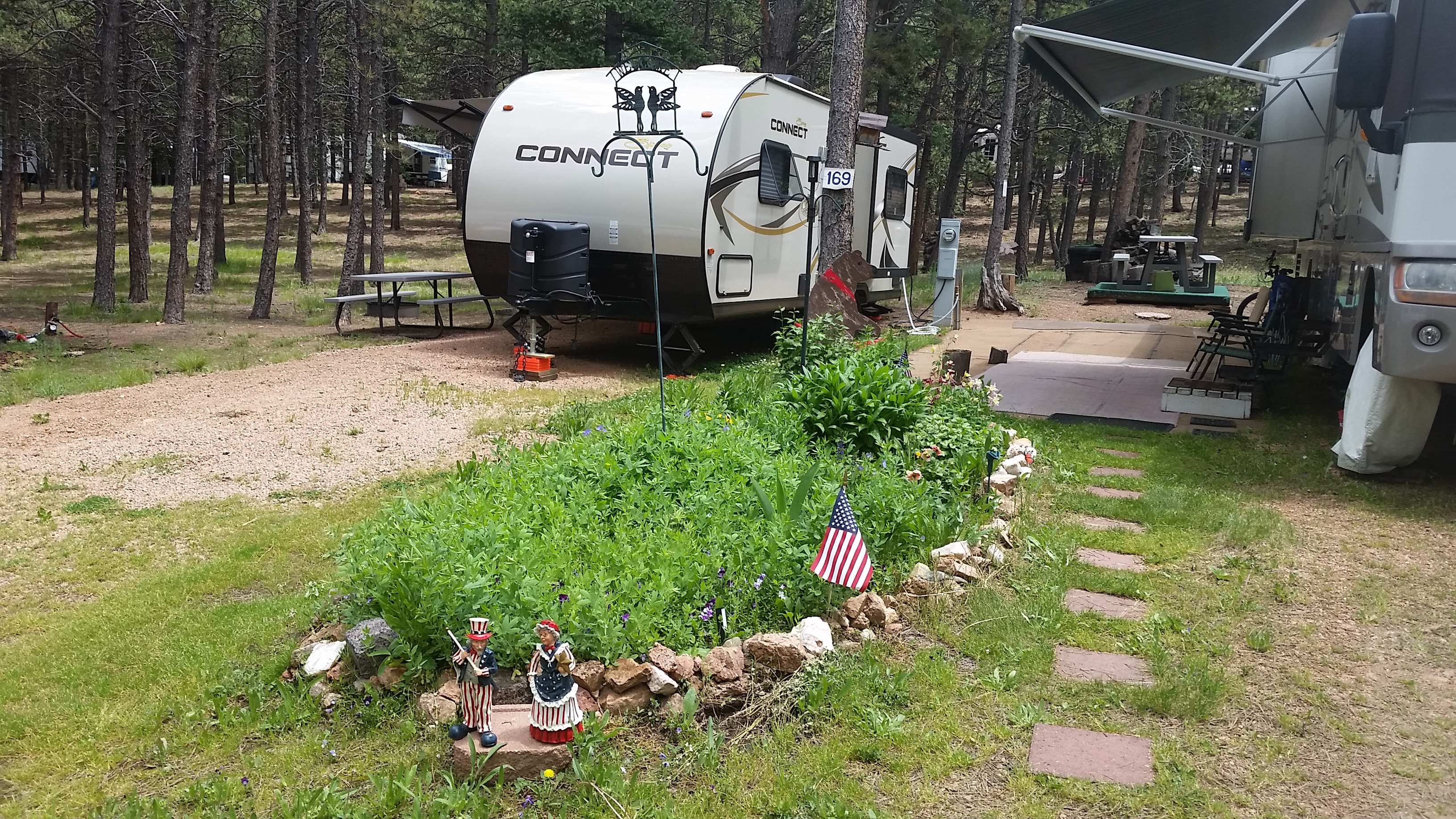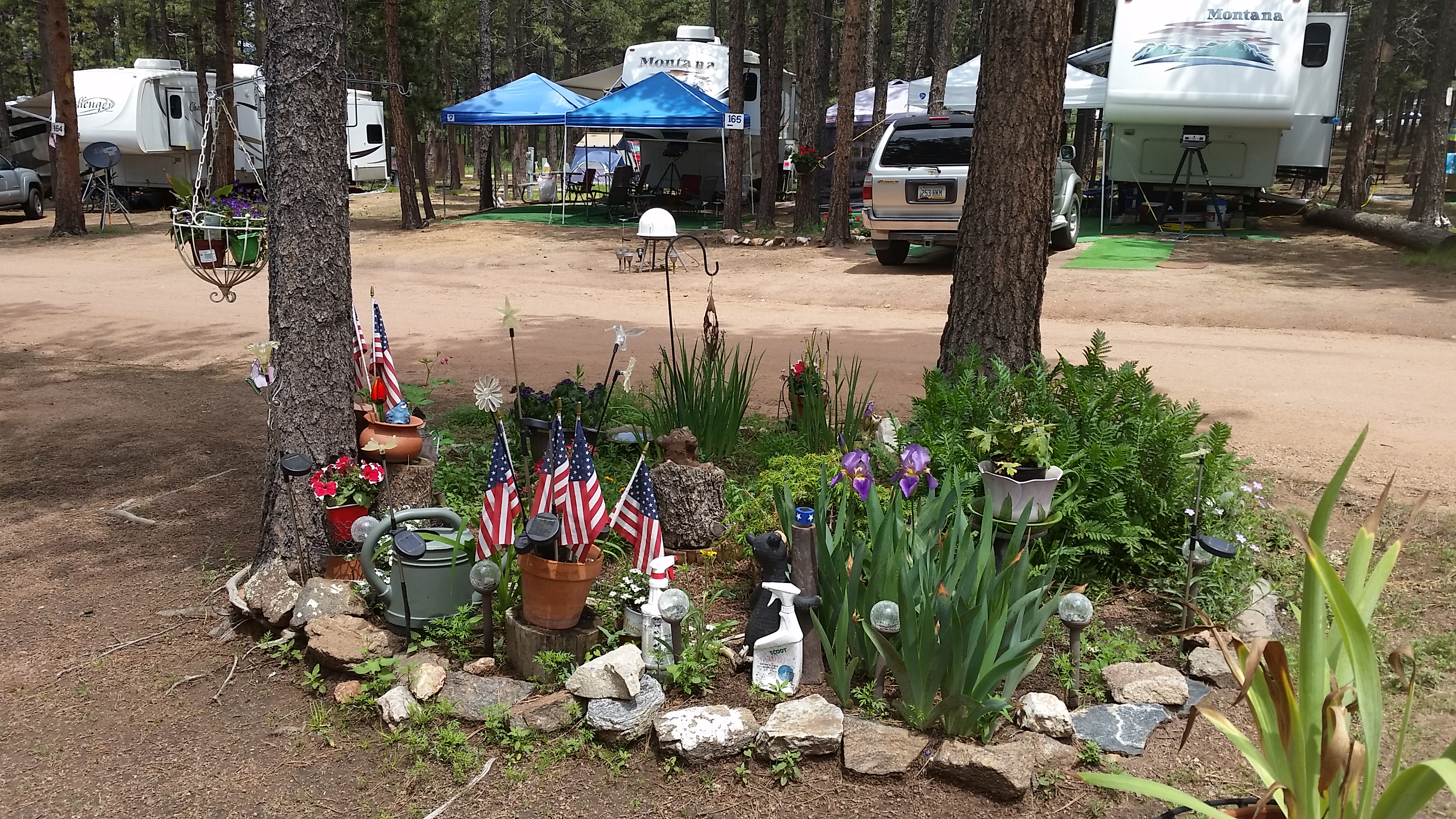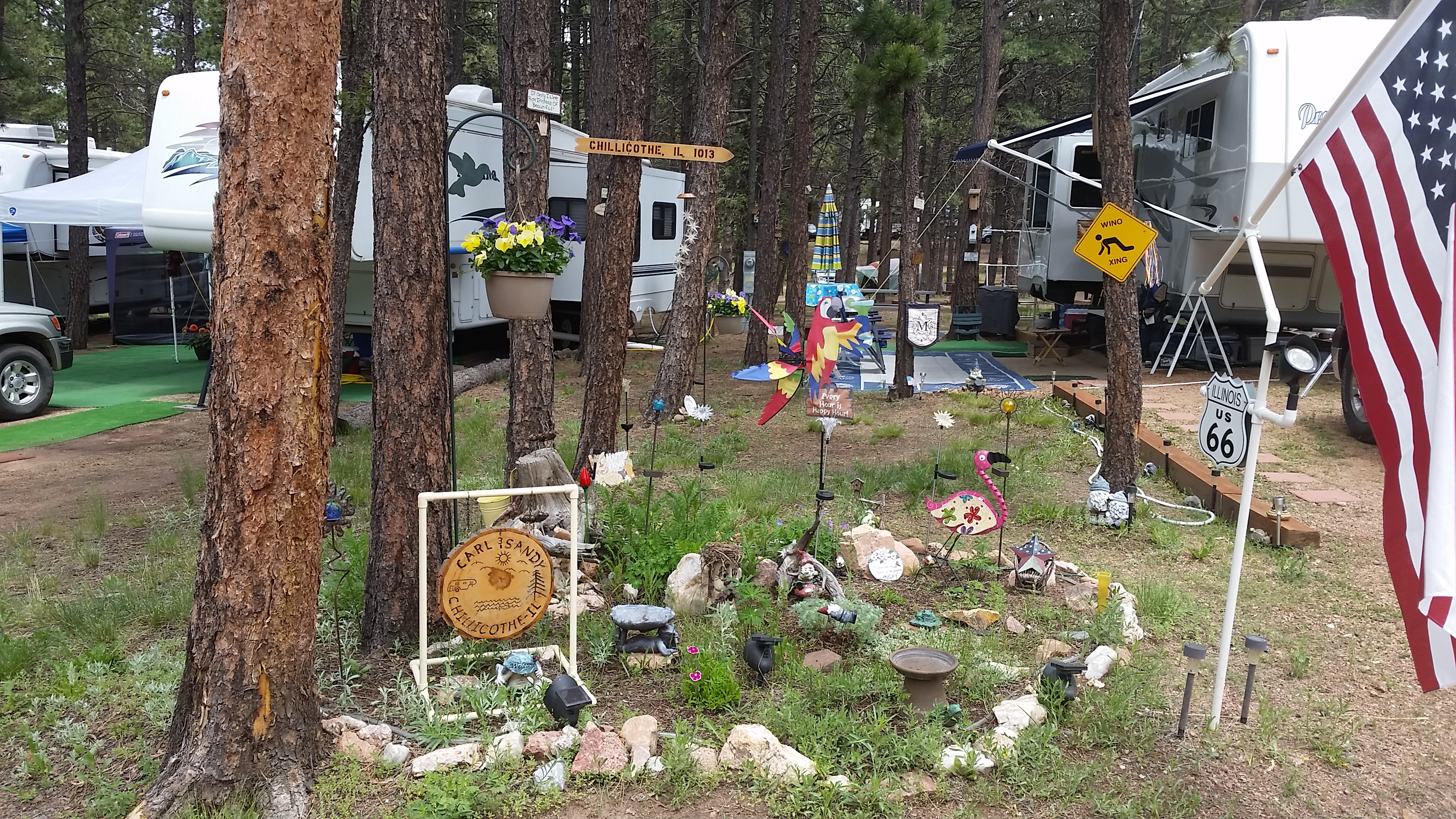 Several of their lawns are decorated with flowers, flags and other decorations I mentioned in my last post. I could really imagine coming here every year and staying a while. The temperature here is way below what it was in Monument even though that is only a few miles away. High yesterday was low 60s and low was high 40s!!! Very weird for being so close to where it was in the high 80s but we like it. Roy obviously enjoyed it here today!