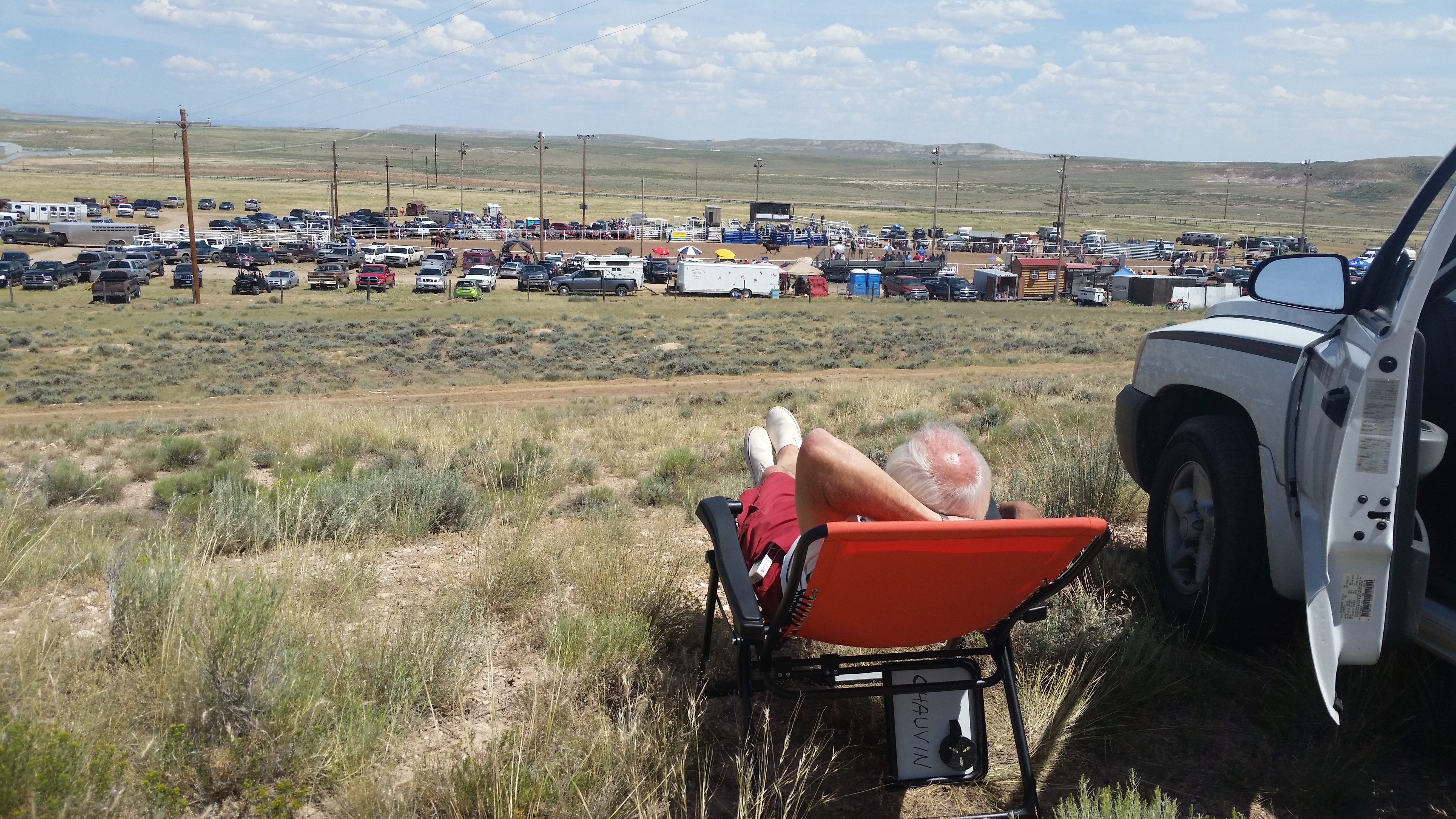 20150704_124833 20150704_125753We sat in the stands for about half the rodeo and after baking to a golden red (even with our Saints umbrella!) decided to get in the truck and drive up on the hillside where we could sit in the a/c or in the nice breeze up there.  Roy took out a folding chair, laid back and watched the rodeo from there!