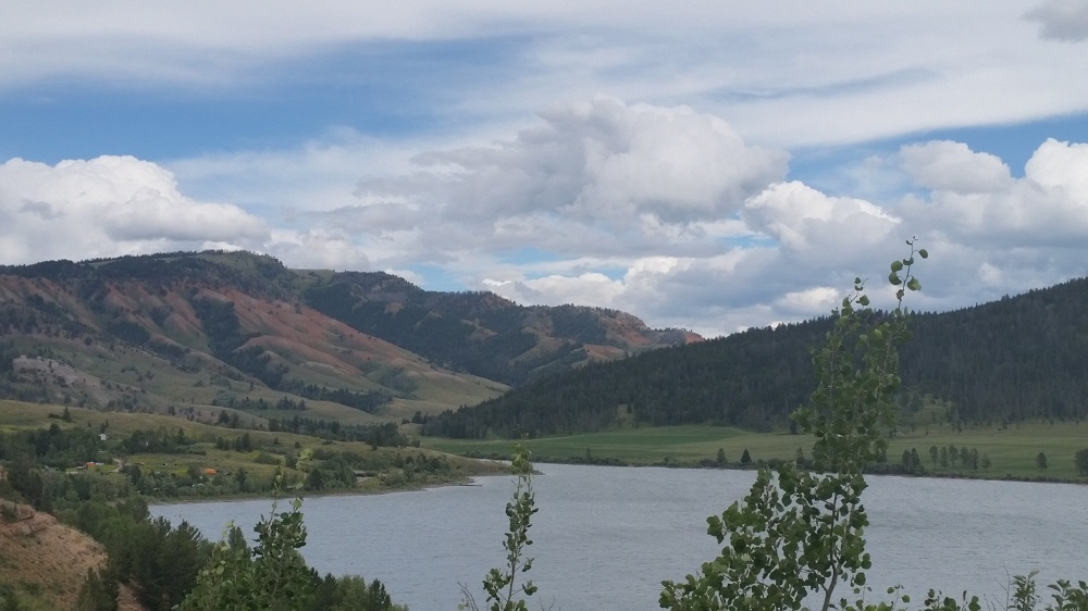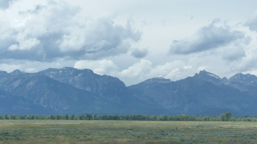 Saturday, July 18, 2015 – After staying in one location for two weeks, being back on the road was fun! As we got closer to the Grand Teton National Park the scenery got more and more beautiful! And cooler and cooler! The beach scene to the left is a stark contrast to summer here in the mountains. Long sleeves, jackets and long blue jeans are proper attire for a 51 degree day!