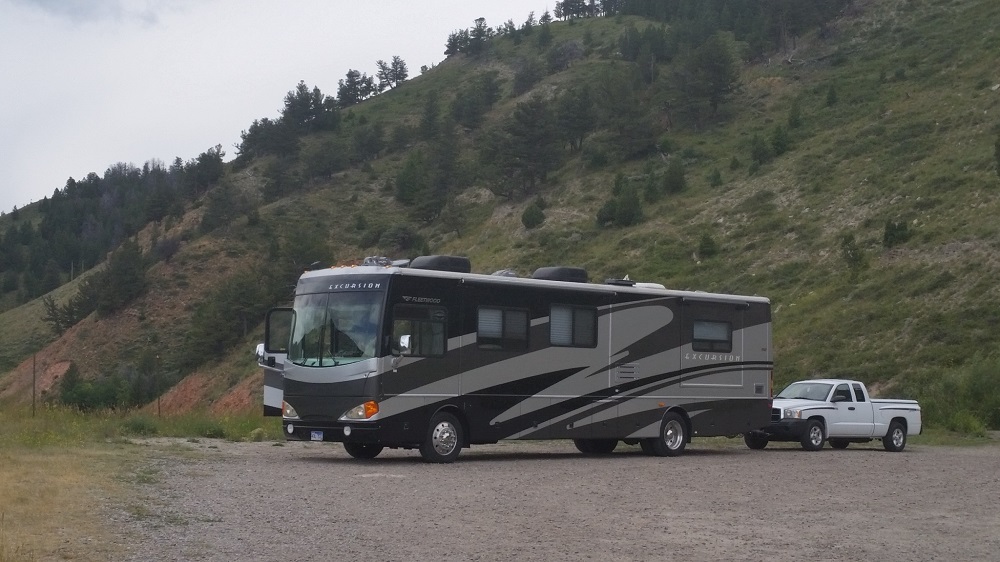 check out. The only one north of us (going towards Grand Teton) was off Long Silver Lake which is a beautiful lake in the middle of no where! Perfect for us! Except that we got no internet reception (not even a smidgen). Since I work on the weekends using the internet we drove all around there looking for at least 3G but found nothing in the wilderness areas. We drove for several miles, enjoying the scenery but when the road became too narrow and rough for Dora and Boots (not to mention Roy and Rosalyn’s fillings getting knocked around) we turned back and returned to civilization.