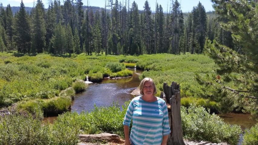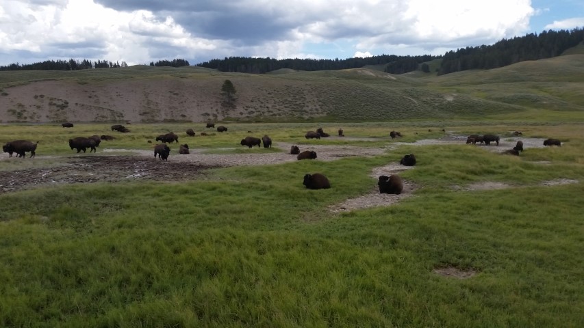 We saw close to a hundred bison in different places. You could tell where they were because dozens of cars were pulled off the side of the road to see them. The first group of bison were not far from the road with some in the river. Across the river from the other but on our side of the road was one lonely bison and we got good pictures of him. You can see how large they are. To take the photo of the bison by himself we pulled up alongside him in the RV and I opened the door and snapped the photo. Had I know about the lady that was just attacked this week by a bison when taking a selfie, I probably wouldn’t have been so brave!