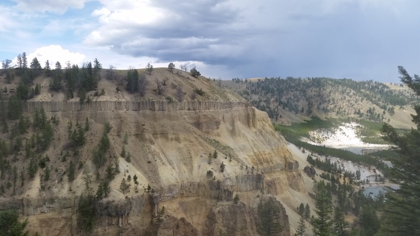 Several years ago a terrible forest fire killed a lot of the pines in Yellowstone. They have since planted small ones that have grown a lot, but not enough to hide the dead ones. Most of the park does not look like this but some parts do.
