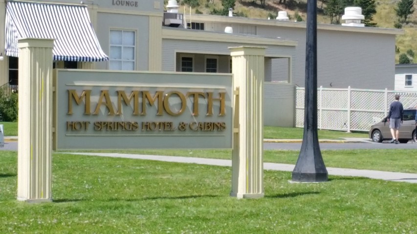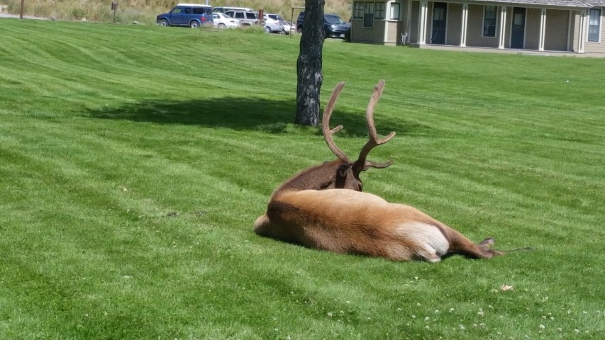 We tried our best not to stop along the way since it was such a long drive but we got so overwhelmed with the sites we did stop a few times. In front of the beautiful old Mammoth Hot Springs Hotel were several mule deer (look like deer but larger) and they didn’t seem bothered at all by all the people passing by! They were there every time we passed by that hotel.