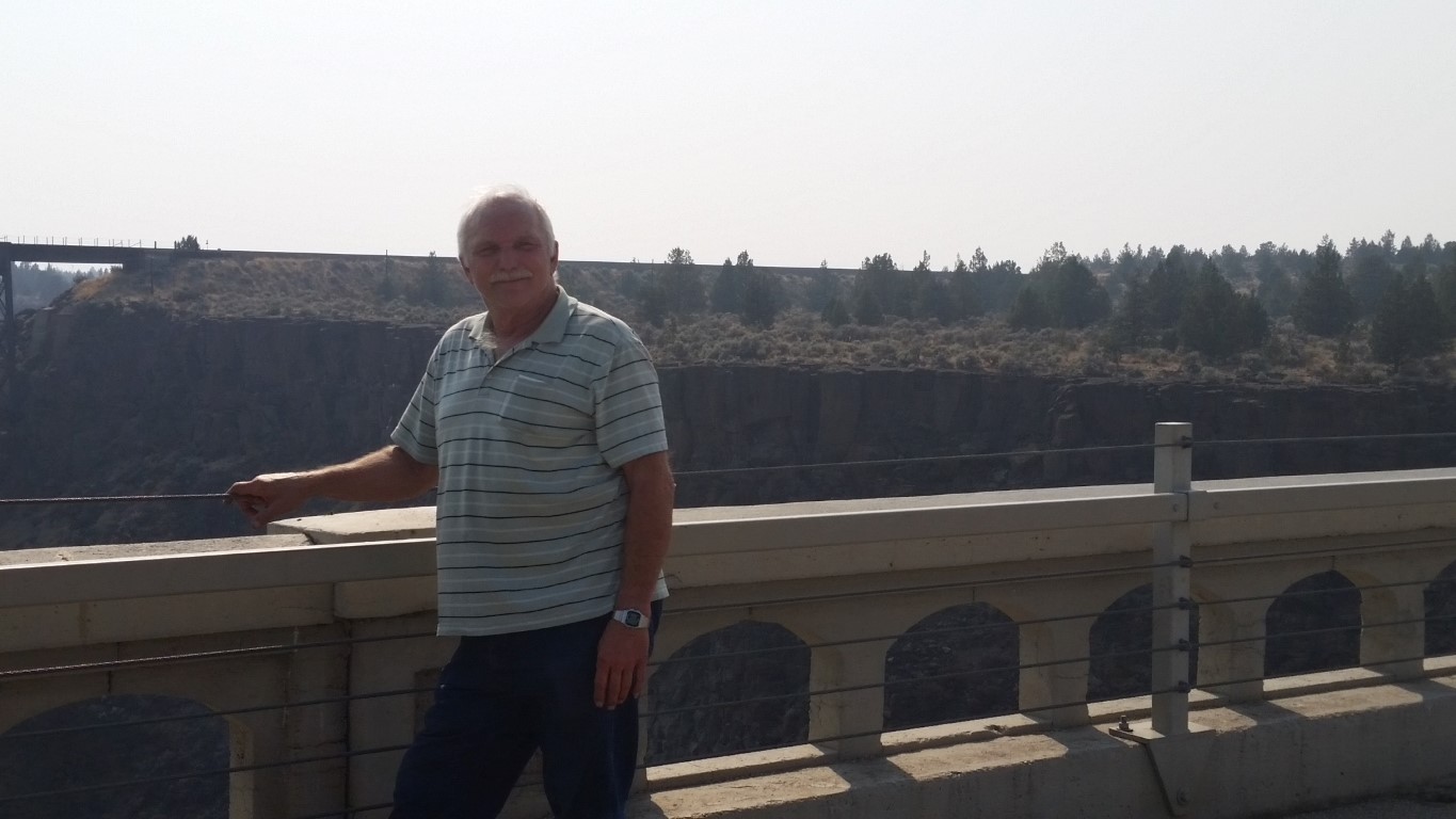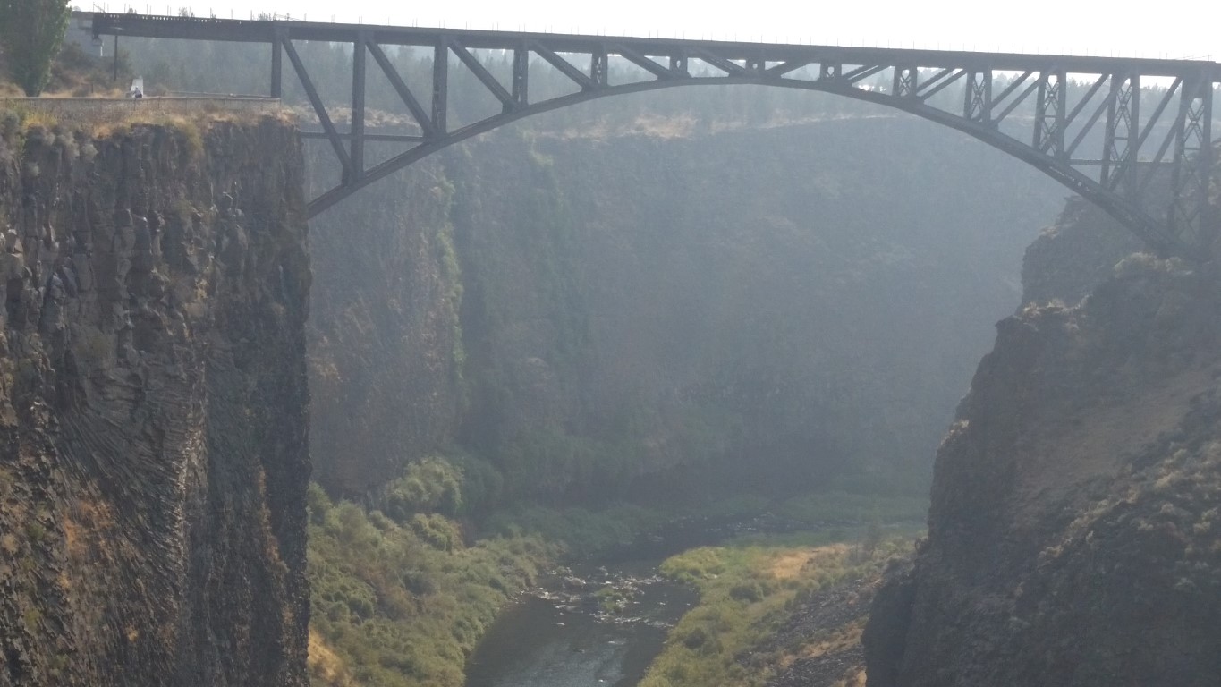 Friday, August 21, 2015 – The Peter Skene Ogden State Scenic Viewpoint, in Terrebonne,Oregon is the amazing sight we zooomed by while driving down the Oregon highway! It is a state park on the Crooked River along U S Highway 97. Thank goodness there was a place to pull over just past it and a pathway to walk back and see it. After walking down the pathway to the dramatic cliff, the view from the center bridge down to the Crooked River and to the bridges and views on either side is breath taking! I said to Roy, “This is absolutely the most beautiful sight we’ve seen!” The pictures cannot possibly capture the beauty of it all.