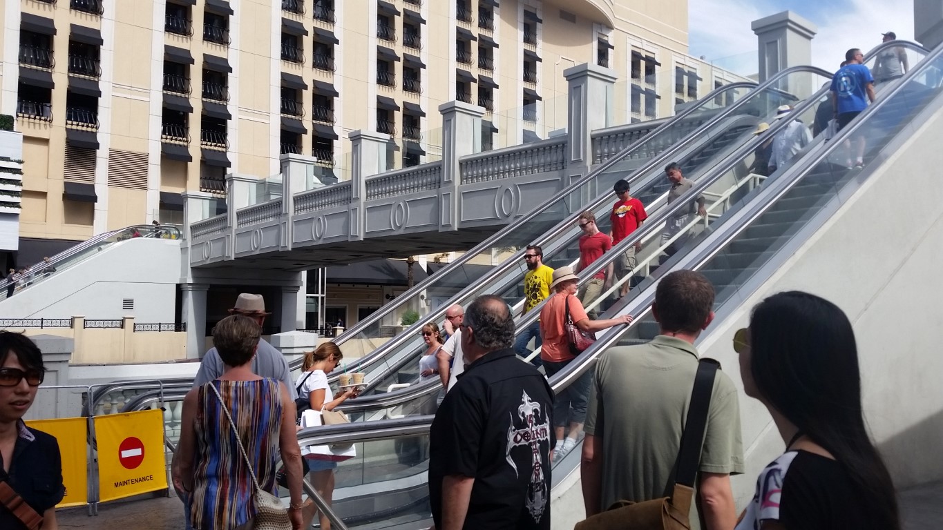 On the strip there are several locations where escalators take you up and over then down a street which cuts down a lot on street crossings and helps gain access to second floor locations from outside. Here’s one of the many