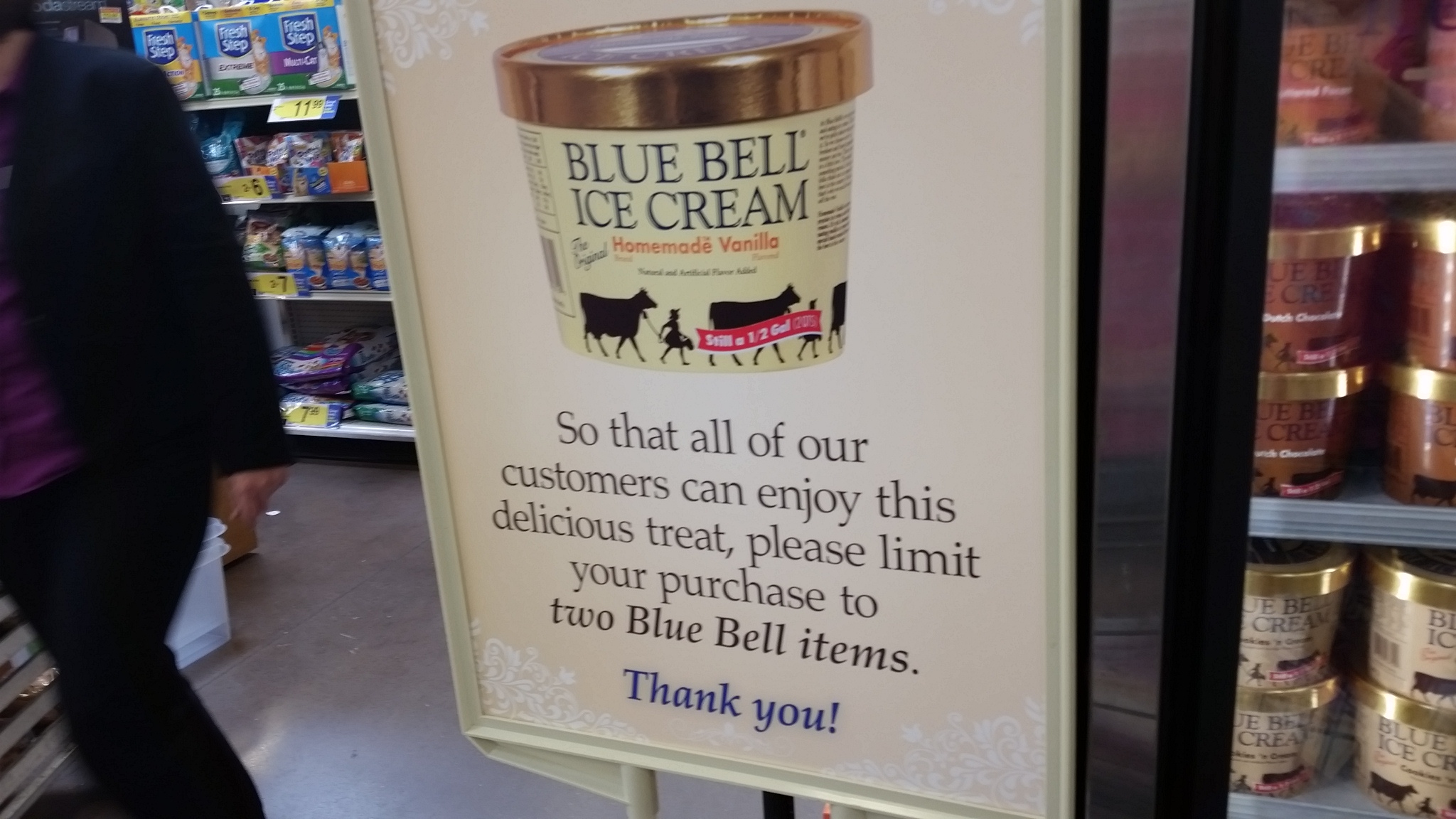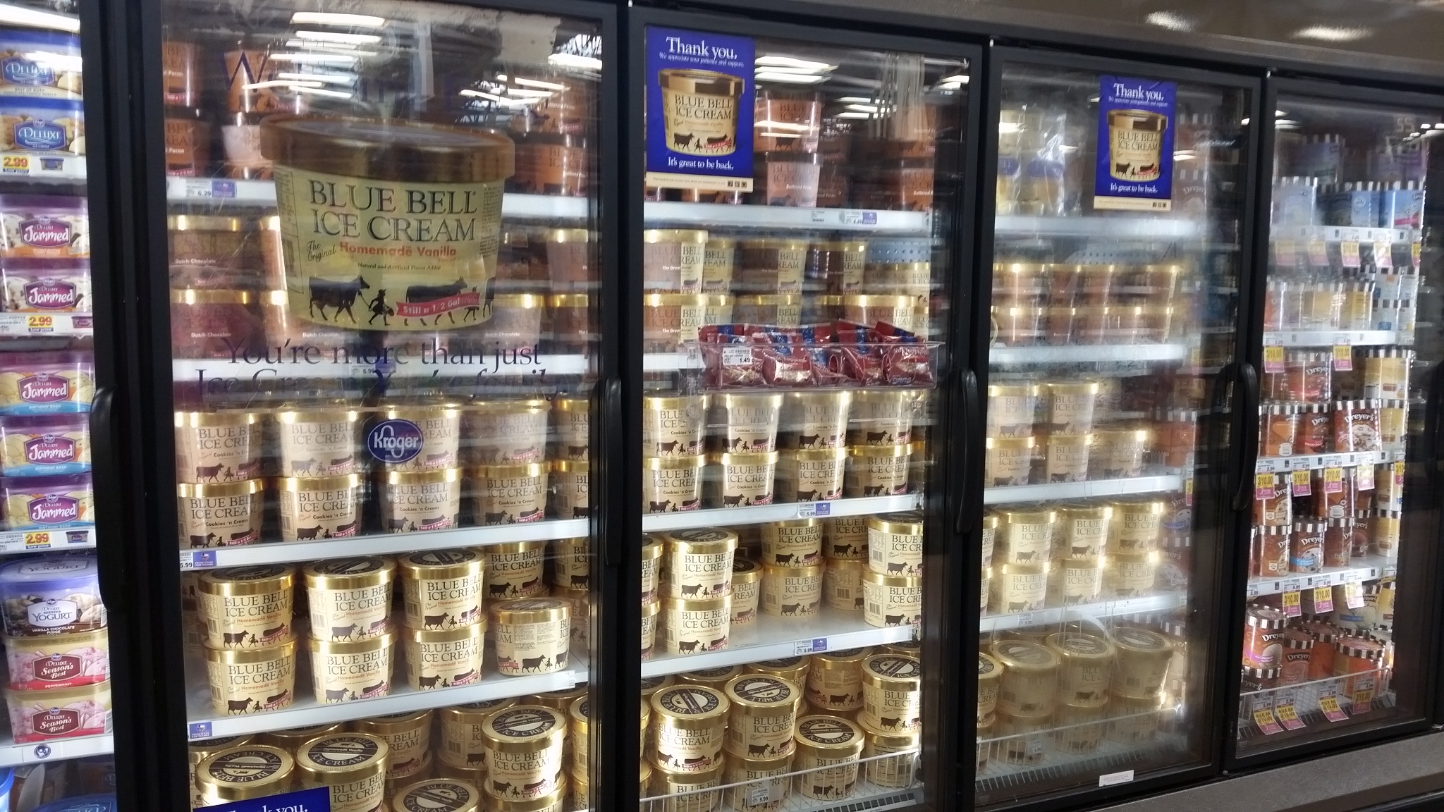 This is the store he got Blue Bell at. These three doors are just half of all their Blue Bell. Notice the sign below asking everyone not to hog up on the Blue Bell!