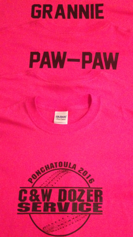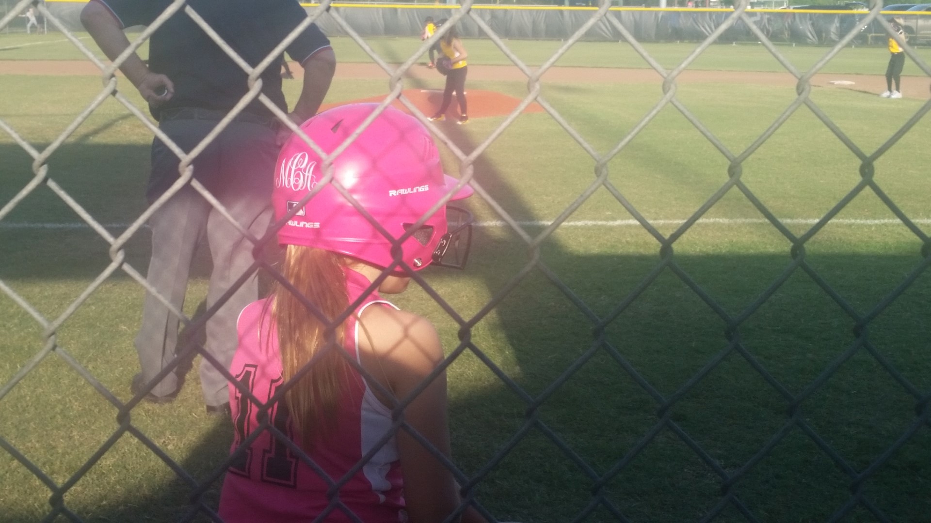 Okay now for Madisyn’s apparel! First she has a hot pink Easton bat, a hot pink glove and best of all, wait for it………………………. Her very own Monogrammed hot pink batting helmet. No one wears it but her and I honestly have to say I’ve never seen a monogrammed on before in my life. They team is sponsored by C & W Dozer Service and I have to say their team having fuchsia as their color is sooooo very Madisyn!