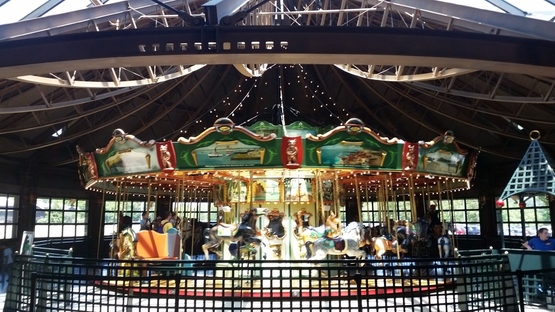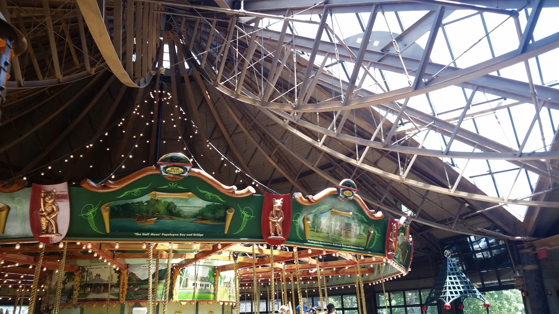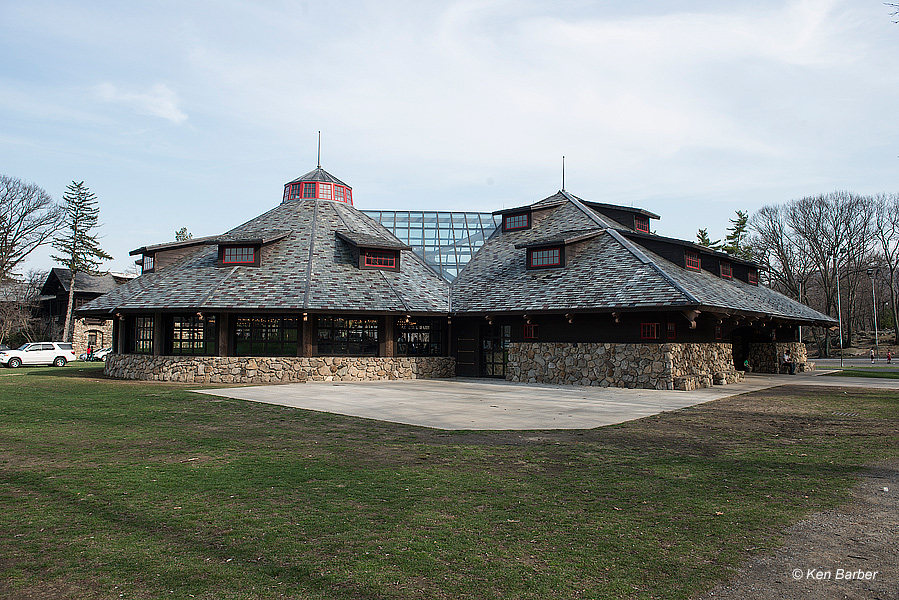 The Merry-Go-Round at Bear Mountain State Park features hand painted scenes of the park an 42 hand carved seats of native animals including black bear, wild turkey, deer, raccoon, skunk, Canada goose, fox, swan, bobcat, rabbit and more. Here are some pictures of the Merry-Go-Round and the building it is in.