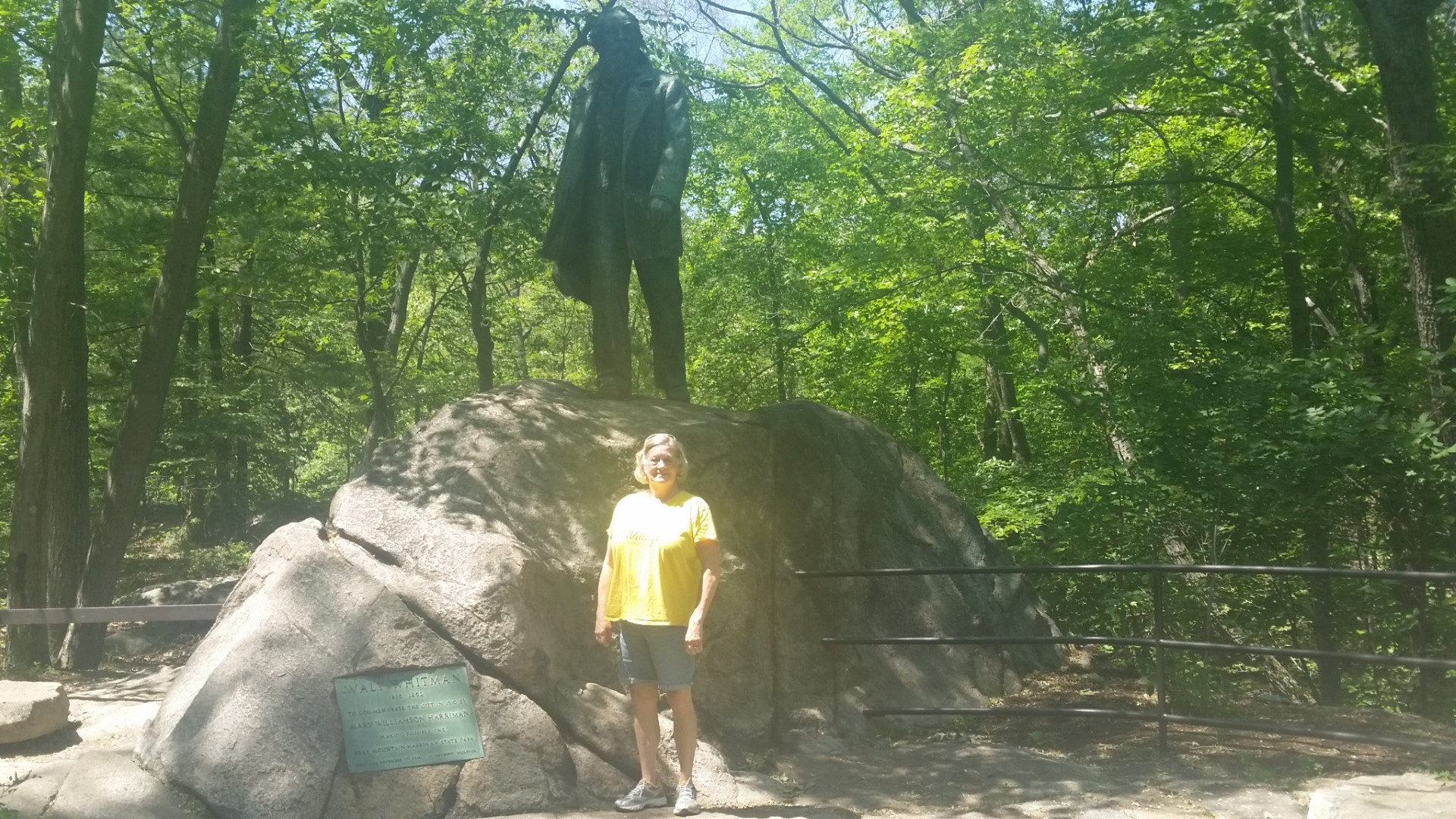 Roy rested while I walked down a bit more on the pathway to the Hudson River. Being the daredevil that I can be I squeezed between two iron fences and went out on a rock to see the river and bridge. Another lady saw me and did the same thing so we took pictures of each other!!!