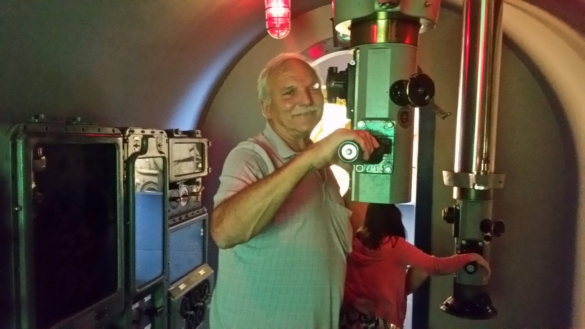 After entering the museum and being welcomed by a nice older man we first visited an exhibit room which is a recreation of a World War II submarine attack center. The attack center has three operational periscopes through which we could see Historic Ship NAUTILUS, the Thames River, and the U.S. Coast Guard Academy. Roy and I both enjoyed that experience. We even found Boots in the parking lot through the periscope!