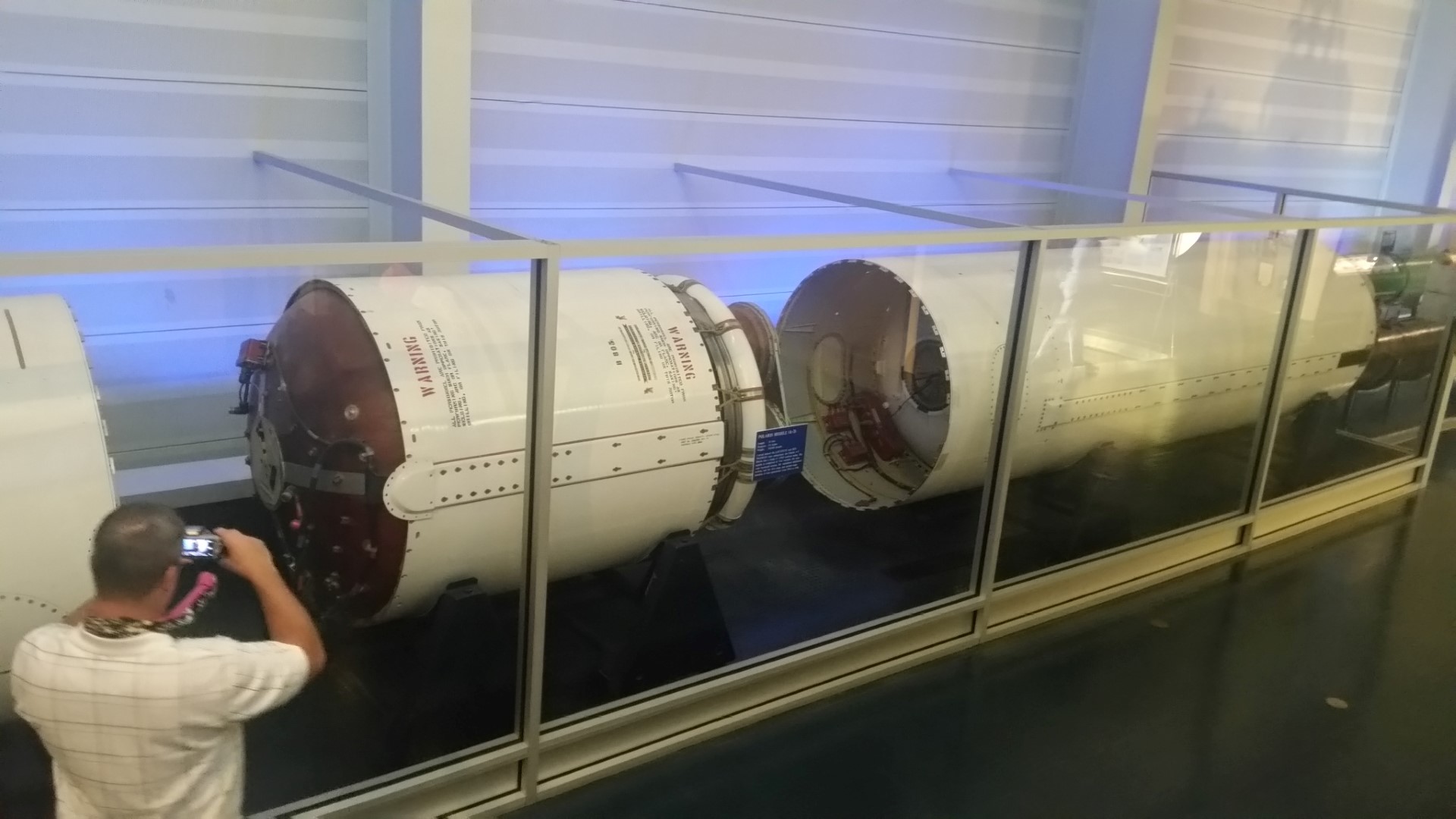 This is the Polaris Missile, A-3` feet long, 35,000 pounds. It is made up of four sections, the nose cone (warhead) section, the equipment (guidance) section, and the first stage and second stage boosters. It was operational from 1964 to 1981.