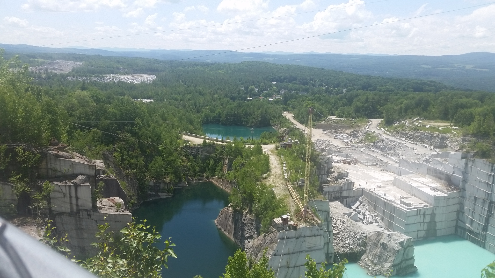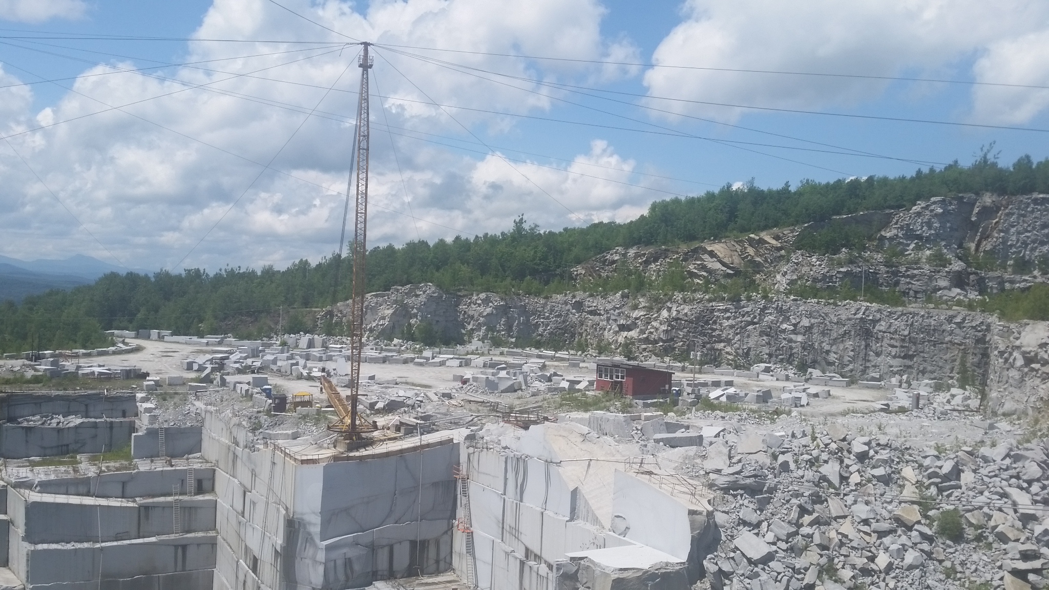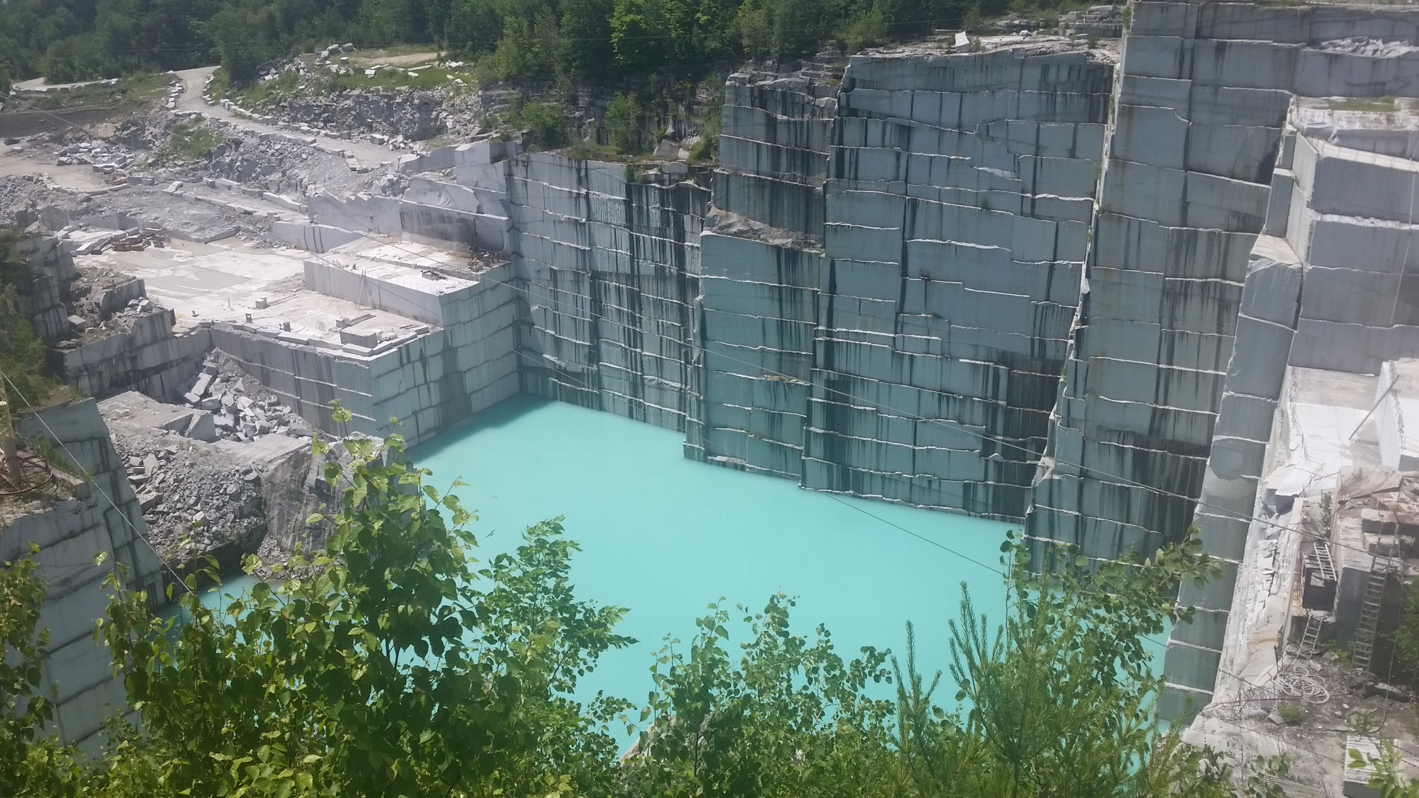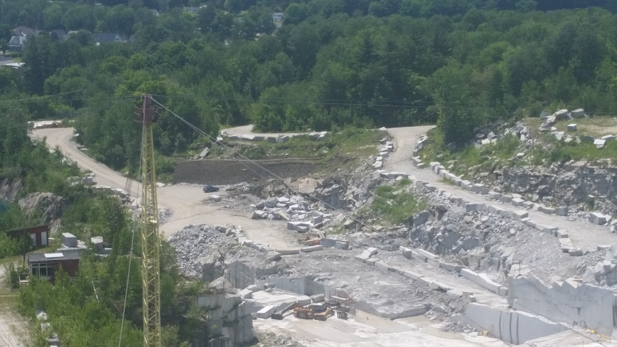 The quarry itself is the world’s largest deep-hole dimension granite quarry, and though 600 feet of its depths are under a well of milky-green water, the quarry is astoundingly huge. The color of the water is a result of the grinding needed to separate chunks of the granite from the bigger mass. The milkier green/blue water is the newest water. The emerald clearer water over to the left is from previous years mining.