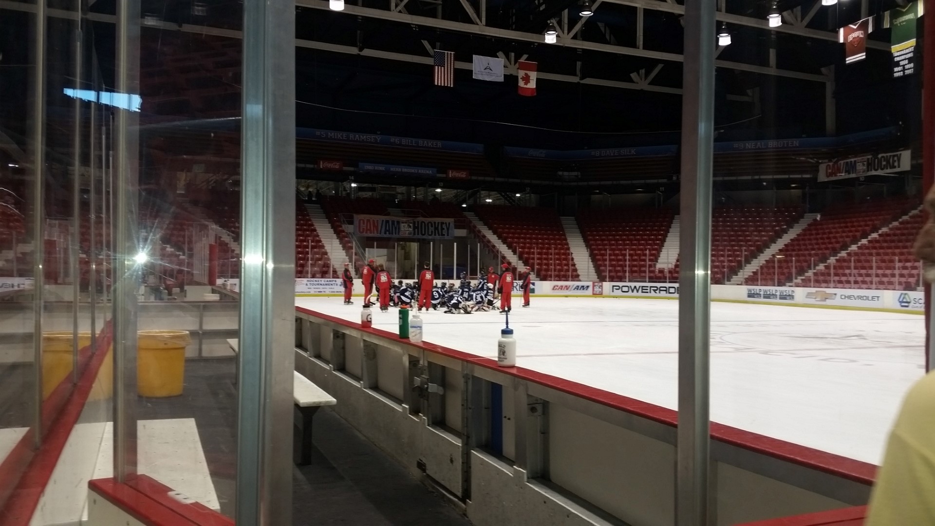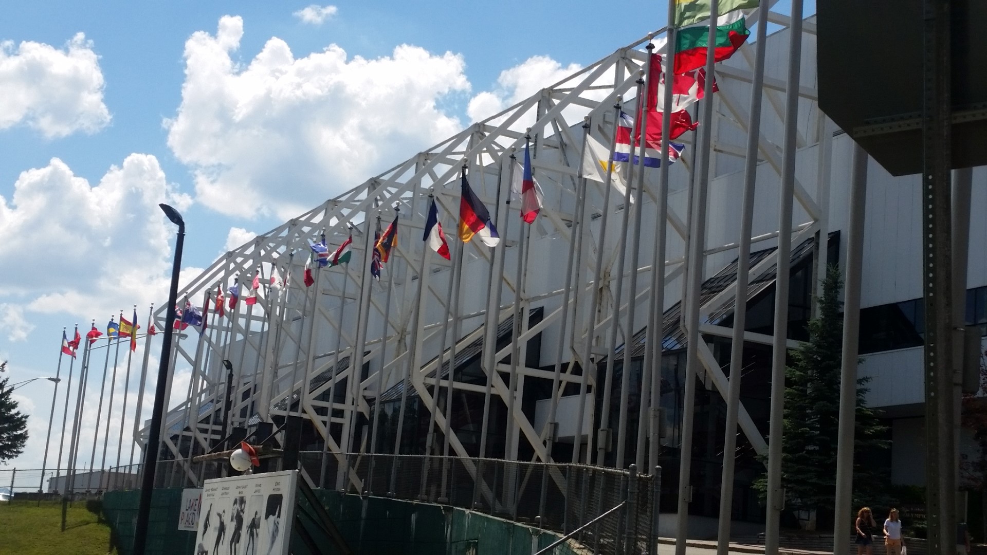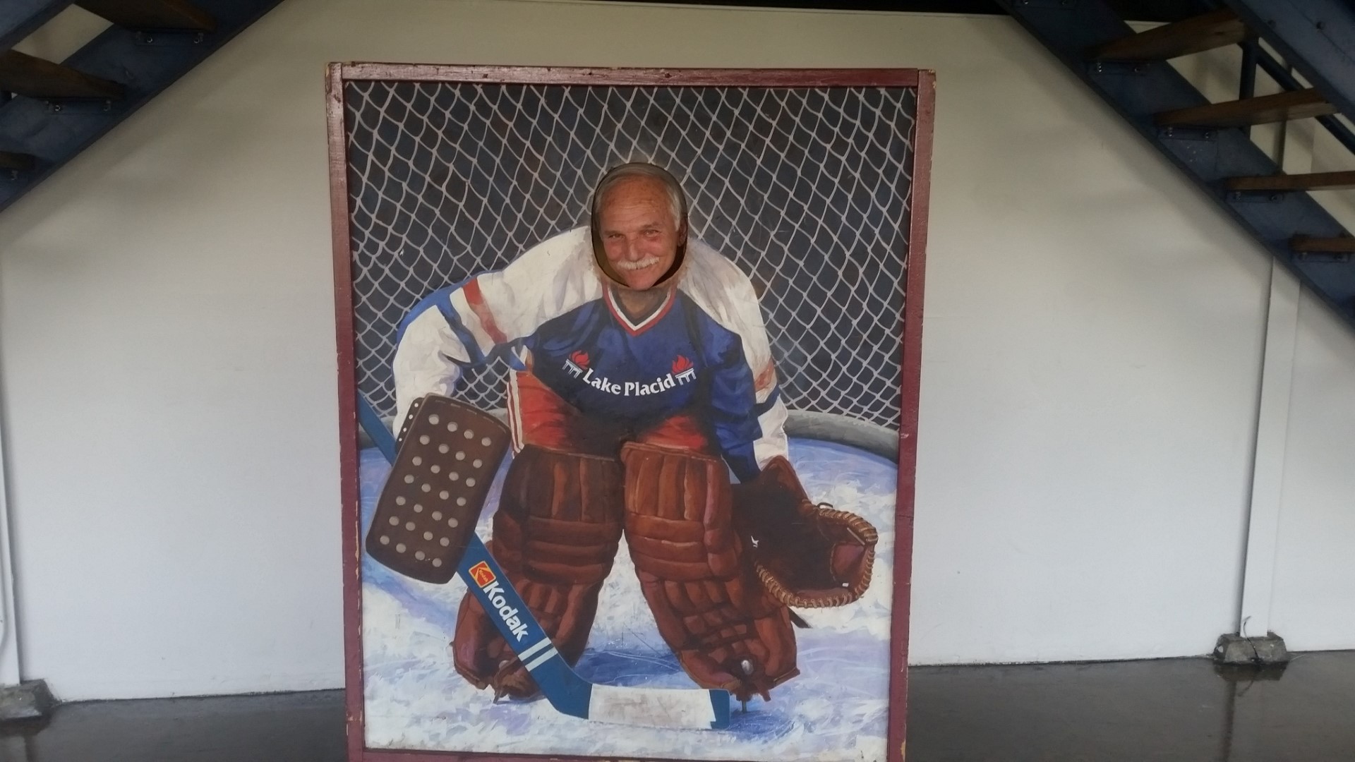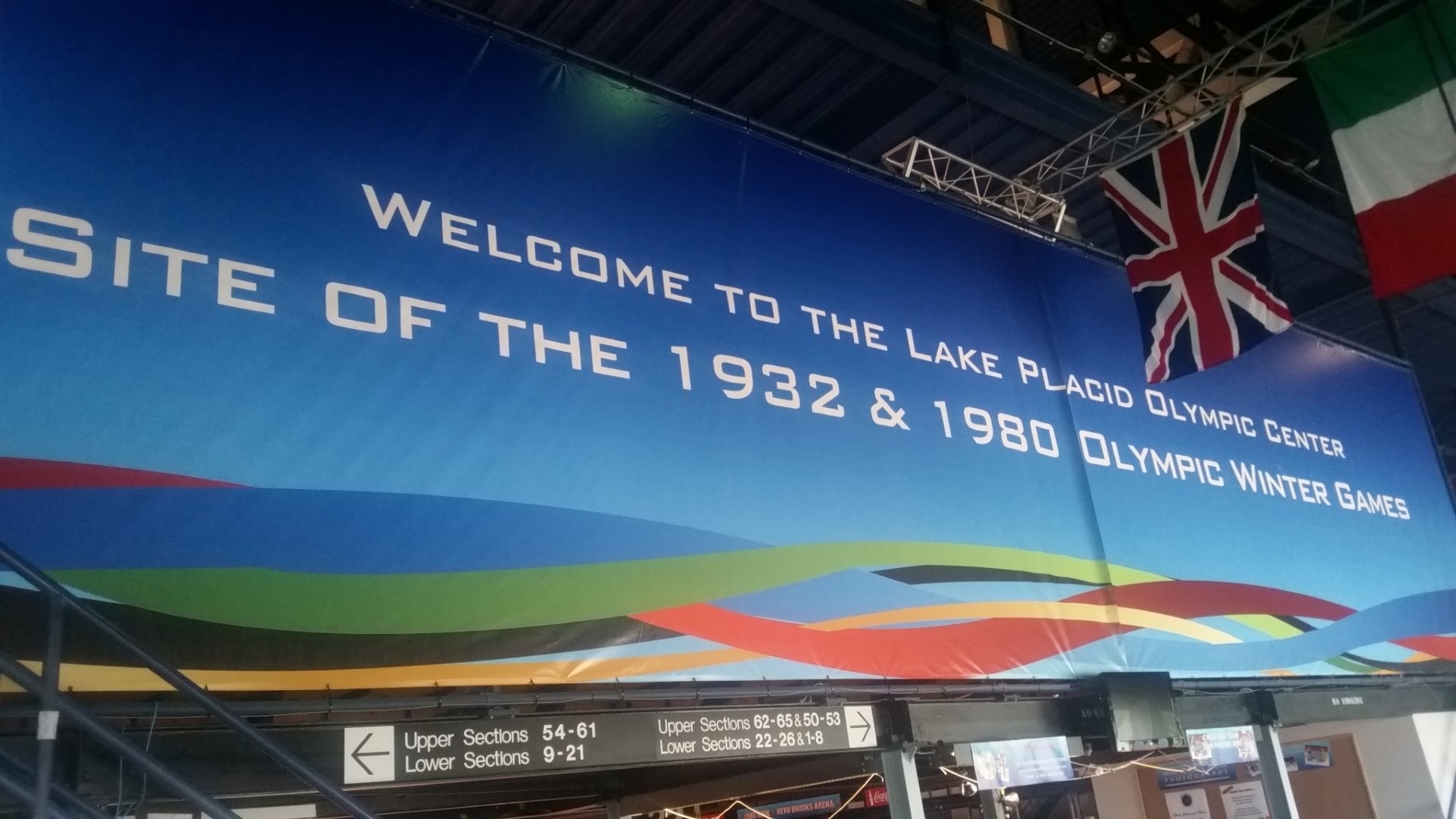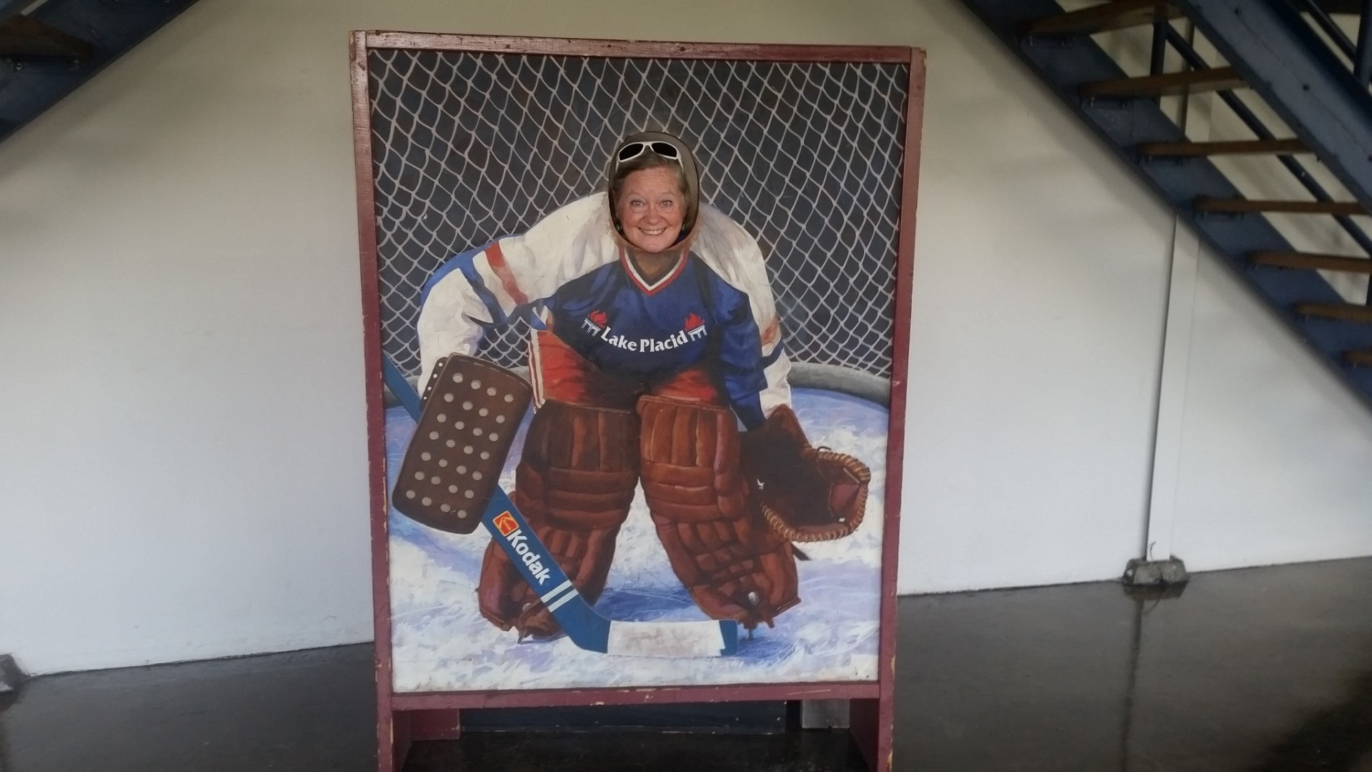 We first went to see Lake Placid where the 1932 and 1980 Winter Olympics were held. We were able to walk through the Olympic Training Center on our own. A nice young man who is an Olympic Hockey player helped us find the ice skating rink. The ice rink is used for both hockey and ice skating. When we were there a youth hockey camp was in progress so we got to see a bit of that. Roy stood in the penalty box (where he sometimes actually belongs) and we enjoyed the coolness of the air coming off the ice. Here are some photos of the training center inside and out.