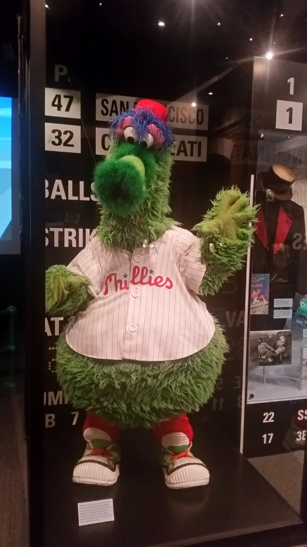 I’m going to end today’s blog with one of the wildest and funny mascots. The Phillie Phanatic is the official mascot of the Philadelphia Phillies Major League Baseball team. He is a large, furry, green bi-pedal creature with an extendable tongue. I’m including him and the Philadelphia Phillies cage showing lots of their memorabilia to say hi to the really nice ladies I had the pleasure of visiting with a couple of evenings ago. They stayed in the spot next to us and we had a really nice time getting to know each other. They are on vacation in an RV and love the Phillies! So thanks ladies for being so nice and we surely did stay away from the Baseball Wax Museum!!! Thanks for the Tip!!