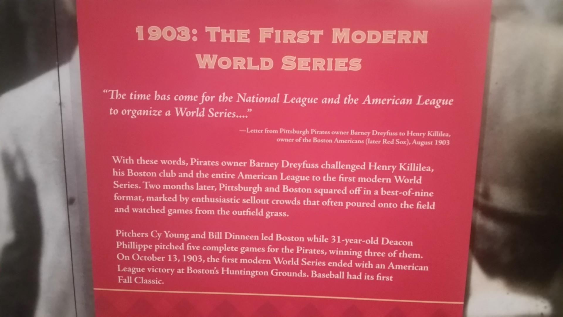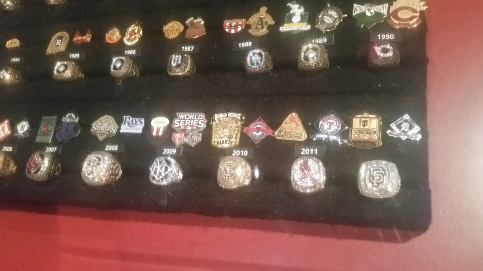 A glass case showed off pins, penants and rings from each year the World Series has been played since 1903. Here a photo of some of the recent years and information about the 1903: The first modern world series.