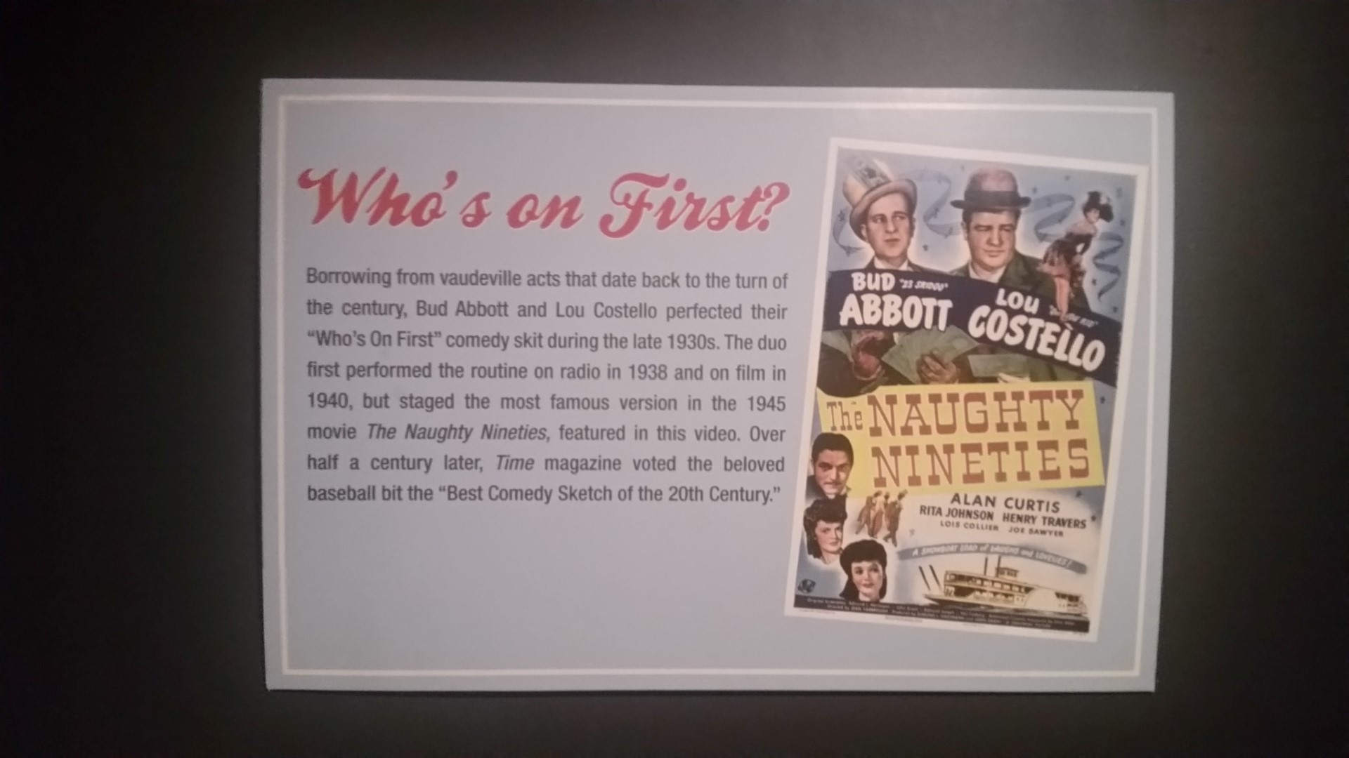 There was a special room where the Who’s on First video was shown. If you have never heard the Who’s on First hilarious story, or haven’t seen it in a while, here’s a link to it: Click here