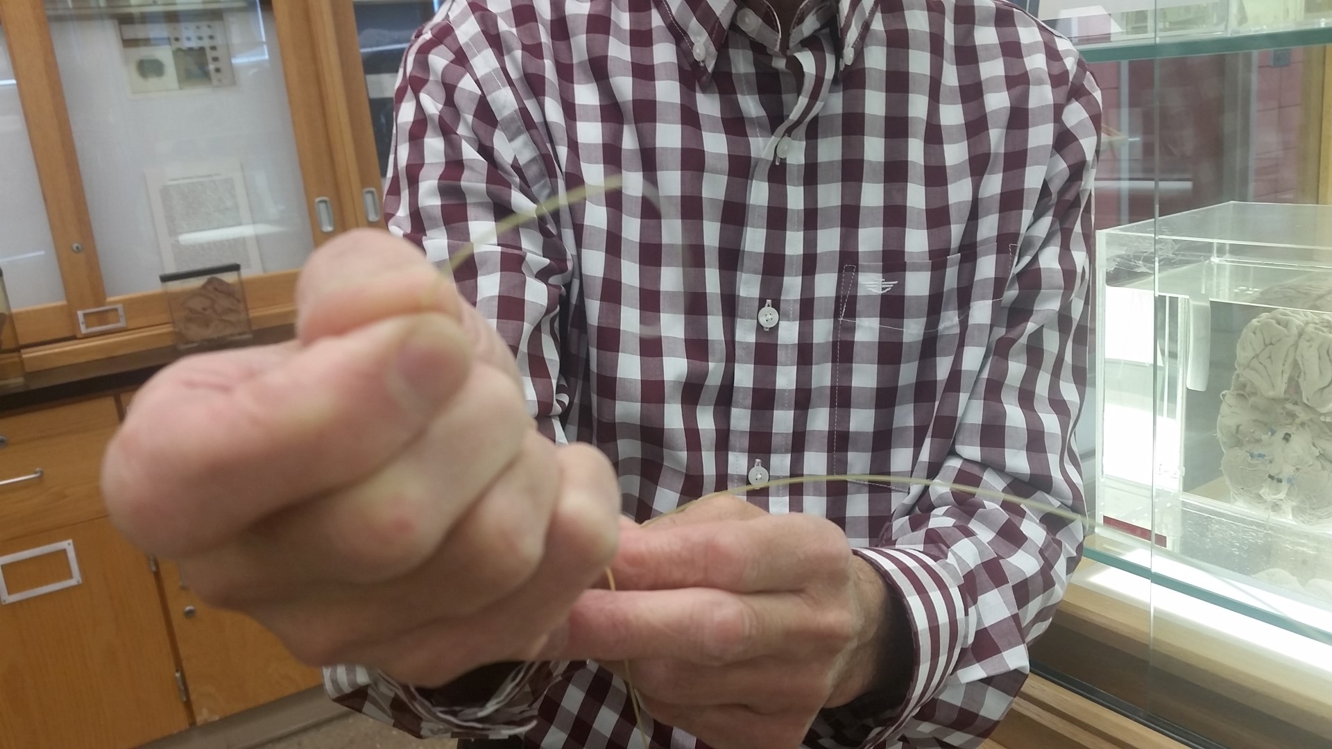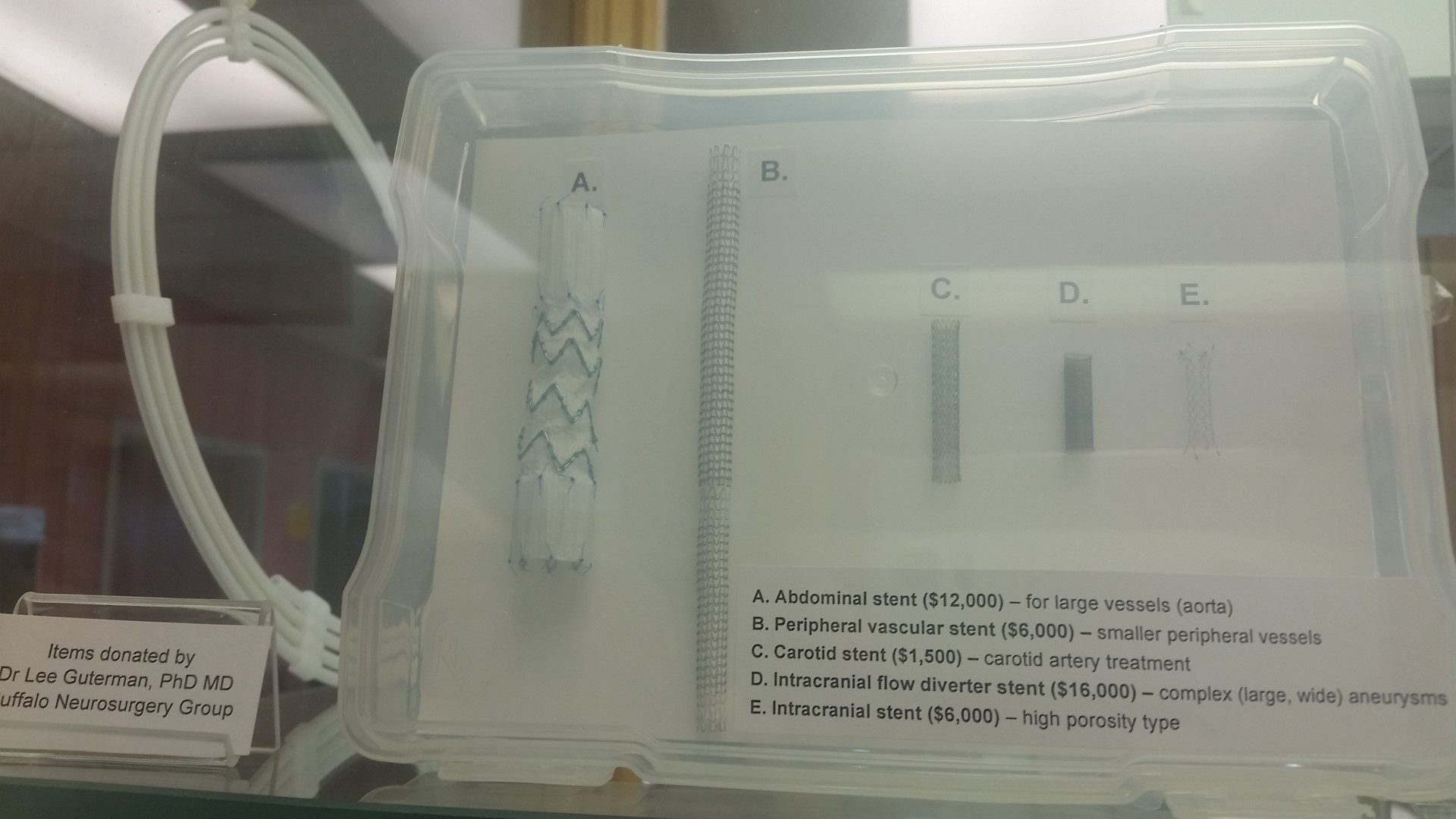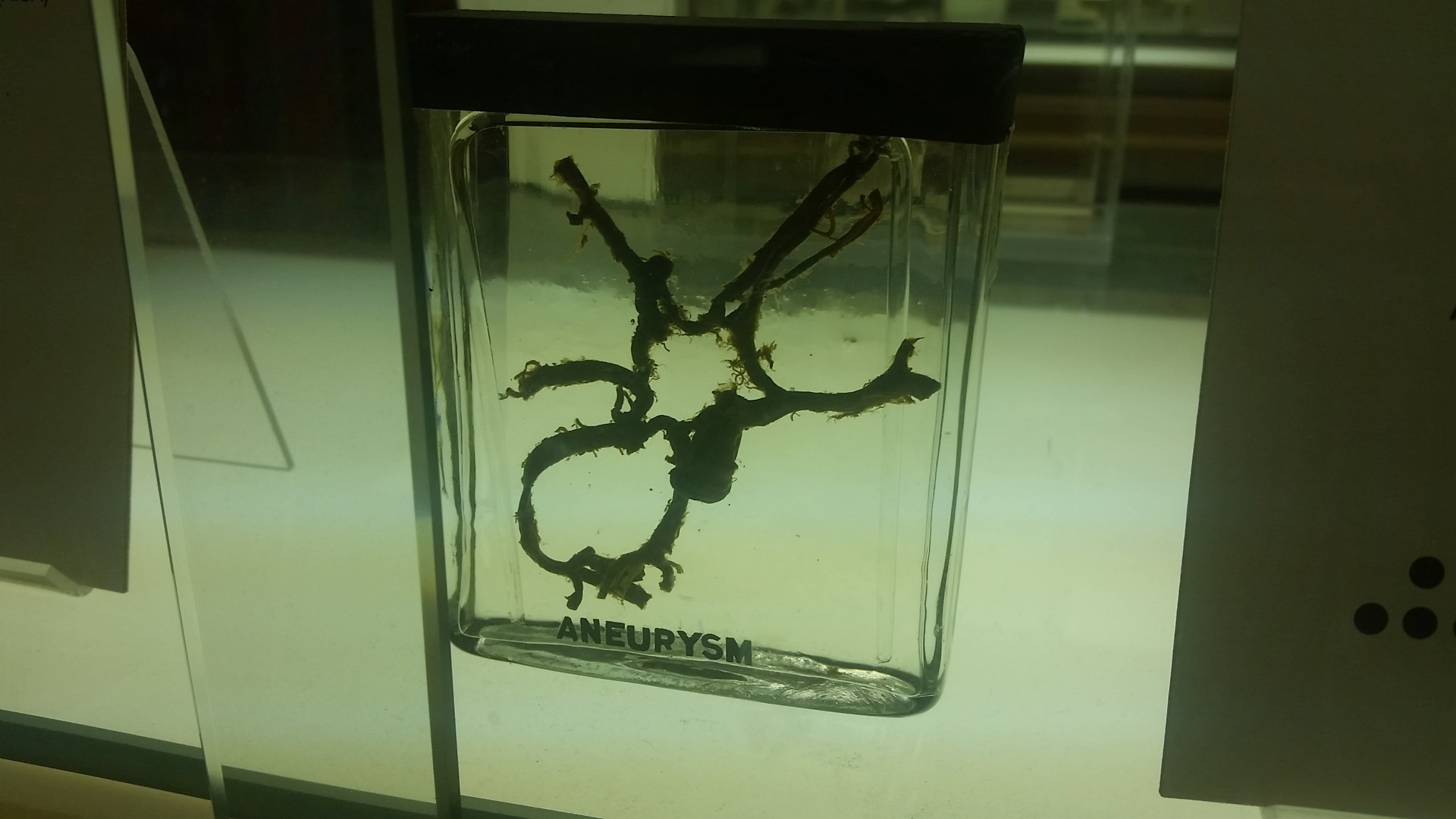There is a section in the museum about aneurysms with examples of aneurysms on brain parts and in a blood vessel. There was a small display that showed what abdomen, heart and brain stints look like and how much they cost. He opened up the showcase to take out the tubing with wiring in it that is used by neurosurgeons to get to damaged brain parts. He pulled the tiny wire out of the tubing and then pushed what’s inside the wiring out. Wow, it could get into even the tiniest of spaces.