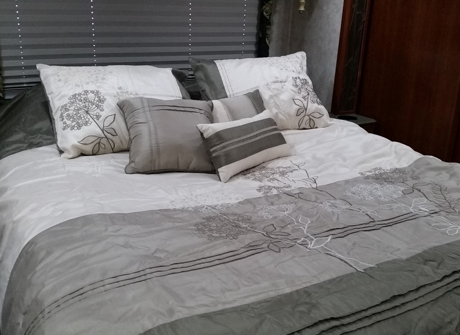 After staying inside for several days not feeling well I got so antsy that we went out for some fresh air and some retail shopping therapy. We’ve needed a new bedspread since we purchased the RV and today we found one we both like! It is sort of grey but picks up the sage color in our bedroom and looks great with everything in that room.