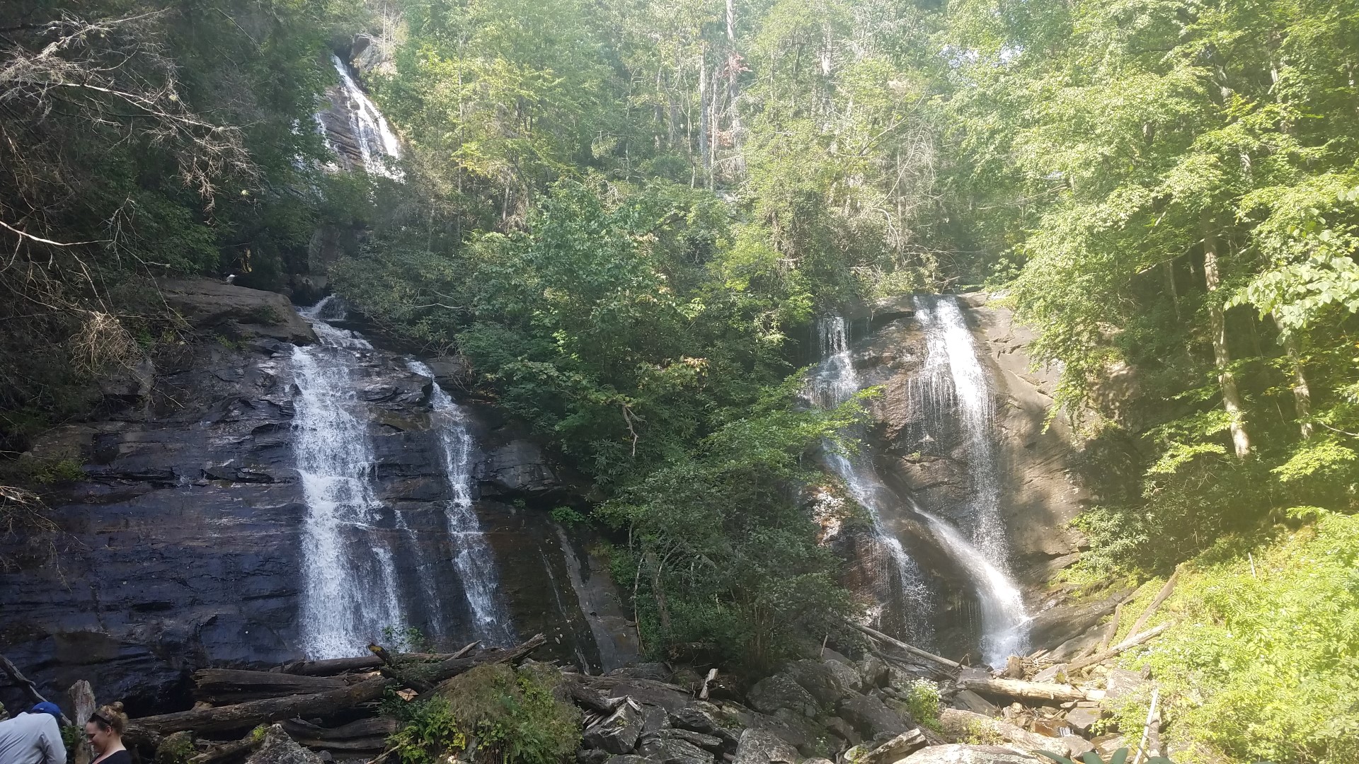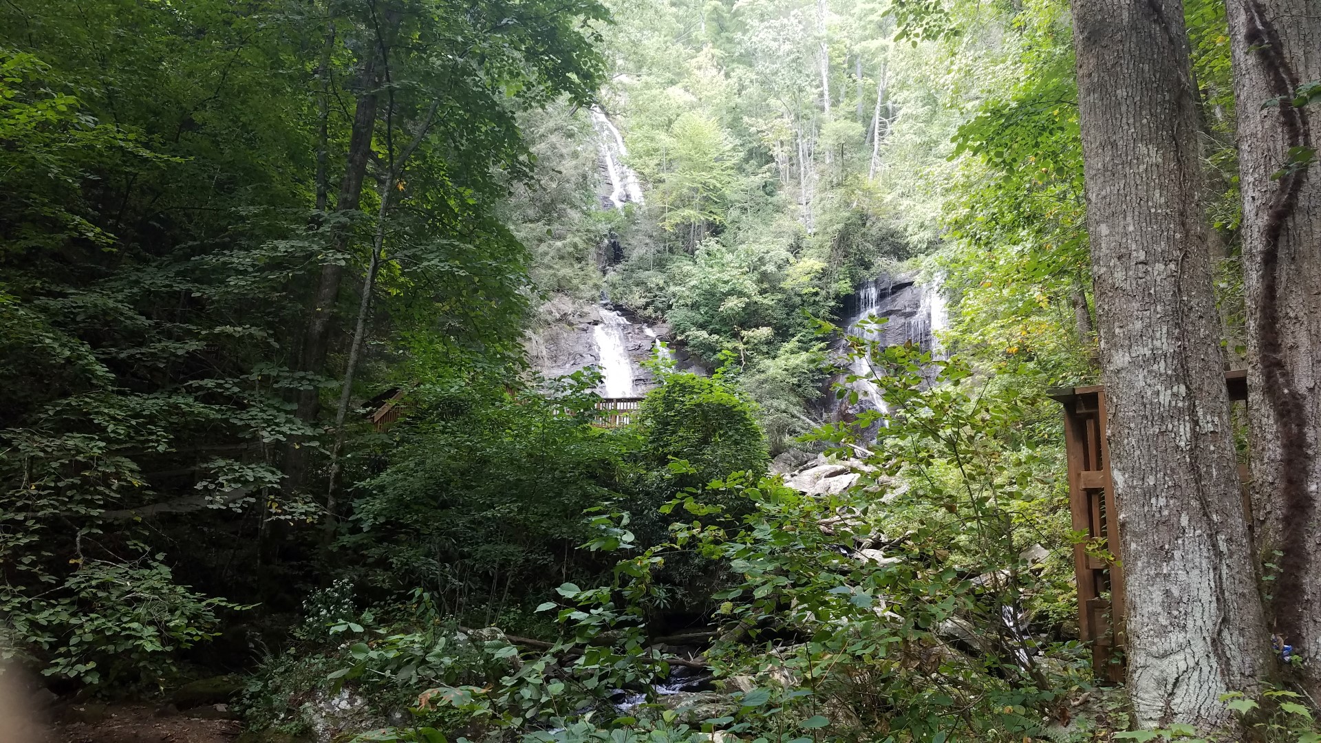 These beautiful falls are located in the Chattahoochee National Forest. There is a $3 per person park entry fee wich we did not have to pay because we have a Senior Pass for National Forests and Parks. The water cascading over the drop offs is created by two creeks. The Curtis Creek falls drop 153 feet and the York Creek falls are a much shorter but still spectacular 50 feet. The water at the bottom of the falls is then considered to be part of Smith Creek which flows into and forms Smith Lake – the centerpiece of Unicoi State Park.