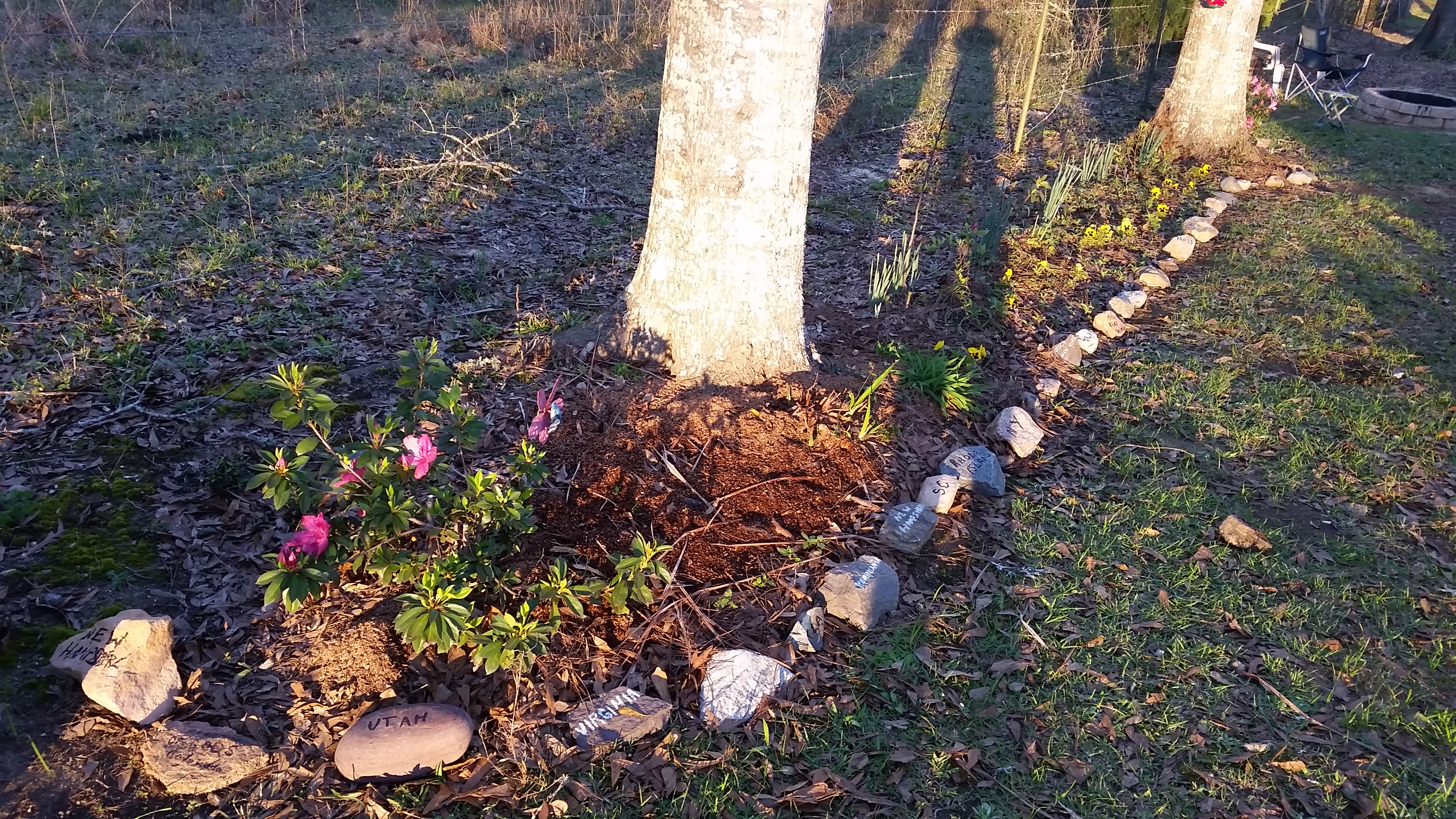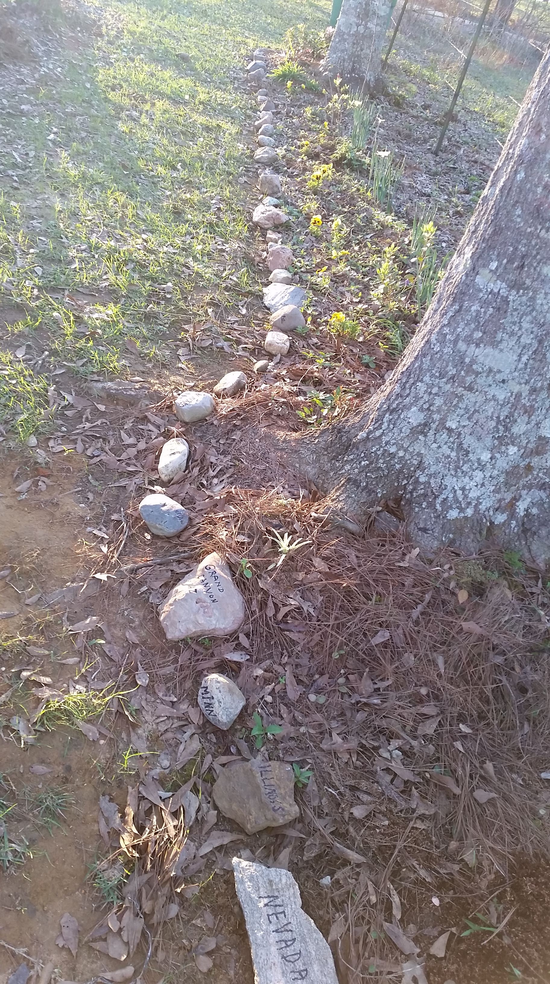 I spent some time pulling weeds from around my flower gardens and rewrote names of states on our medium sized rocks we’ve collected in our travels. It got down into the 30s last night so I’m glad I piled pine straw on lots of the delicate plants. Click on the photos to see the rocks with all the states names on them. This is one of my favorite adventures when we travel, collecting rocks!