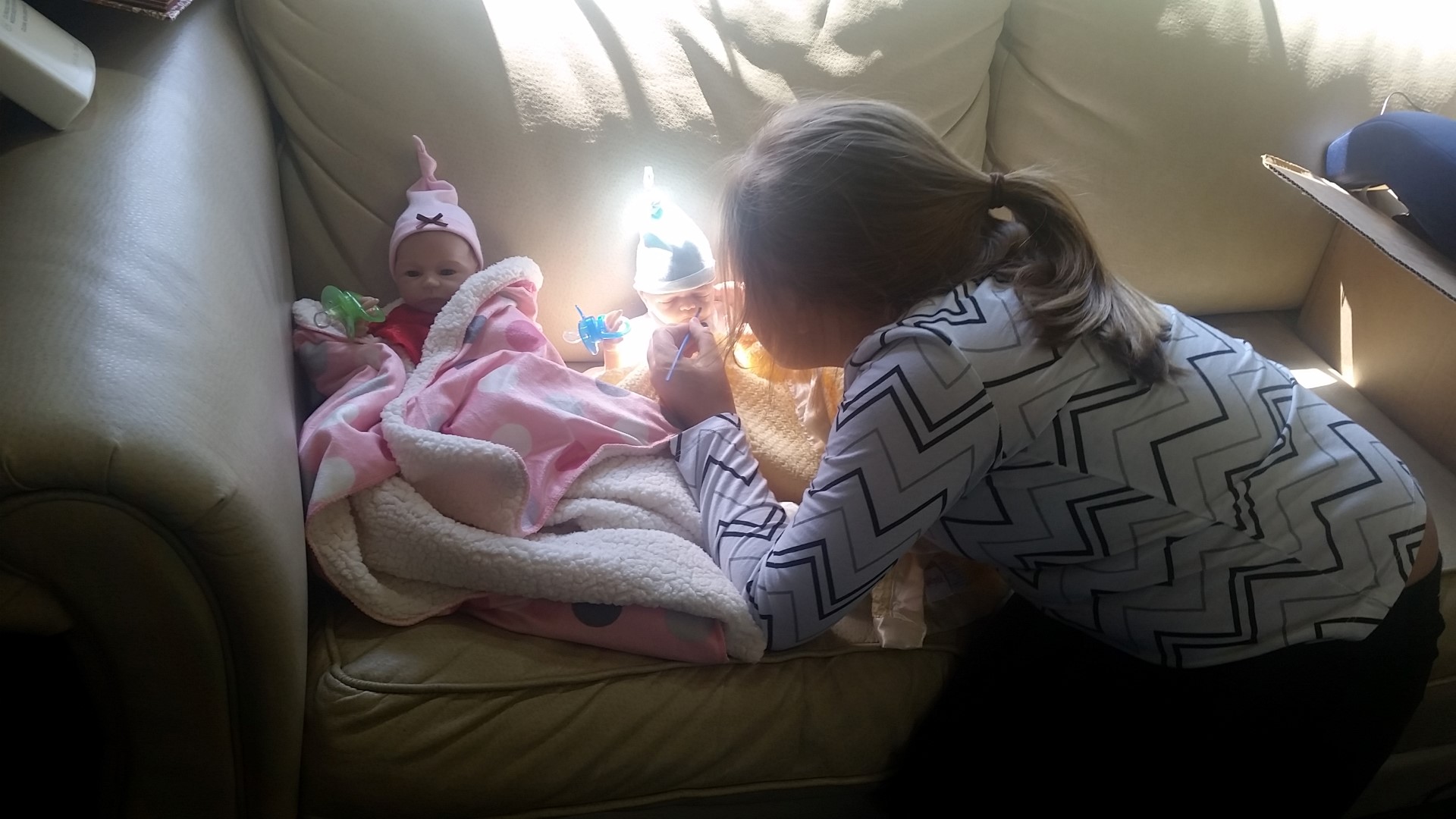 Madisyn has these two little baby dolls that she treats like her very own real children. They go everywhere with her (yes even the bowling alley for her birthday.) She spent all the cash presents she got for her birthday on clothing for the babies. They are very well dressed. They came with her and before we could start our chocolate fun she changed the babies out of their sleeping clothes and put them in their day time clothes, propped them up on the sofa to watch us and then we got started!!! She’s using one of her paint brushes to clean something off Mason’s eyelashes in the first photo!!!