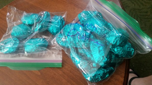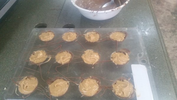 Progress continues on my Easter chocolates. Here’s some peanut butter cups after the bottom chocolate and center peanut butter mixture but before it’s sealed up with a chocolate bottom. Yes I am quite messy and yes they are far from the perfect ones you purchase!