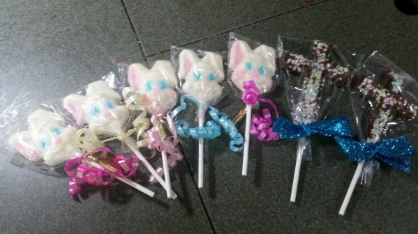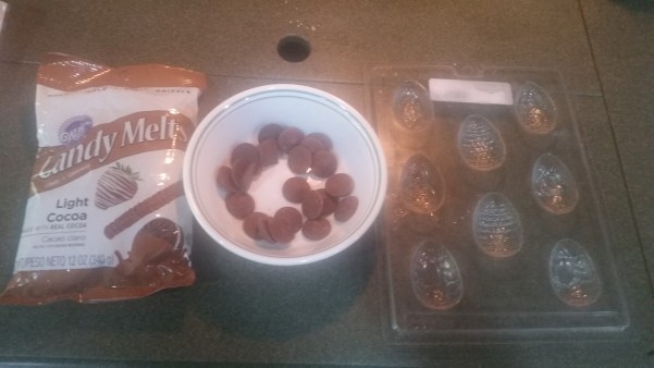 Progress continues on my Easter chocolates. Here’s some peanut butter cups after the bottom chocolate and center peanut butter mixture but before it’s sealed up with a chocolate bottom. Yes I am quite messy and yes they are far from the perfect ones you purchase!
