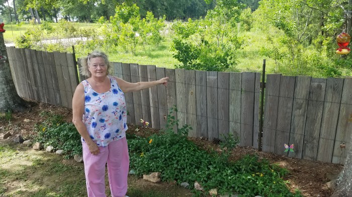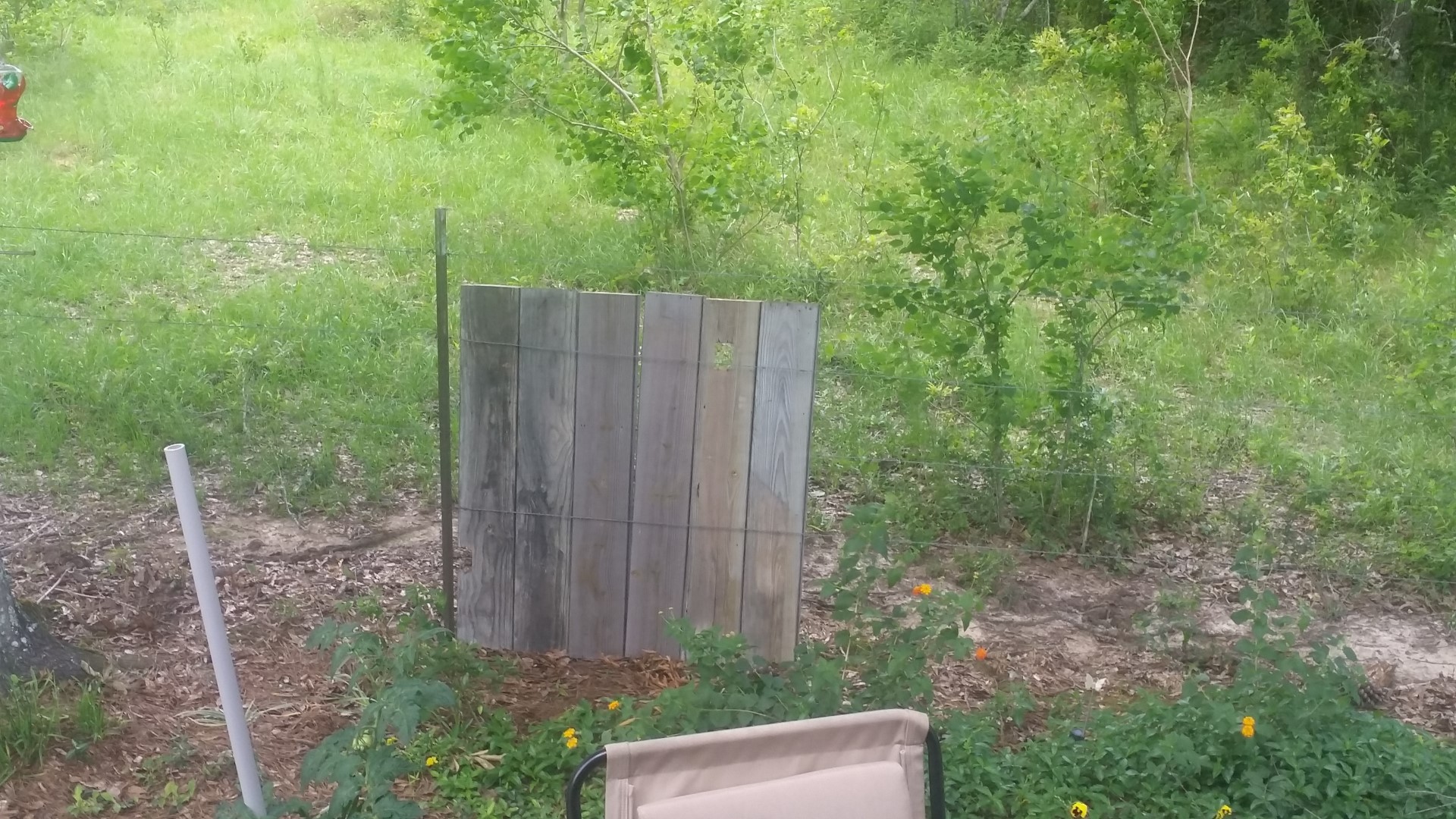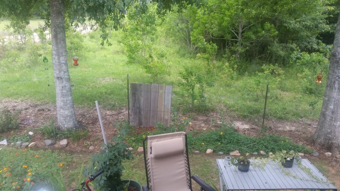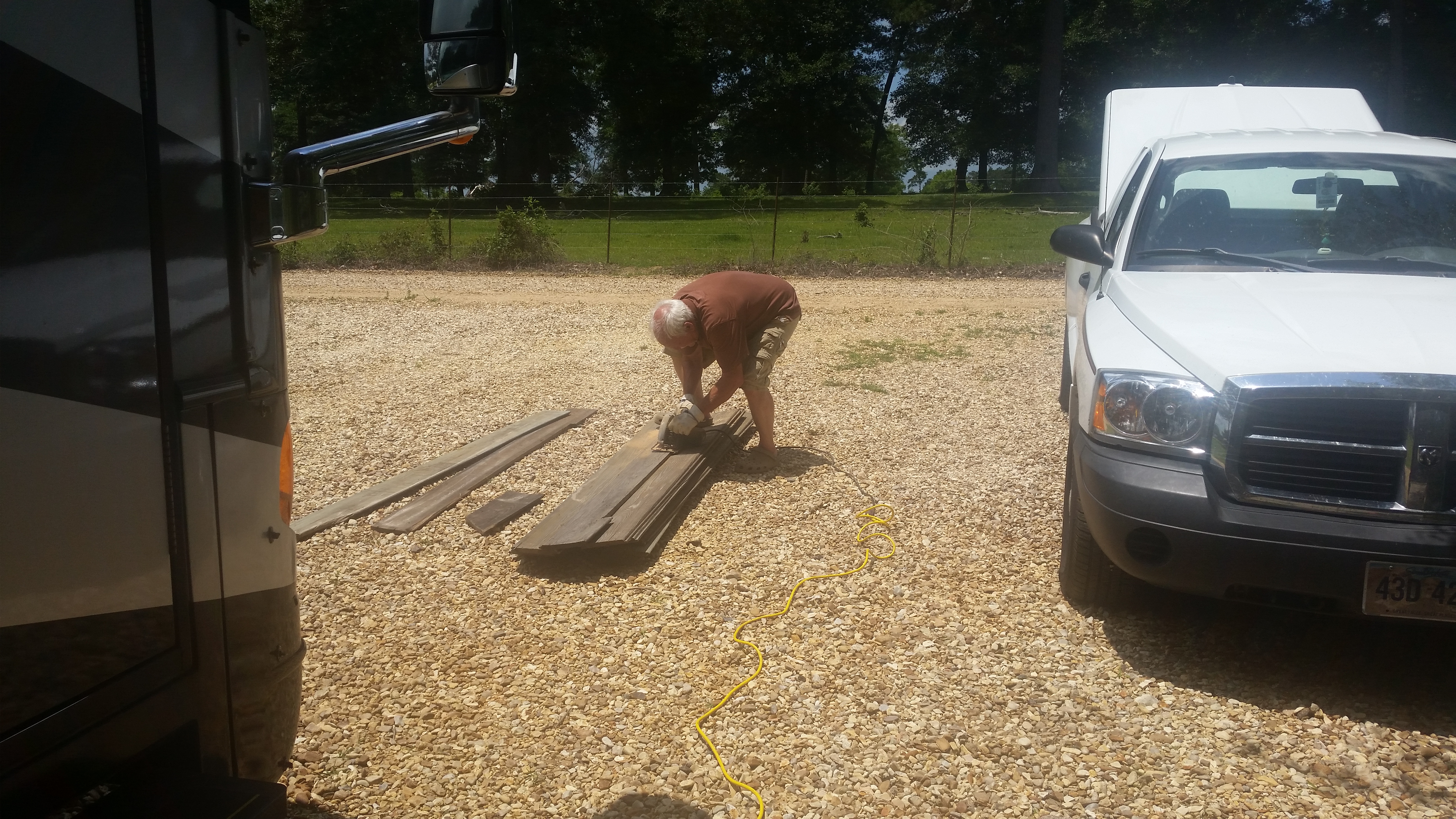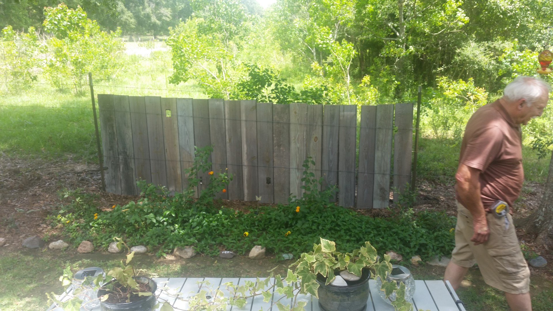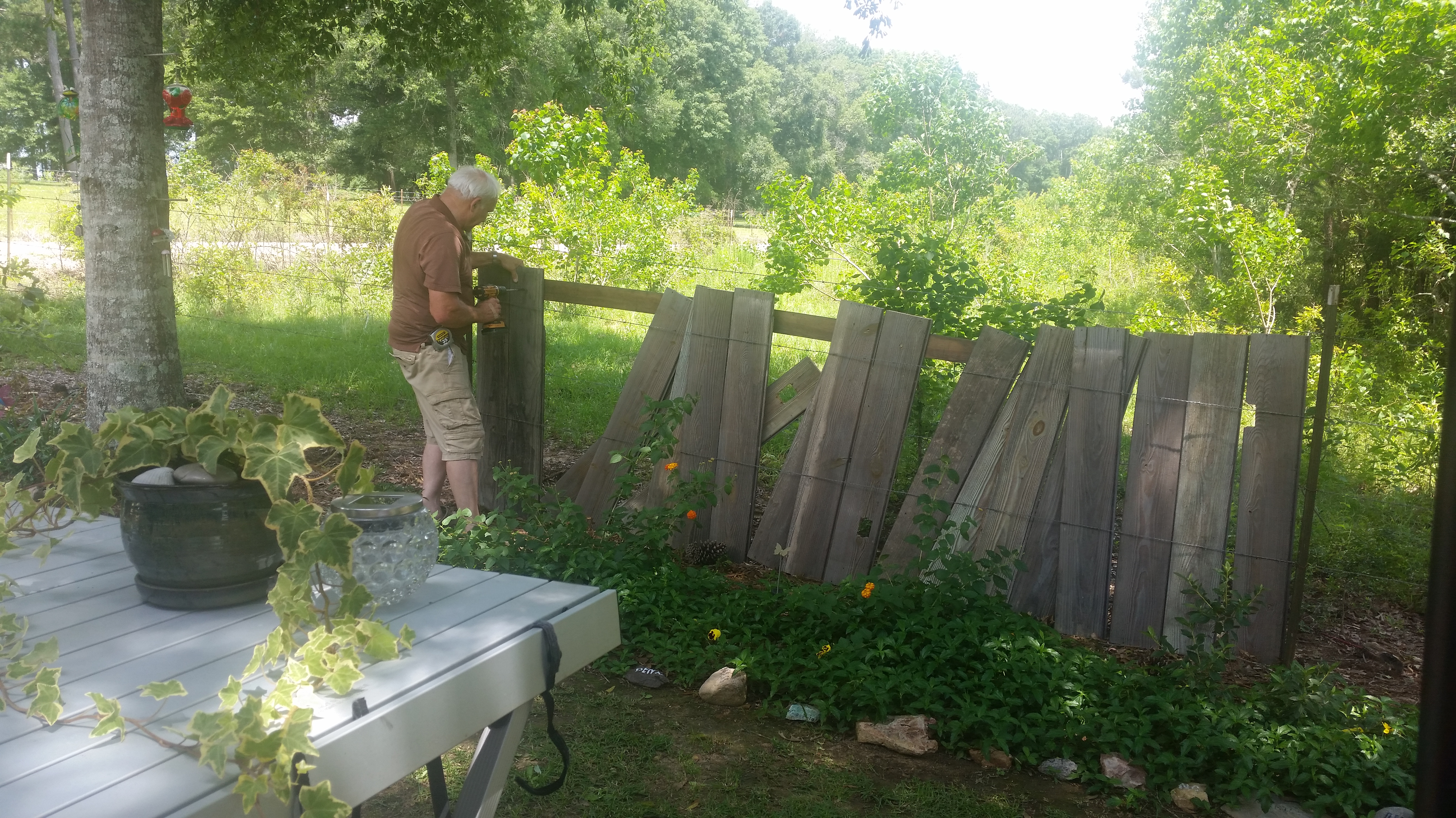 Roy’s helper when he was restoring houses, Jeff Mader, brought to us a stack of boards. I have wanted a rustic quirky fence behind our flower gardens (and to block off seeing the cow poop!). Roy found these in Baton Rouge. He cut them all in two and weaved them into the wire of the existing fence. With no saw horses and a borrowed saw he got to work.