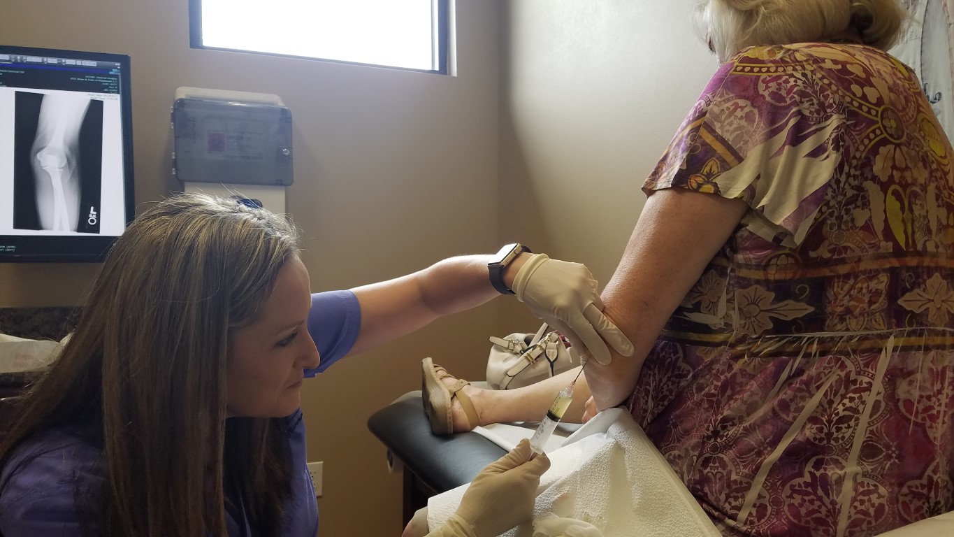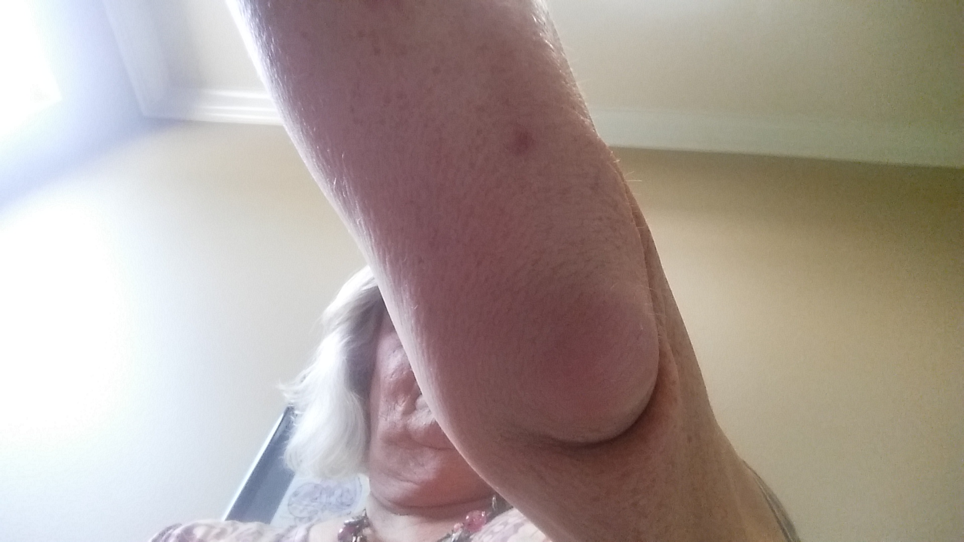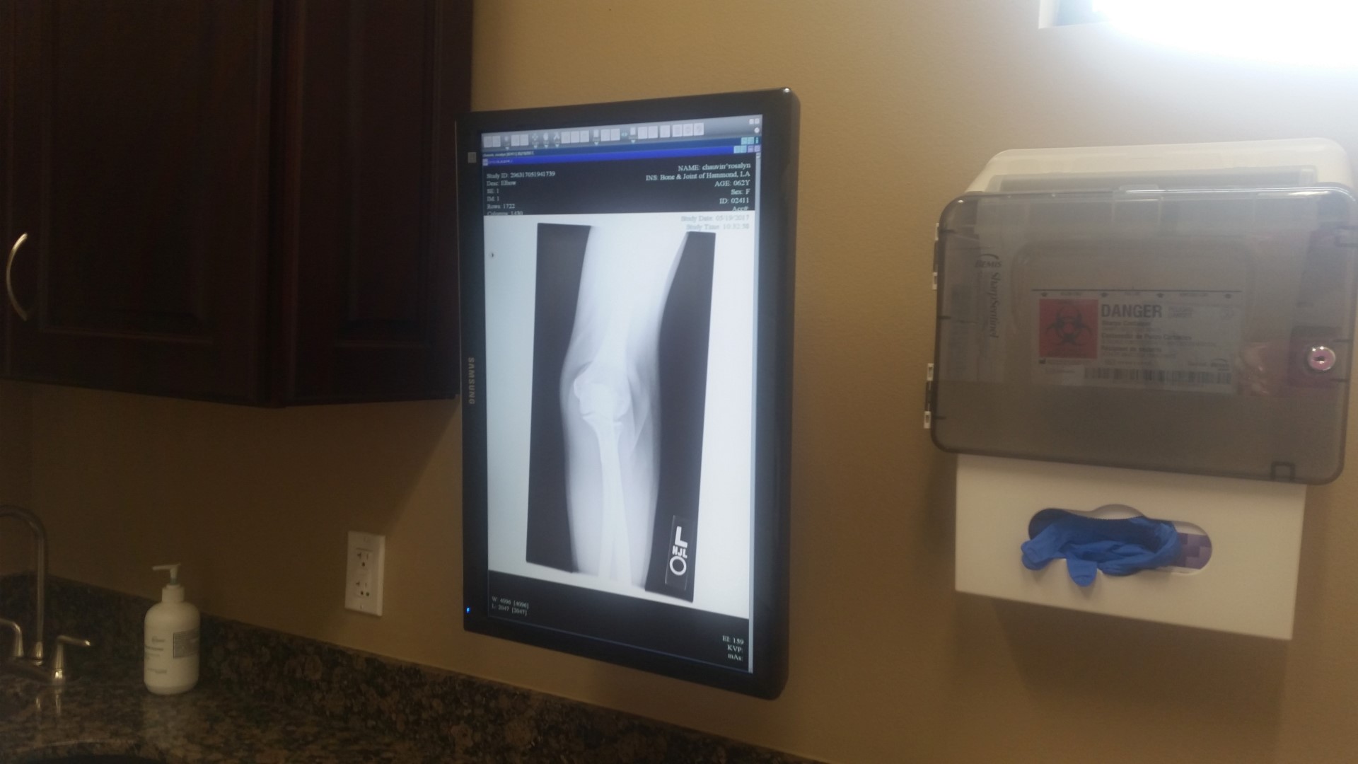 We went from there over to Dr. Brett Chiasson’s office for them to check my big, bad, ugly elbow. It started hurting while I was in the hospital and over time has swollen becoming very tender to touch and painful to move around. I’ve had this a couple of times before and Dr. Chiasson drained the fluid off of it. I made an appointment to go this morning after the blood work. The took an x ray, touched it a lot and asked a bunch of questions.