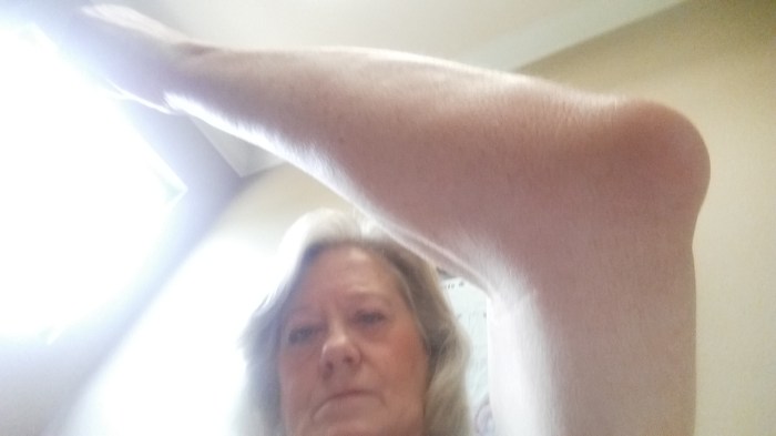 She asked me if I had injured it and I said no. I didn’t think about when I fell on the floor when I passed out. A young friend of facebook mentioned that to me and both Roy and I agree that’s probably what caused it. They numbed it, drained it and shot it full of steroids. It’s wrapped up tightly now to reduce the change of it filling back up. Even with the steroid shot it is still very painful. Grrrrrrr. While we were there I got another steroid shot in my right knee since it’s begun hurting again.