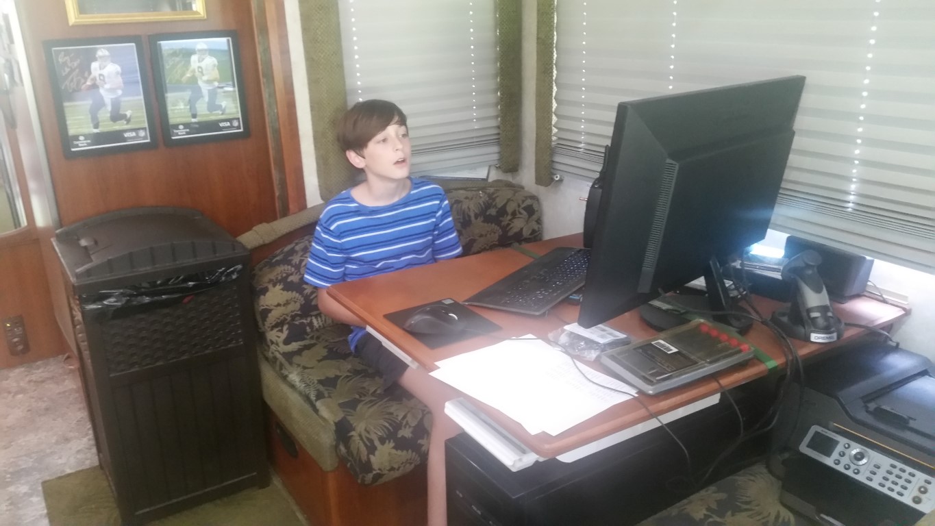 After we visited down by the pond we moved up to the patio by our motor home. John and Sally enjoyed playing inside (in the cool a/c) for a while. Roy has a flight simulator on his computer that John did great with!