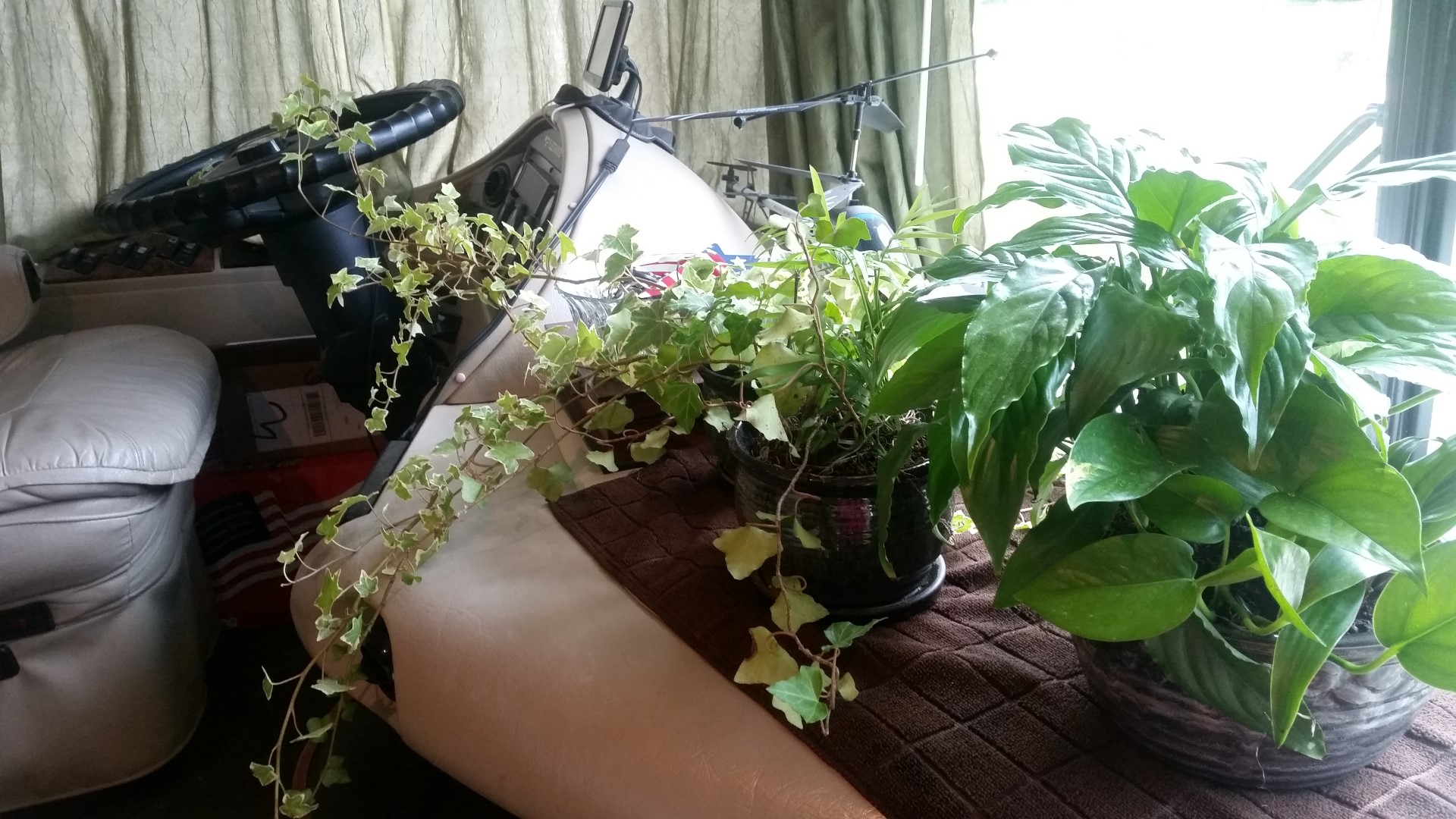 All the plants that travel with us! Roy made me move the one with the long vines before we got going! He said he could just picture it wrapping itself around his legs as he drove!