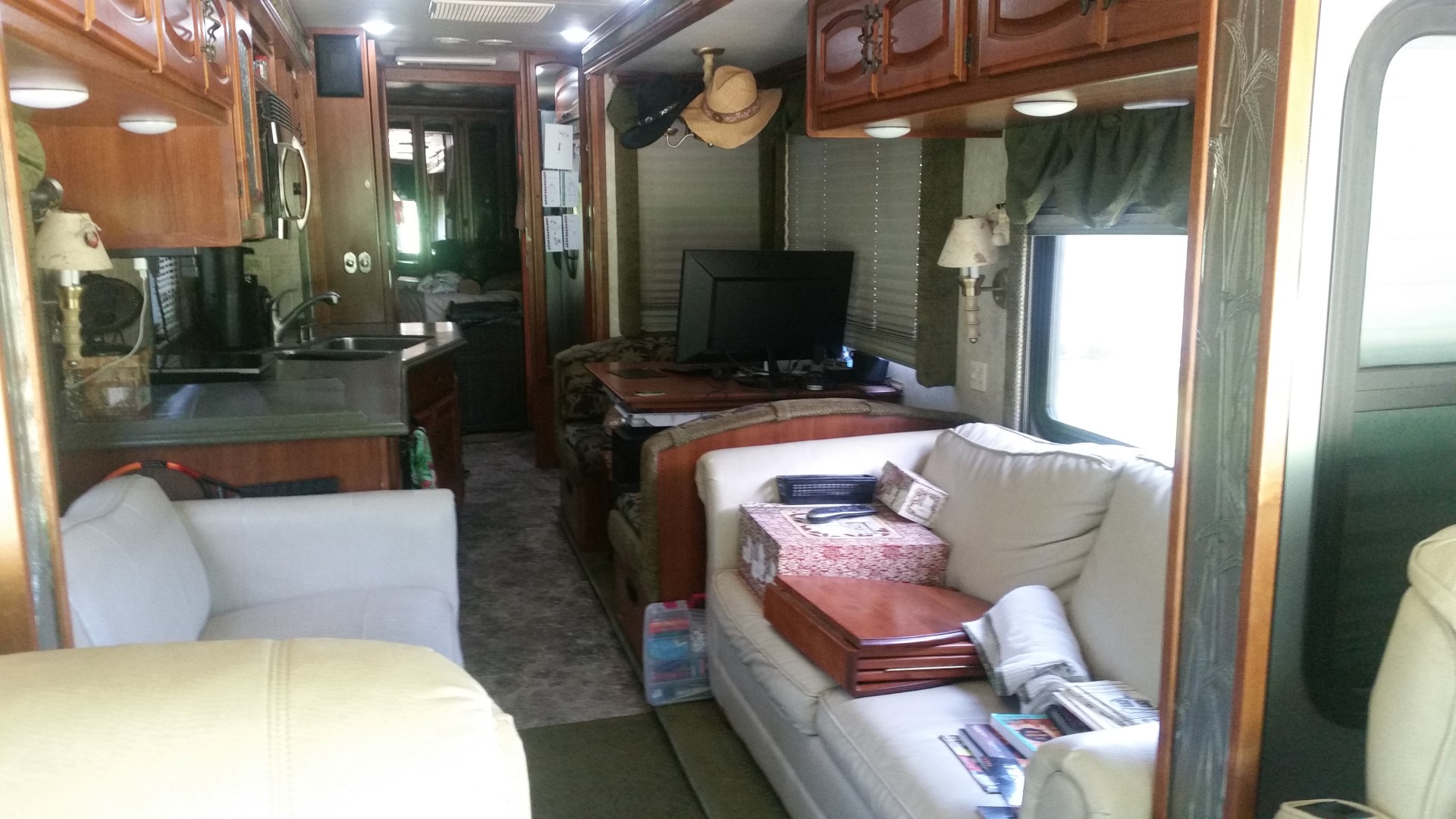Most people who have visited us always see Dora, our motorhome, with the slides all the way out. That adds a good 6 feet to the width but without the slides being out this is what it looks like. We have enough room to move freely through the motorhome but I’m surely glad we get to put the slides out when we are parked somewhere! Everything gets piled on top of the sofas and the bed for traveling. It pretty much all stays in place. Every now and then a kitchen drawer will open when we turn but then it usually closes back up when we turn a different way!
