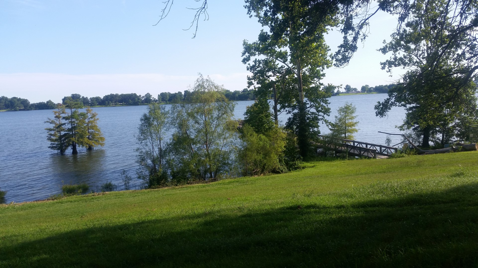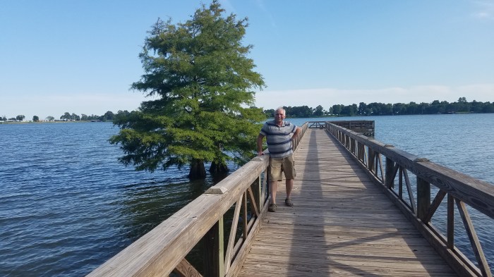 Roy drove 225 miles today. That would normally take 3.5 hours but we tend to stop a lot and look at things so as usual it took us 6 hours to get to Lake Village, Arkansas. We are staying just one night at Chicot County RV Park which is on Lake Chicot. Lots of green grass, oak trees and very quiet! We walked to the Lake and discovered a fishing pier there that we took a walk down. It’s a good distance down the hill to the pier and after walking back up that hill I realized I need to build up more stamina before tackling a lot of climbing and walking. Here are some photos of our time out on the lake.
