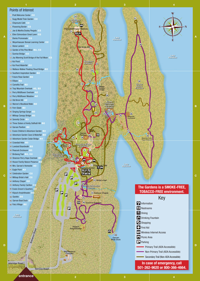 The Gardens are open February 1 through mid-November 9 a.m. – 6 p.m. Admission for adults is $15 each. The map on the left shows the whole gardens. We made it through about 2/3rds of the gardens which is pretty good for our first outing in several months!