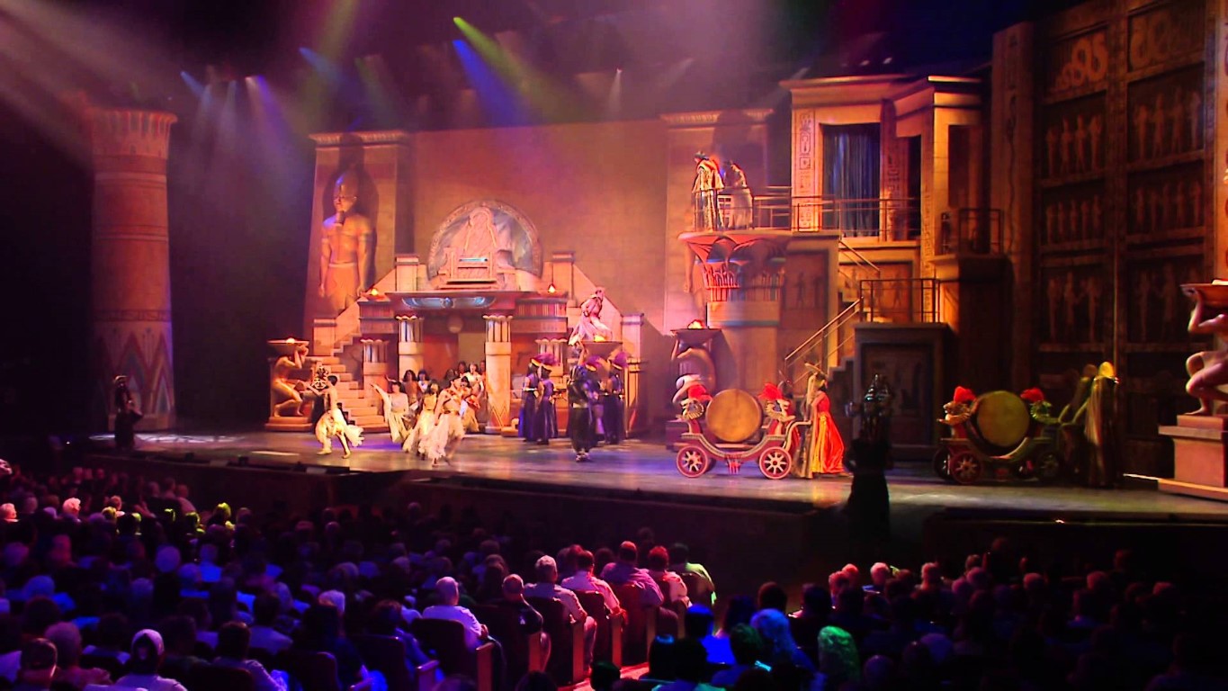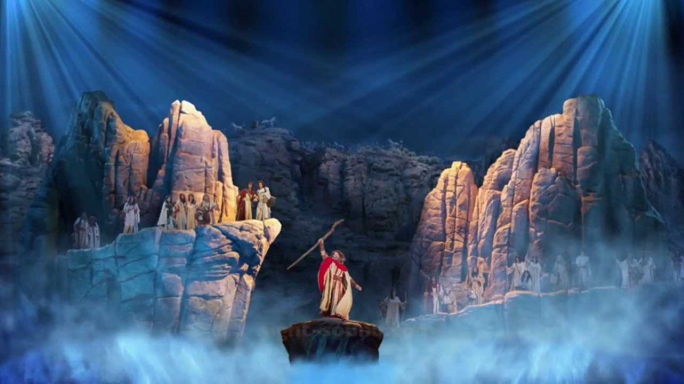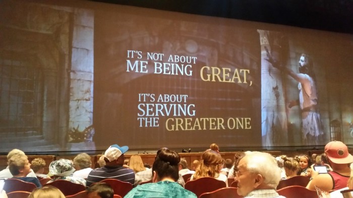 None of these photos show the scenery on the sides of the auditorium or the animals, soldiers, other actors using the aisles as part of the stage and flying in from the air! You also don’t see the non-human actors includes cattle, sheep, goats, dogs, parrots, a rat, a skunk, camels, horses and donkeys. Even though the story of Moses takes place in the Old Testament, Jesus does indeed make an appearance. It’s all amazing!