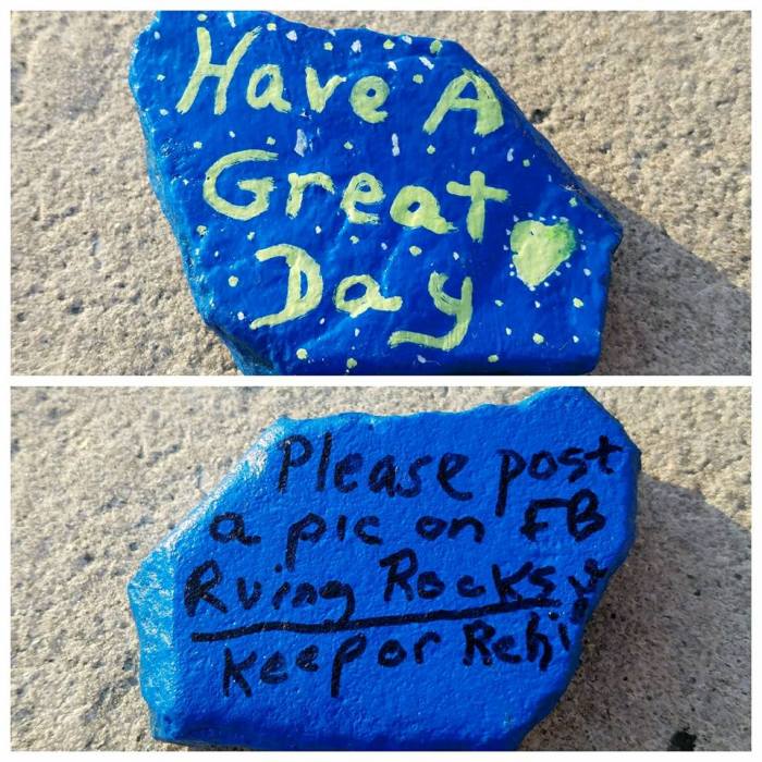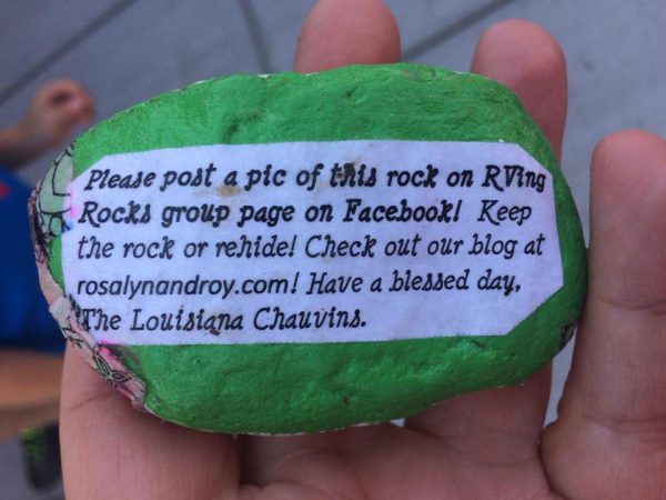 As we were leaving I hid these rocks outside of the museum I’ve started adding a typed note to the bottom of each rock asking them to post a picture of it on RVing Rocks which is a Facebook Group. The second one below was found and the finder posted a picture! It is so neat to see how happy kids are when they find a rock!